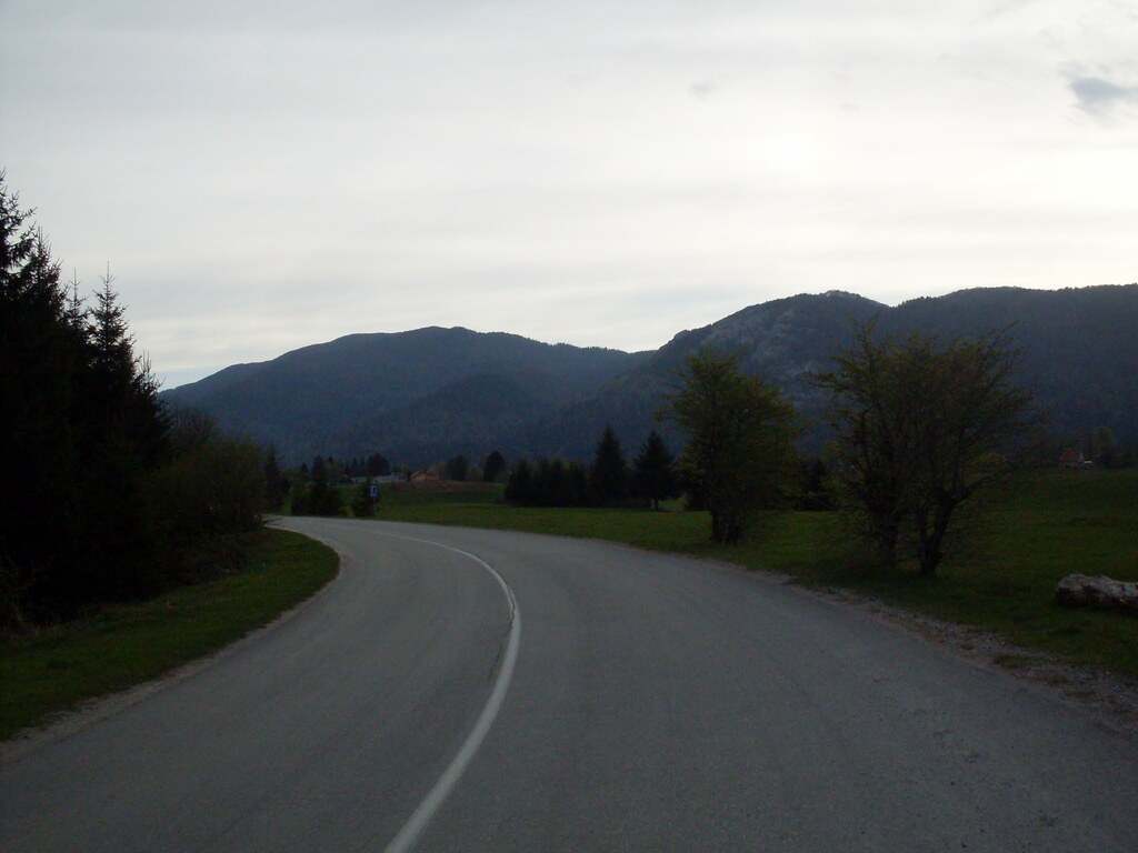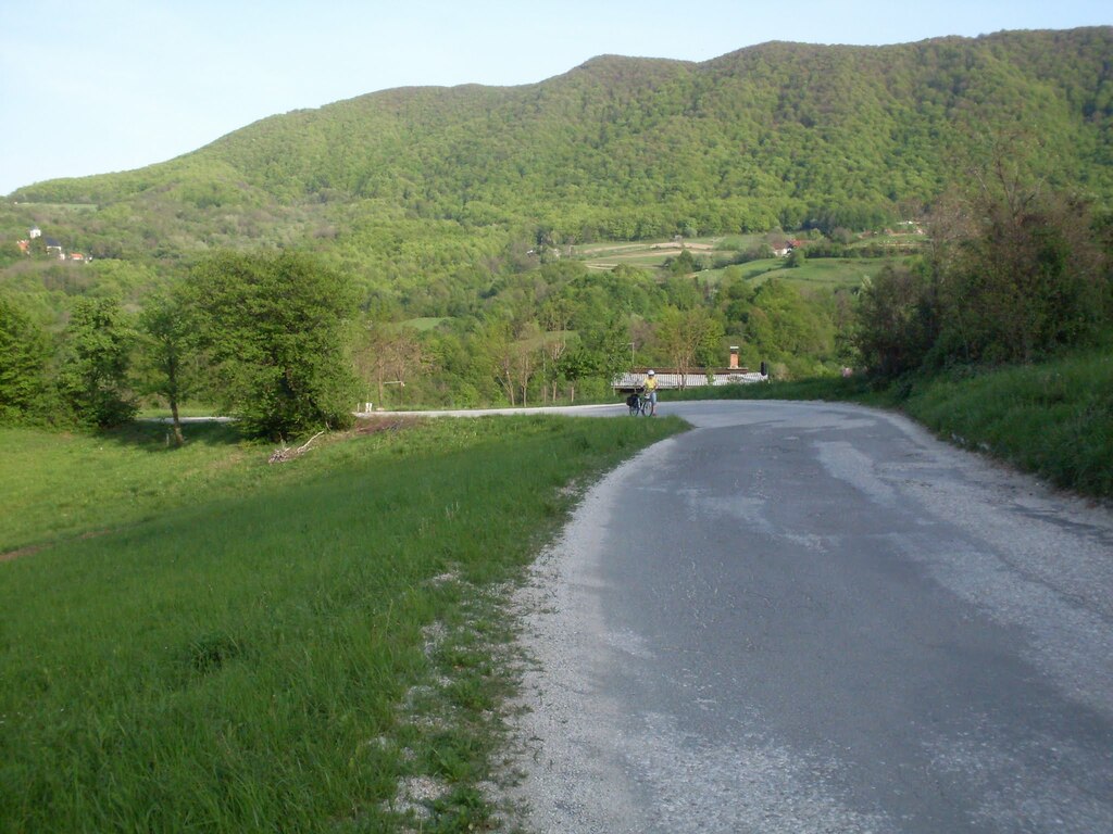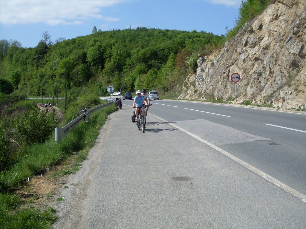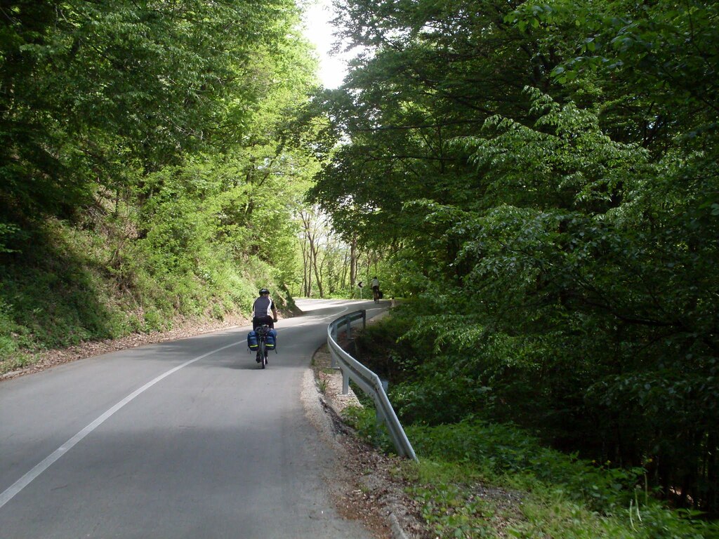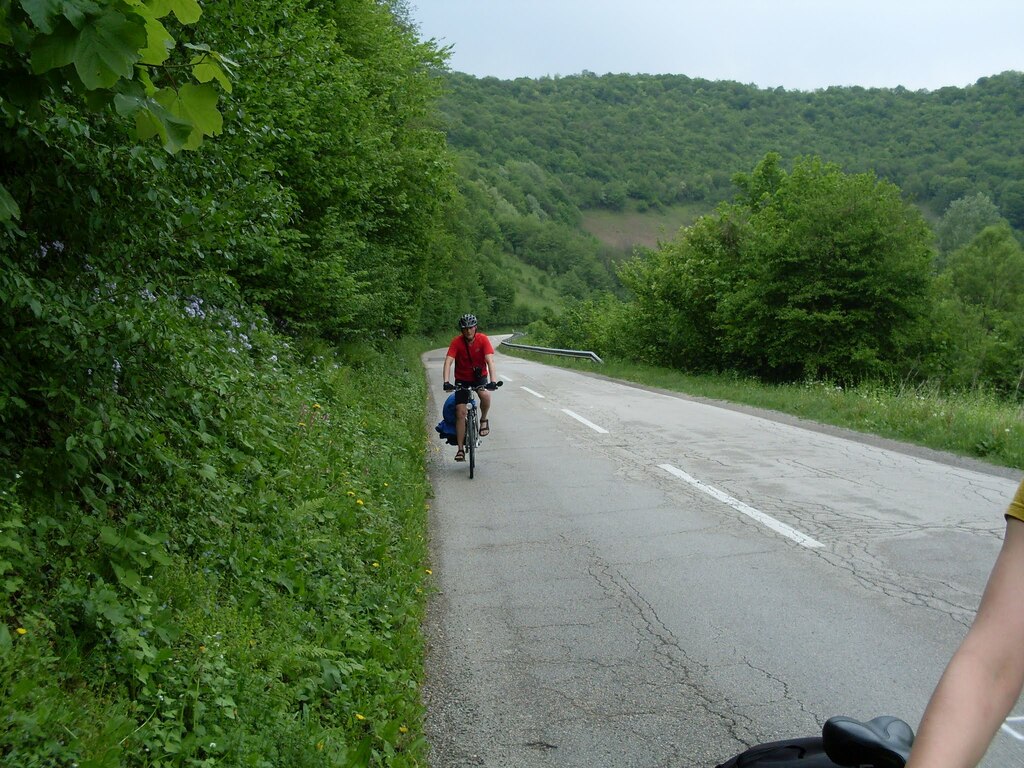 Trochę przykrego błądzenia w pełnym słońcu przez miasto Karlovac, potem ruchliwa droga wyjazdowa z miasta (z podjazdem) i w końcu zjazd na piękną boczną drogę przez wzgórza. W Ogulinie szybki obiad kanapkowy i jedziemy w nieco mniejszej grupie solidny podjazd – teoretycznie trudniejszy niż poranne, ale gdy słońce już tak nie pali (nawet przez chwilę pokapało), to zupełnie inna jazda.