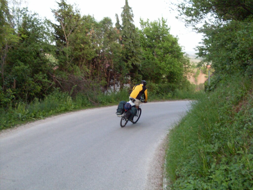 Wyjazd z miasta wieczorem – z lampkami i w kamizelkach, średnio ruchliwą drogą. Jazda do nocy (ok. 22), pod koniec nużąco monotonna – trochę się rozjeżdżamy, tak że dobrze, że nie przegapiliśmy busa, który w międzyczasie znalazł miejscówkę na nocleg. Fajna łączka, koło minaretu, skąd dobiega śpiew w nocy i o 5 rano. Znowu śpię poza namiotem i podoba mi się to (dopiero później przyszło mi do głowy, że na łące mogą być np. żmije).