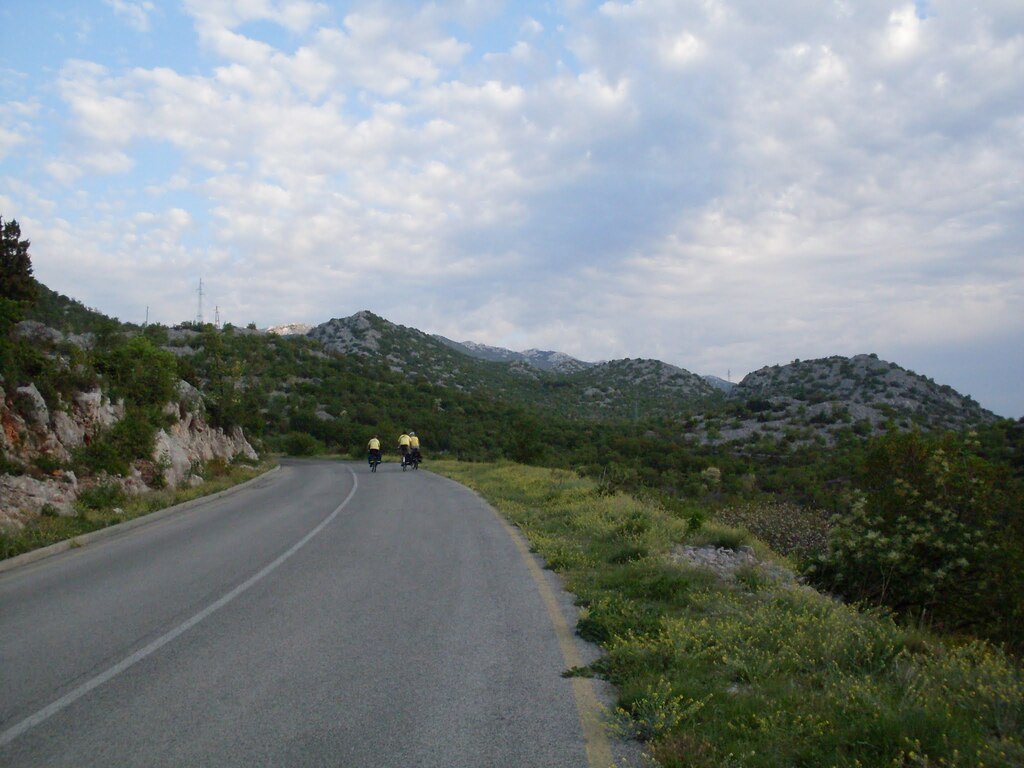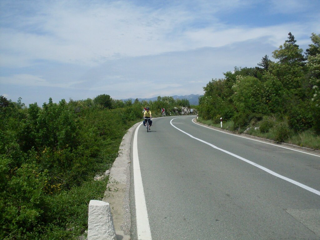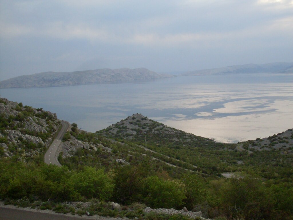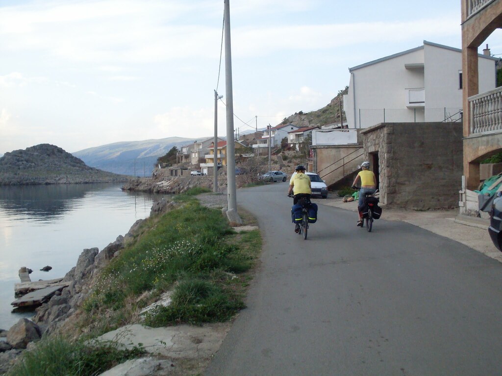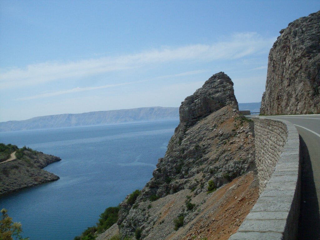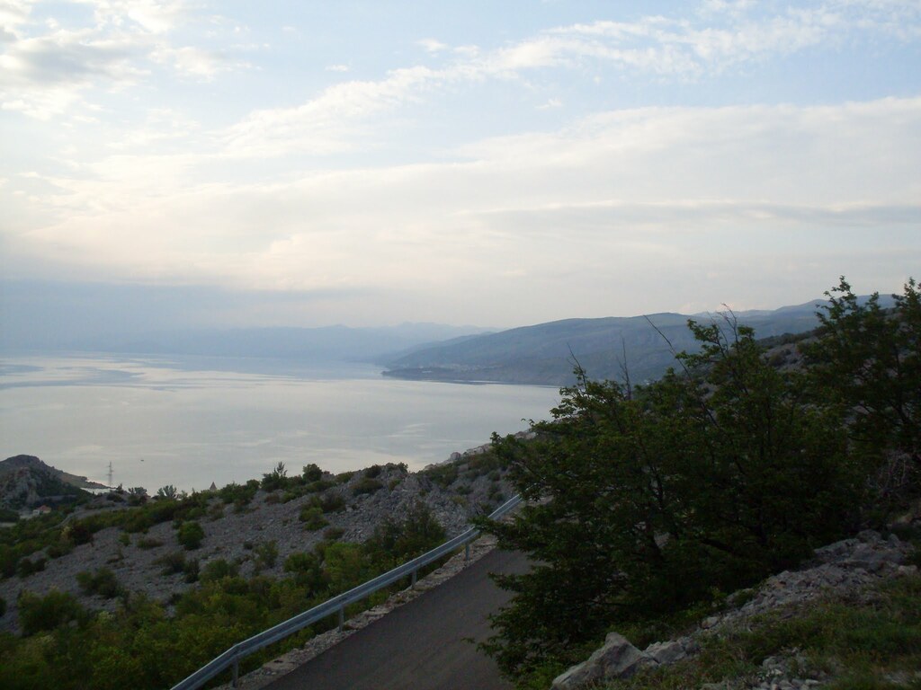 a potem dalej nad morzem – do Sveti Juraj. Choć ciągle patelnia, to droga nieźle się kręci – ładnie tu nad morzem, choć przepaści tuż koło drogi, bez barierek, robią wrażenie. A Sv.Juraj pustki – to małe portowe miasteczko z otwartym jednym sklepem i knajpą portową. Żegnamy się z morzem – już bez kąpieli bo wieczór bez słońca – i w górę.