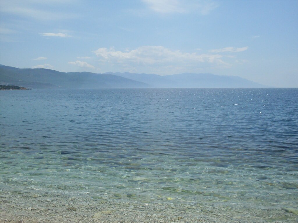 Morze piękne, turkusowe, wspaniałe. Od razu po zjeździe szukamy plaży. Kamienista jak wszystkie tutaj, ale piękna i pusta. 1.5h kąpieli i jedziemy w pełnym słońcu drogą nadmorską – piekarnik okrutny.
