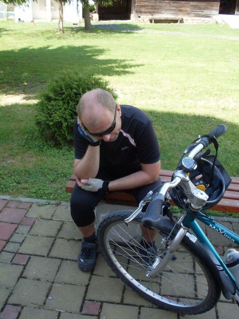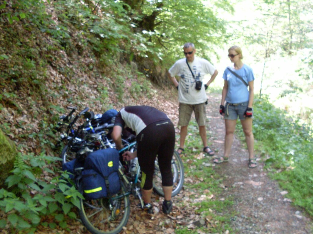 A potem jedziemy 15km „drogą rowerową” przez las. Błoto, kamienie, wyboje, ostry zjazd. Po drodze muszę dokręcać śrubę błotnika a także łapać wyrzuconą z haków sakwę. A tą samą drogą jedzie z nami bus. A jakoś tak Januszowi się upatrzyło…