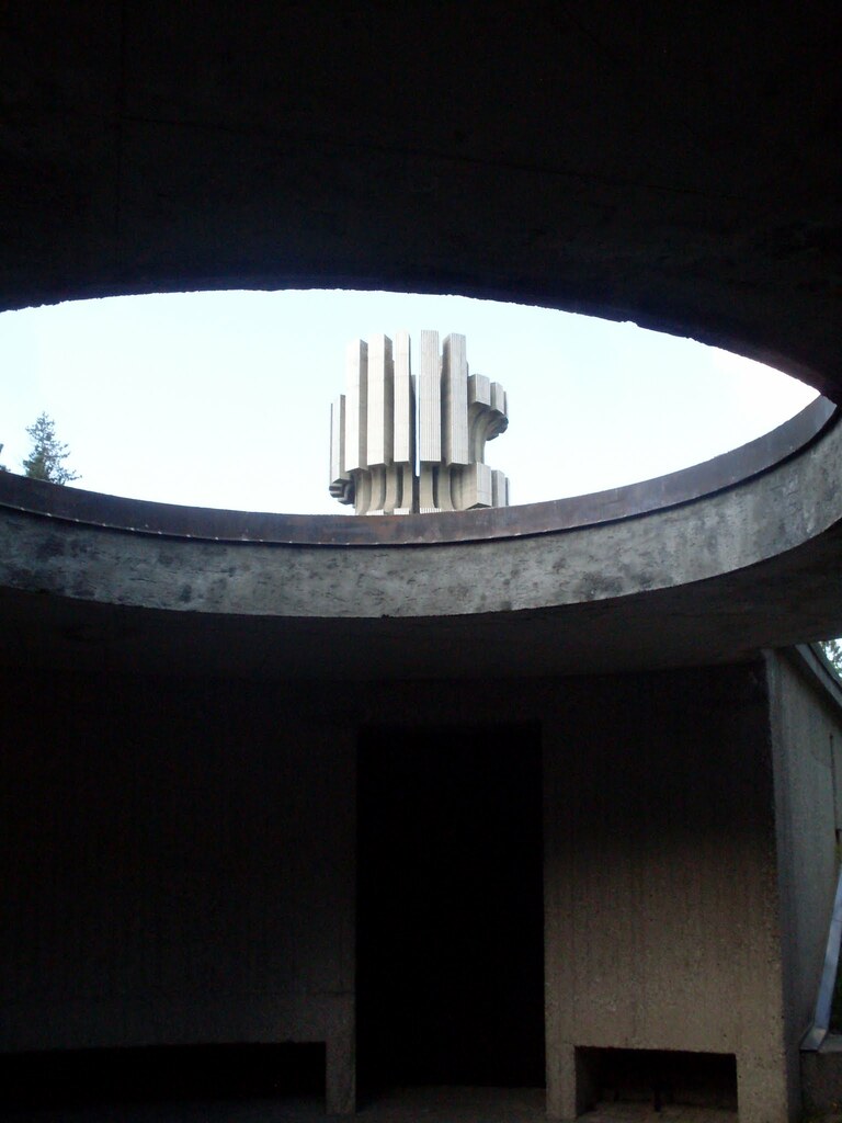 I dalej podjazd, serpentyny coraz wyżej. Gdy stajemy coś zjeść (bułka z żółtym serem i ajwarem smakuje znakomicie) pojawia się bus i już razem wyjeżdżamy do monumentu wystawionego partyzantom przez Titę. Ogromny, teraz zaniedbany, ale wciąż robi dziwne wrażenie.