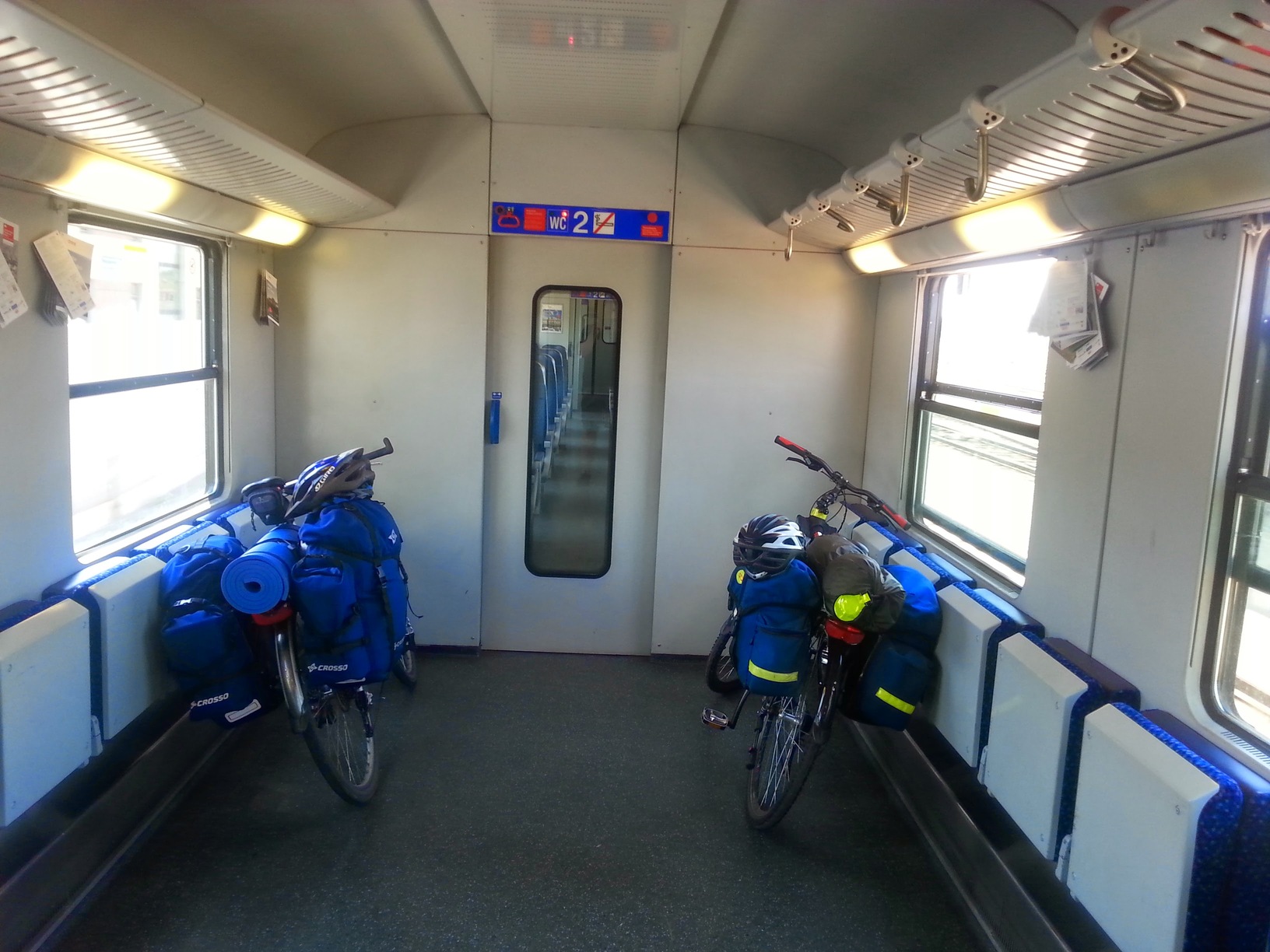 Pakowanie się do pociągu z rowerami na małej stacji jest trudnym doświadczeniem (wysokie stopnie, a czasu za mało by zdejmować sakwy), ale w końcu się wepchaliśmy – jedziemy do Wiednia. W sumie do Passau jedziemy 4 pociągami, przesiadki bywają niepokojąco szybkie, ale wszystko działa dobrze. Nawet kolejarze uprzejmi – przyjmują nasze wytłumaczenie, że z powodu licznych przesiadek wolimy nie ściągać z rowerów bagażu i wieszać rowerów na wieszakach. Tylko komiczna jest kontrola biletów, czyli wydruku z systemu komputerowej rezerwacji: konduktor uważnie patrzy na QR code 🙂