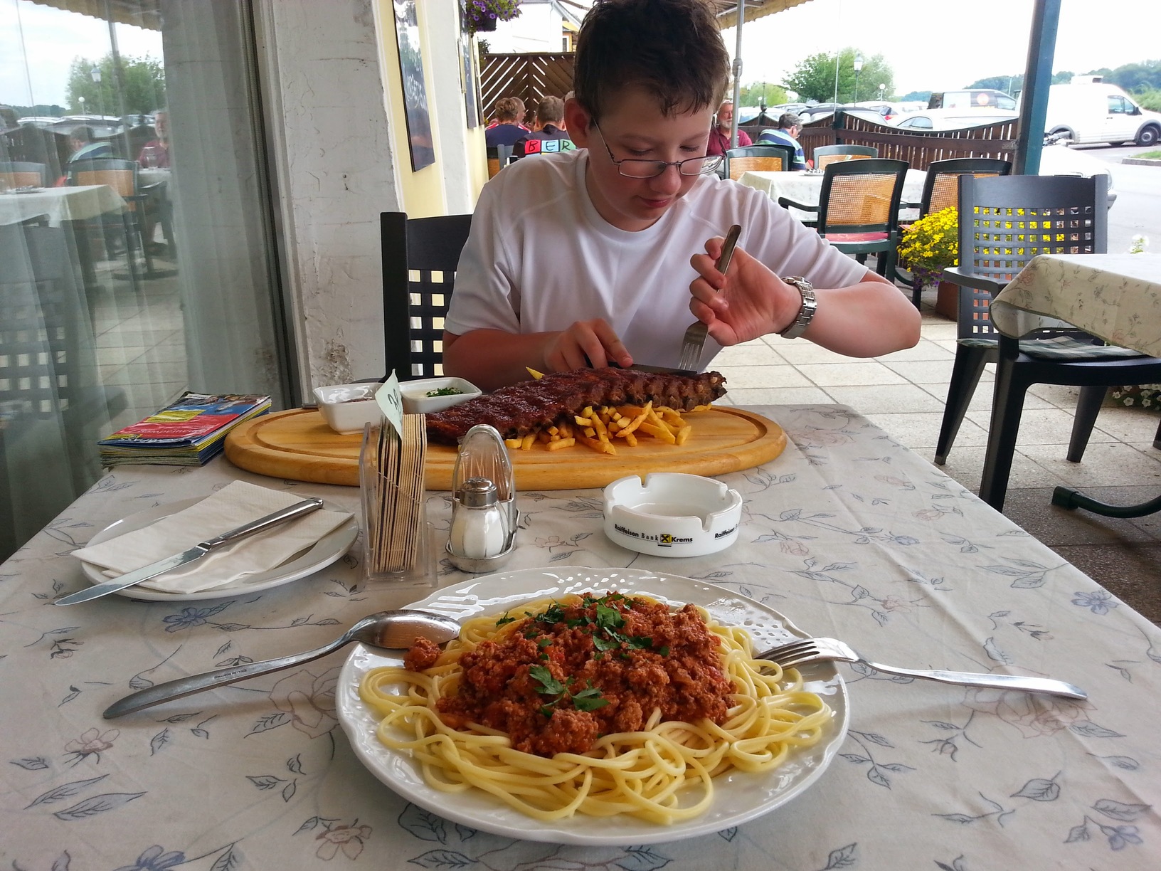 Gdy w południe dojeżdżamy do Krems, to Mateusz marudzi o jedzenie. OK – należy mu się, a że w oko wpada reklama restauracji zapraszającej rowerzystów, to wbijamy tam – siadamy w ogródku pod parasolem i czekamy na obiad. Jest jednak problem: kelnerka tylko po niemiecku. Jest w menu jedna rozpoznawalna pozycja, czyli spagetti bolognese, ale Mateusz chce więcej mięsa. Tylko jak się dogadać? O dziwo udaje się – kelnerka dokonuje cudów gestykulacji (choć prawdę mówiąc dopiero po fakcie odgadliśmy, co miała na myśli głaszcząc się po boku) i dajemy się namówić na „spare ribs” czyli potężną porcję żeberek z frytkami. Czyli dokładnie tego, czego Mateusz do szczęścia potrzebował 🙂