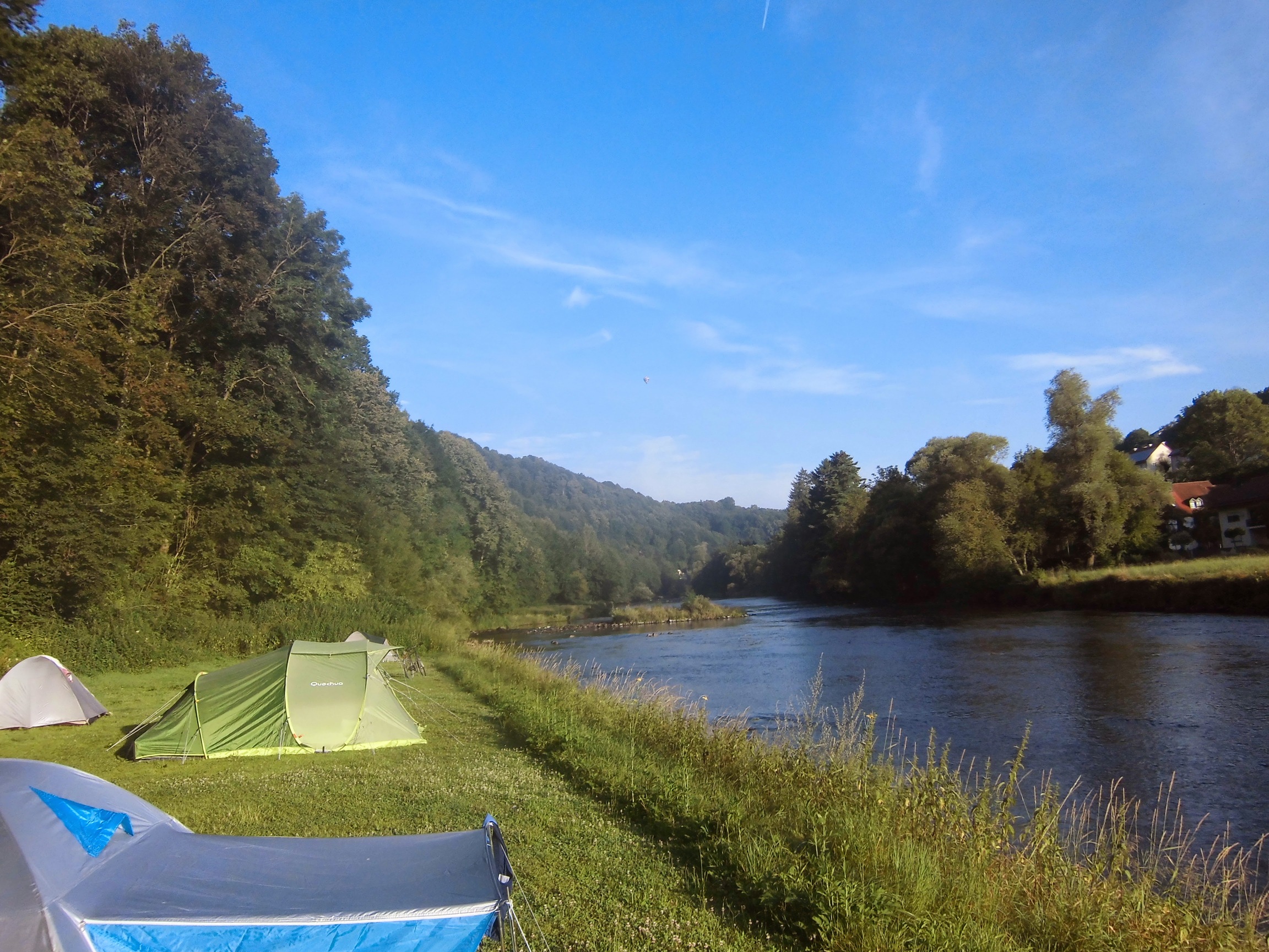 Po drugiej stronie rzeki jest hotel pod górą ze słynnym widokiem na przełom Dunaju, port jachtowy i camping, ale decydujemy się przejechać jeszcze 4km w bardziej kameralne miejsce – do Inzell, gdzie pani w recepcji radzi namiot rozstawiać szybko, tak by zdążyć przed deszczem. Miała rację – ten skwar to był na zmianę pogody: ledwo rozstawiliśmy namiot i coś zjedliśmy w barku, to zaczęło padać.