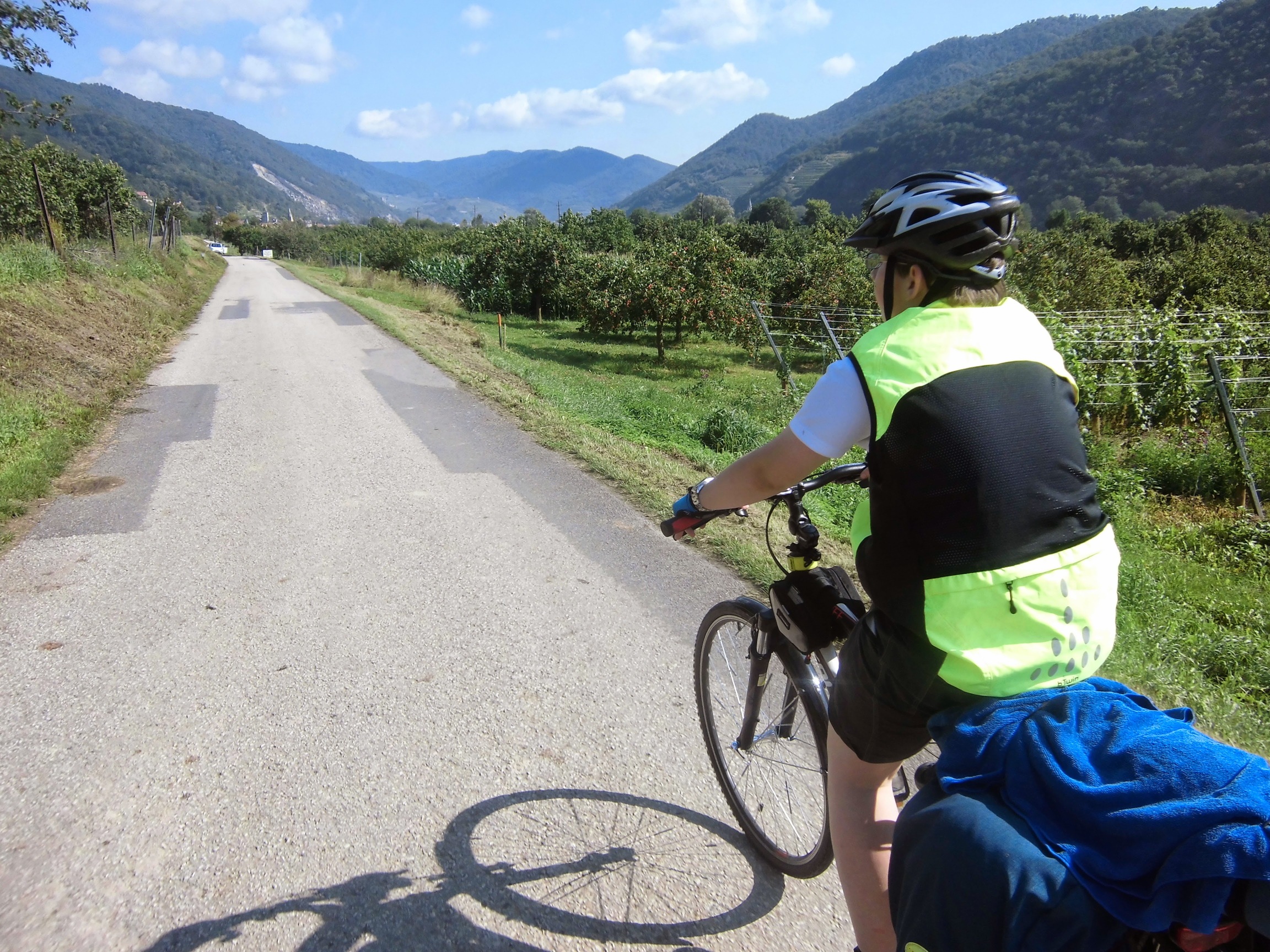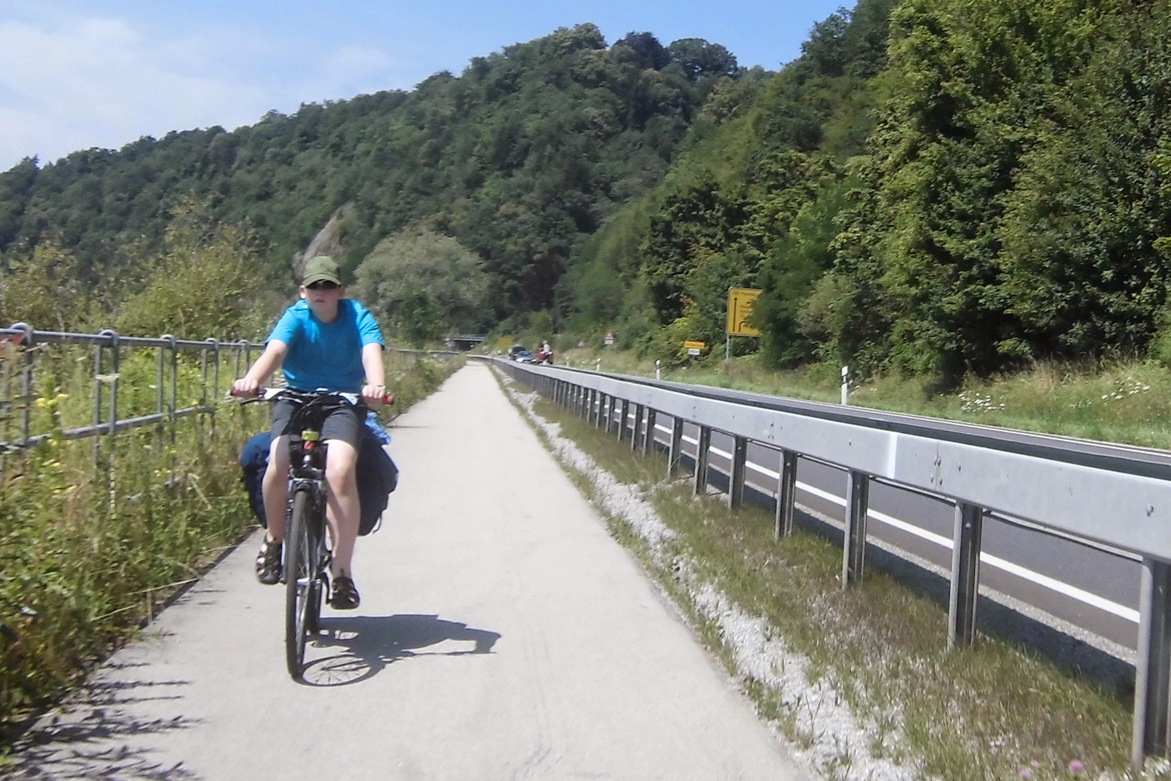 Jest też kawałek nieciekawy – może z 10km, gdzie między zboczem a Dunajem muszą się zmieścić tory kolejowe, droga wielopasmowa i ścieżka rowerowa. Mieszczą się z trudem: ścieżka idzie tuż koło ruchliwej drogi. Ale jest wydzielona, bezpieczna ścieżka – właśnie w tym siła Donauradweg, że szlak rowerowy nie ma tu przerw. Możesz pojechać z dzieckiem bez obaw, że przyjdzie ci jechać ruchliwą drogą – jak to ciągle często w Polsce się zdarza.