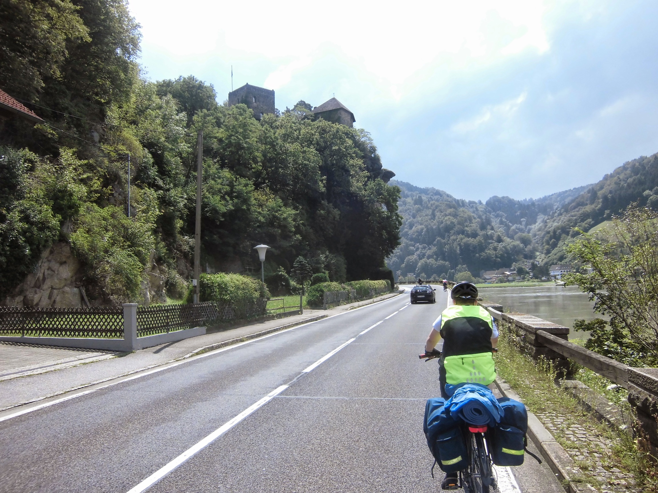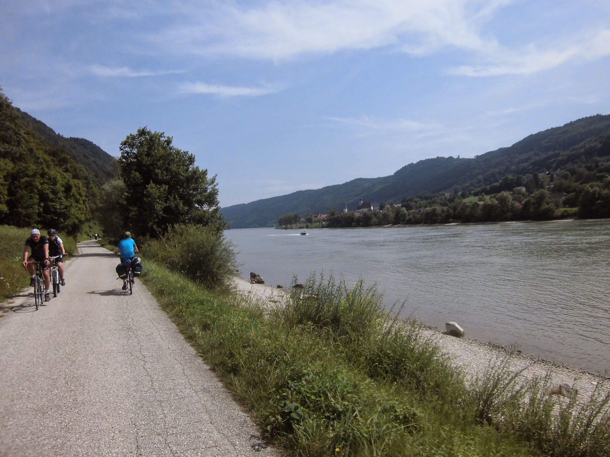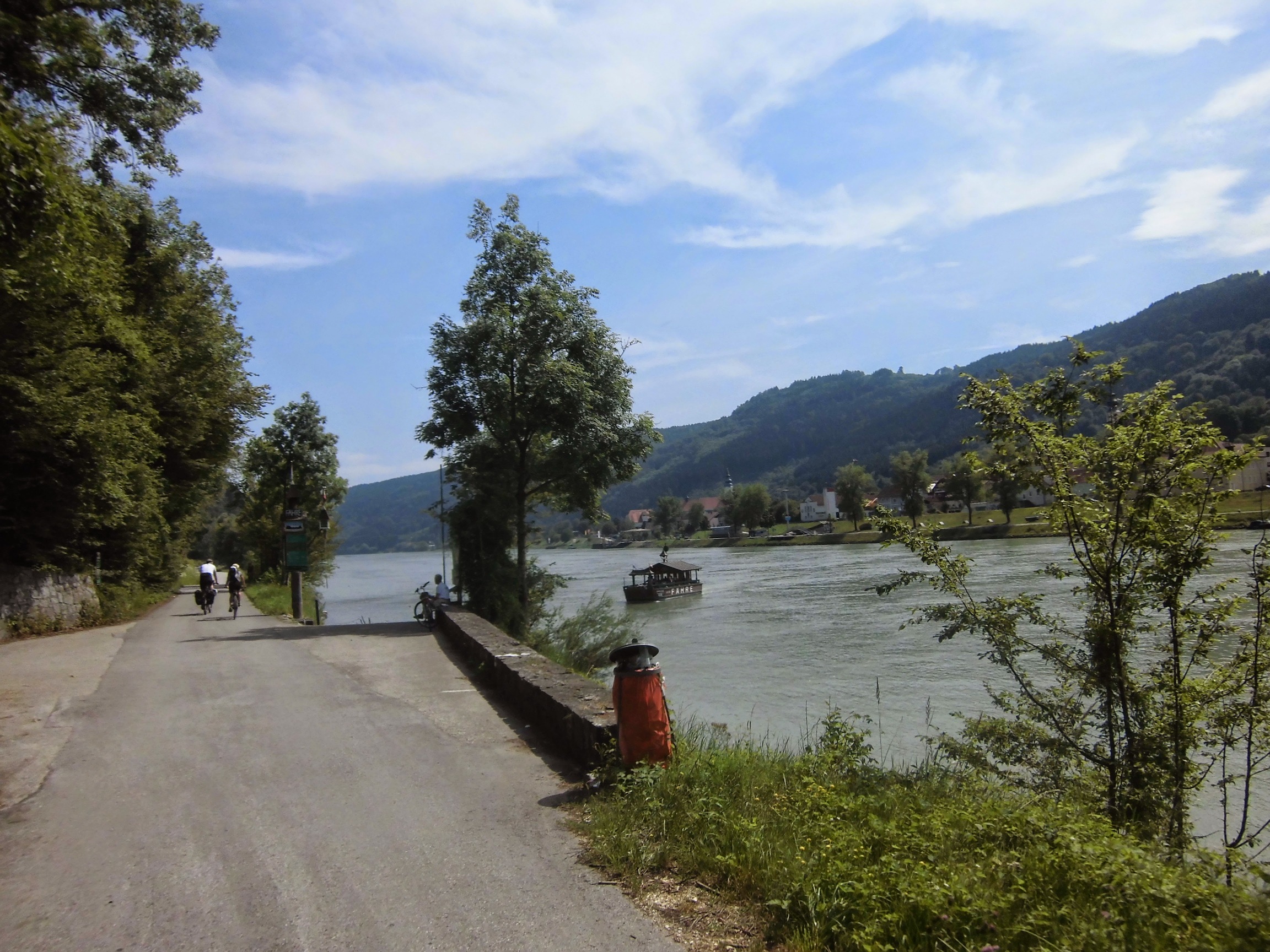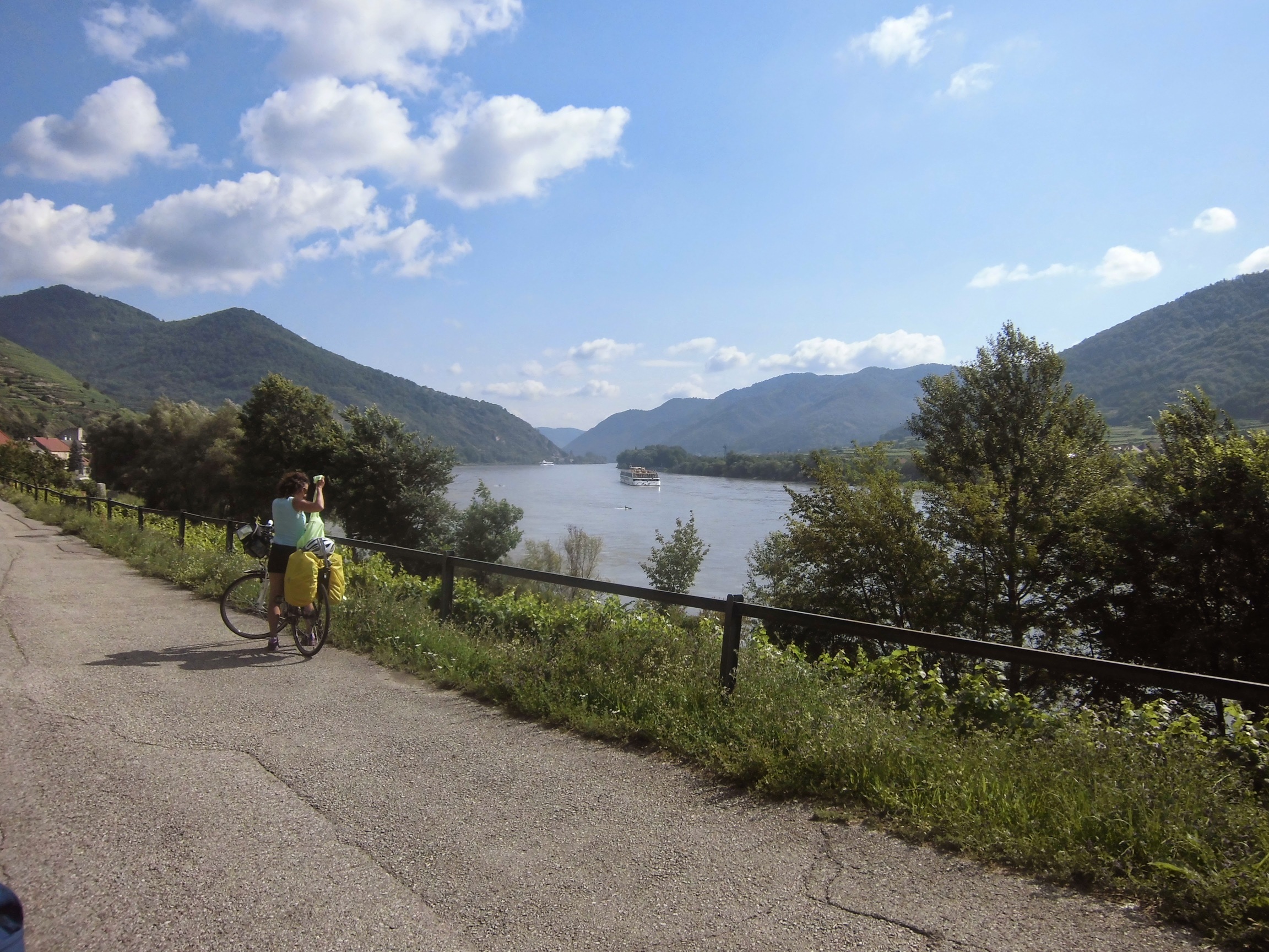 Prognoza pogody przysłana przez Marzenkę mówi o burzach po południu, więc staramy się ruszyć wcześniej: pobudka 6:30, ruszamy 9:10. Droga nad Dunajem tutaj prześliczna – niby monotonna, ale nie dłuży się. To jazda przez góry (las, zbocza, skały), ale bez podjazdów i w towarzystwie ogromnej rzeki, po której pływają statki.