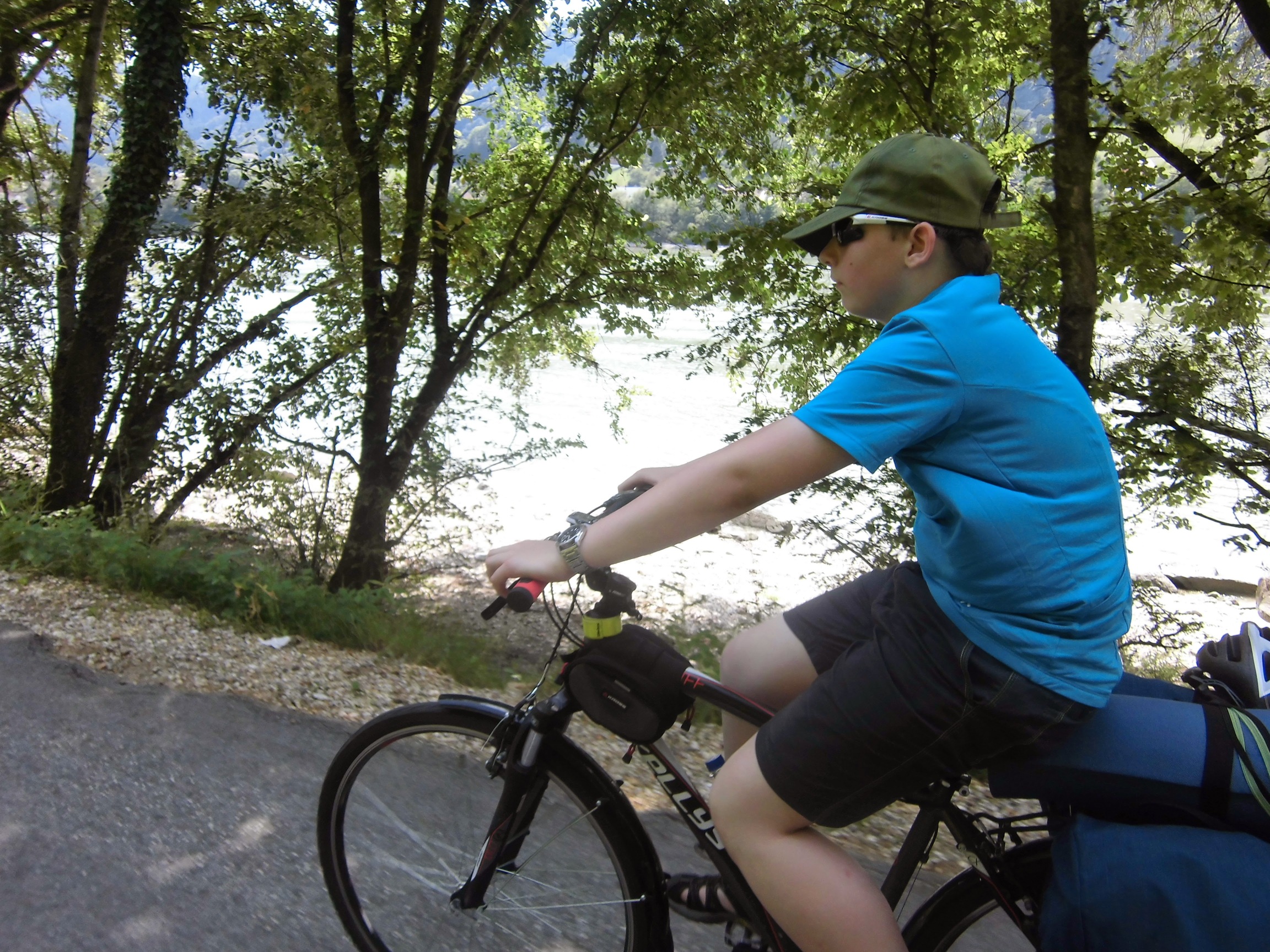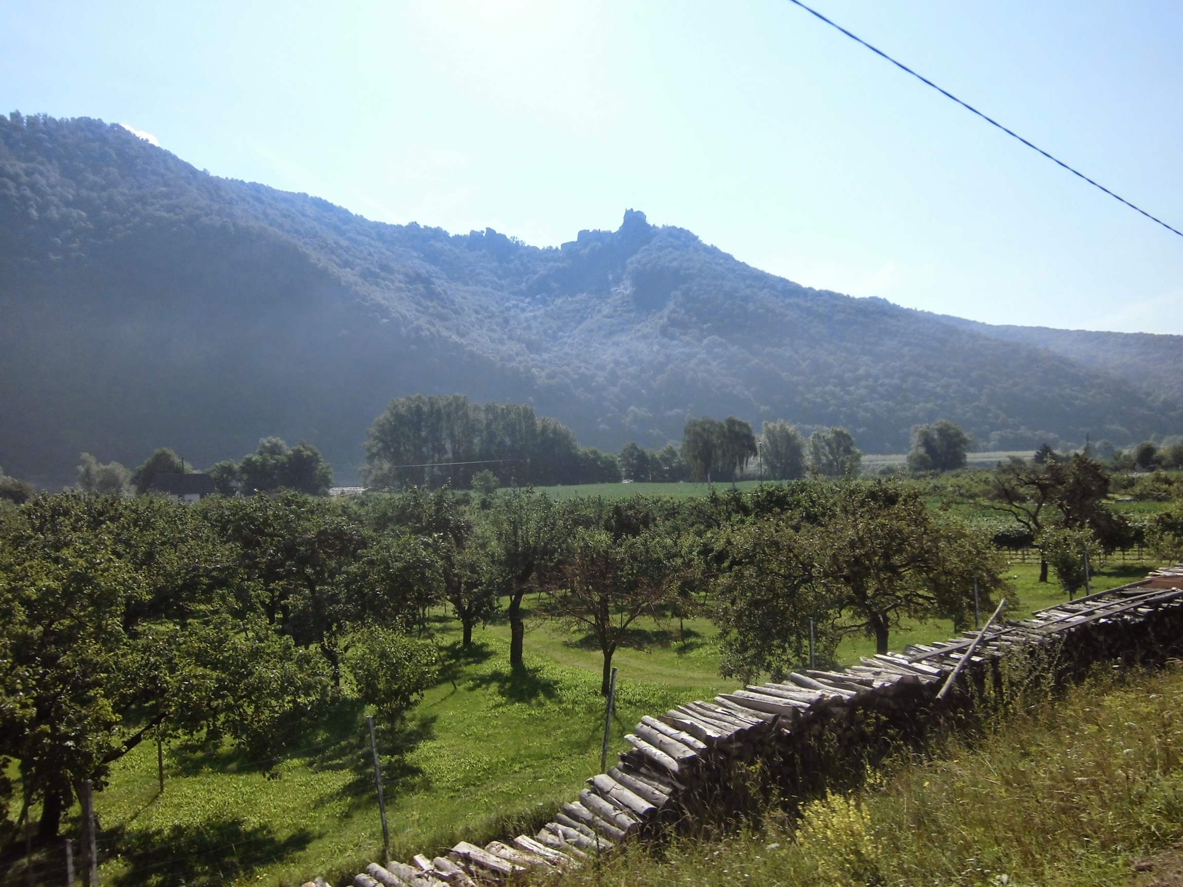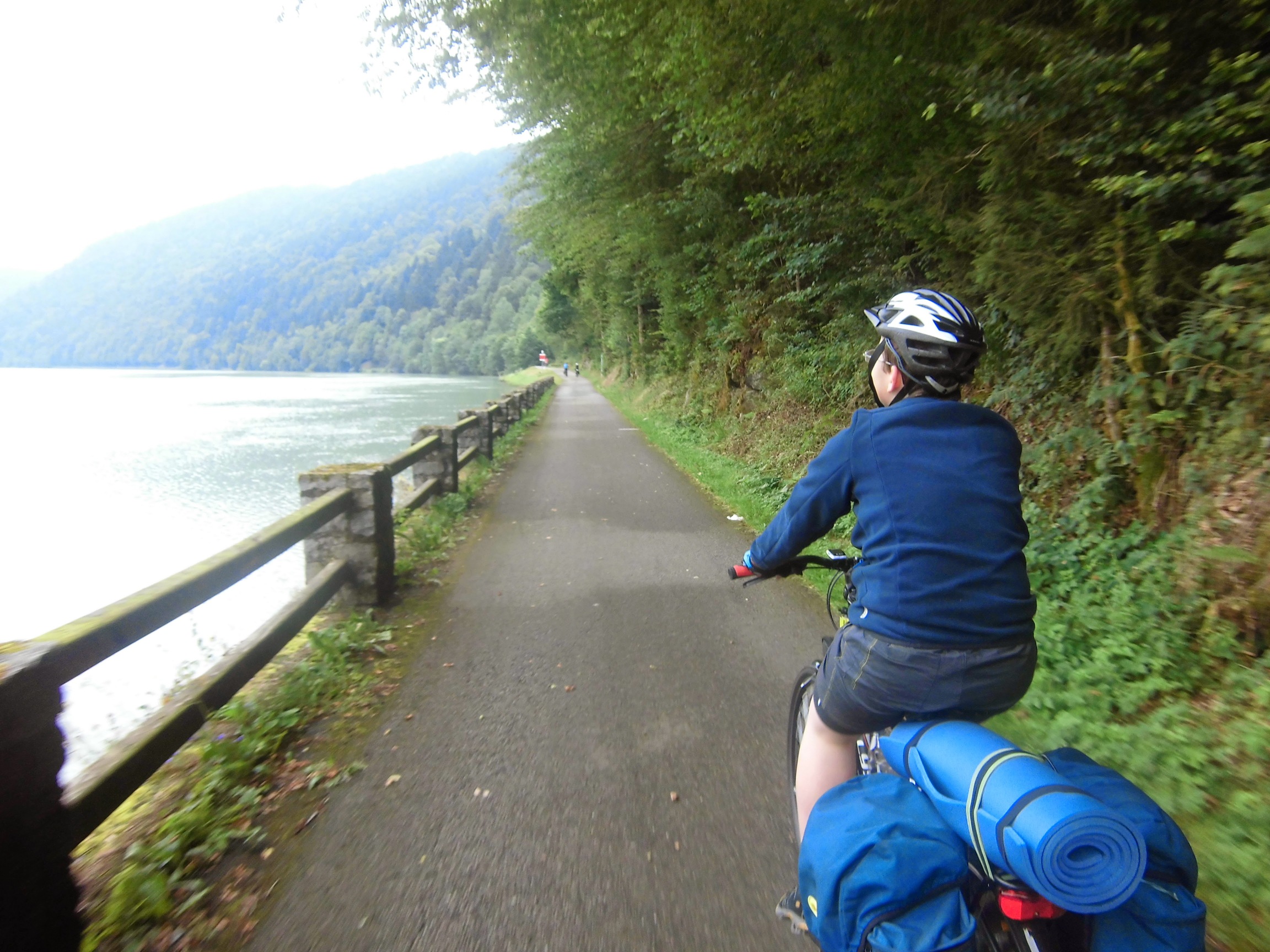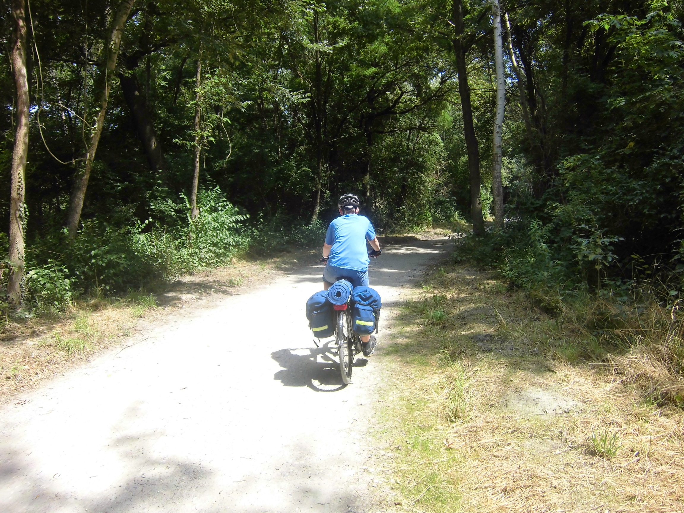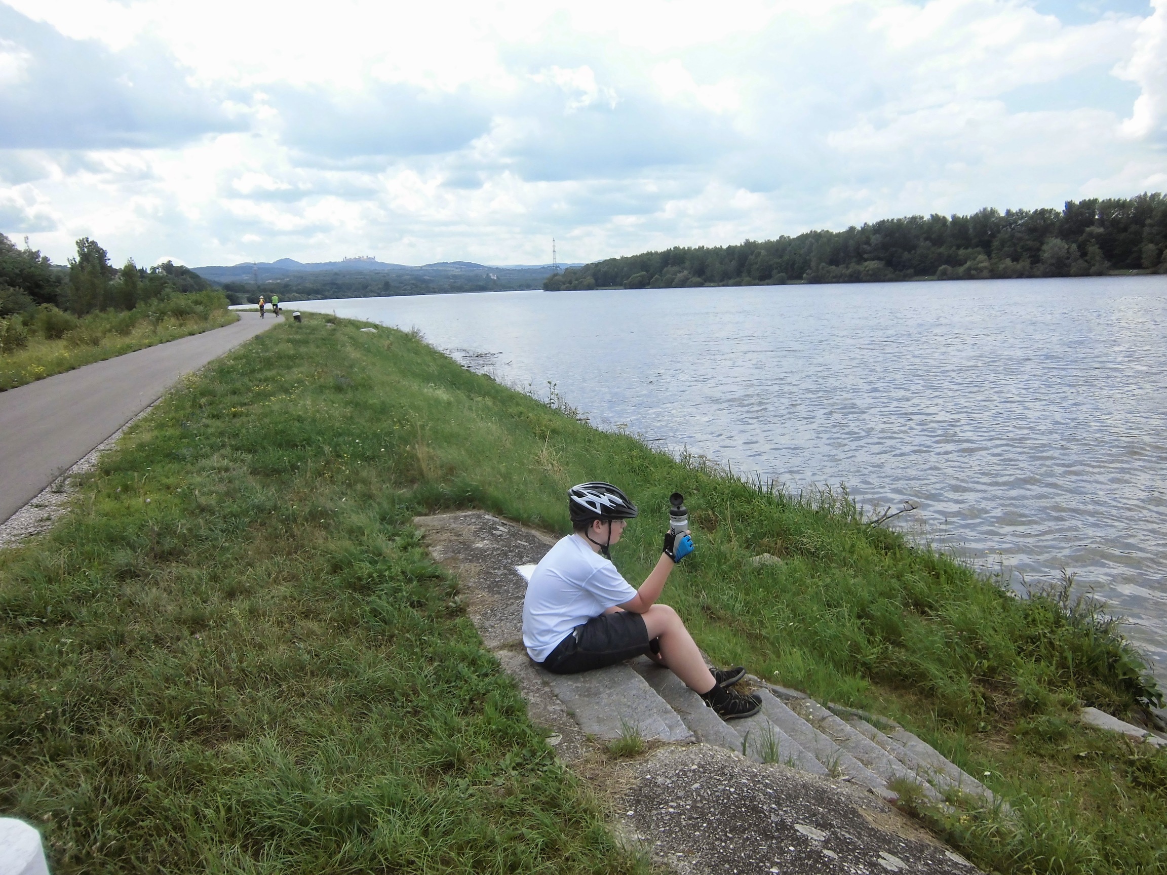 Prognoza pogody przysłana przez Marzenkę mówi o burzach po południu, więc staramy się ruszyć wcześniej: pobudka 6:30, ruszamy 9:10. Droga nad Dunajem tutaj prześliczna – niby monotonna, ale nie dłuży się. To jazda przez góry (las, zbocza, skały), ale bez podjazdów i w towarzystwie ogromnej rzeki, po której pływają statki.