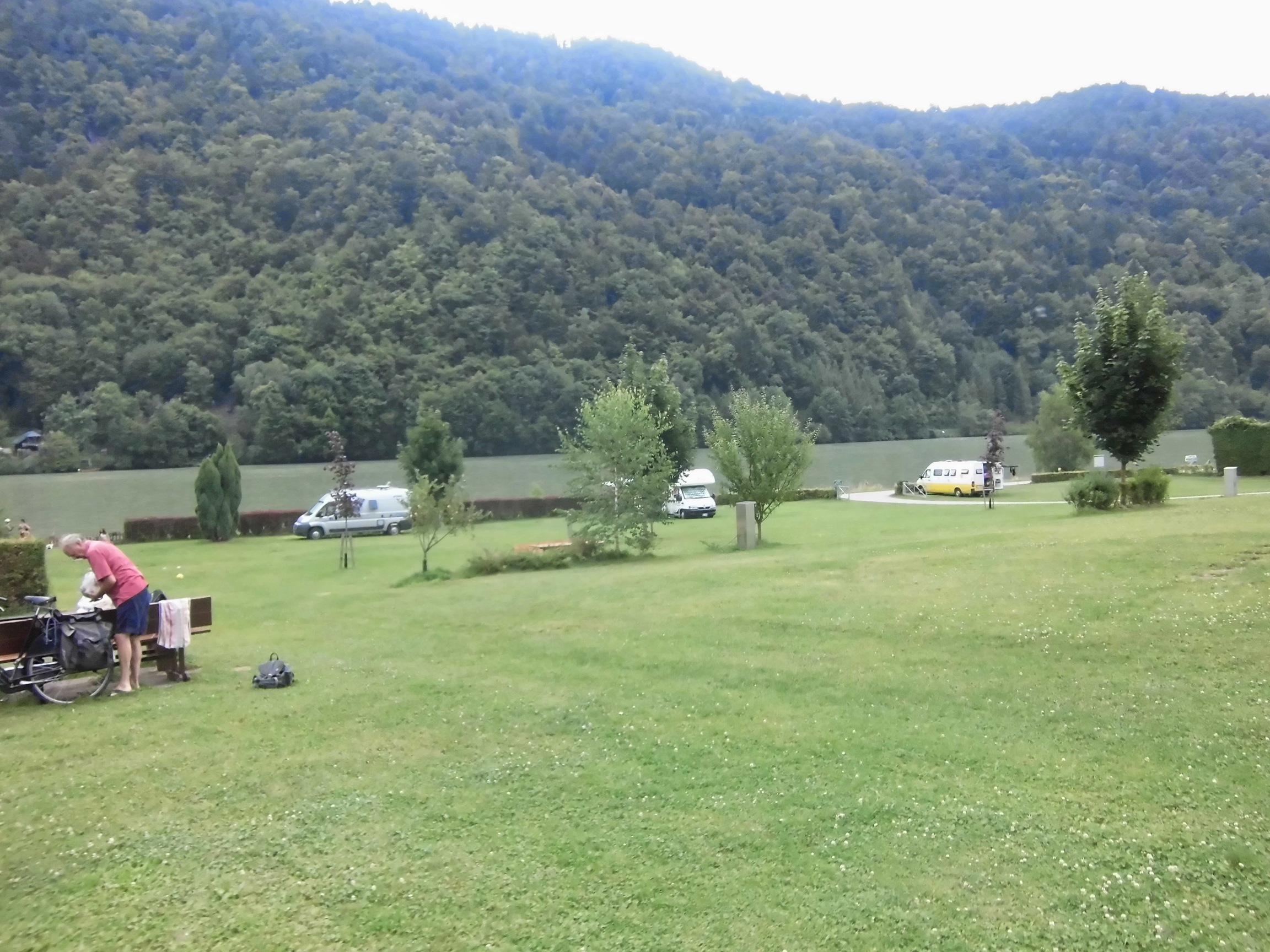 Dojeżdżamy do Au bez deszczu, więc chwilę się zastanawiamy czy nie skorzystać z pogody i nie pojechać jeszcze trochę, ale na campingu jest tak miło że zostajemy. Rozbijanie mokrego namiotu, kolacja, przepierka (ja właśnie wziąłem ostatnią koszulkę, więc korzystam z możliwości prania, choć nie wiem jak je wysuszę) i rozmowa z Marzenką. Dziś 38km.