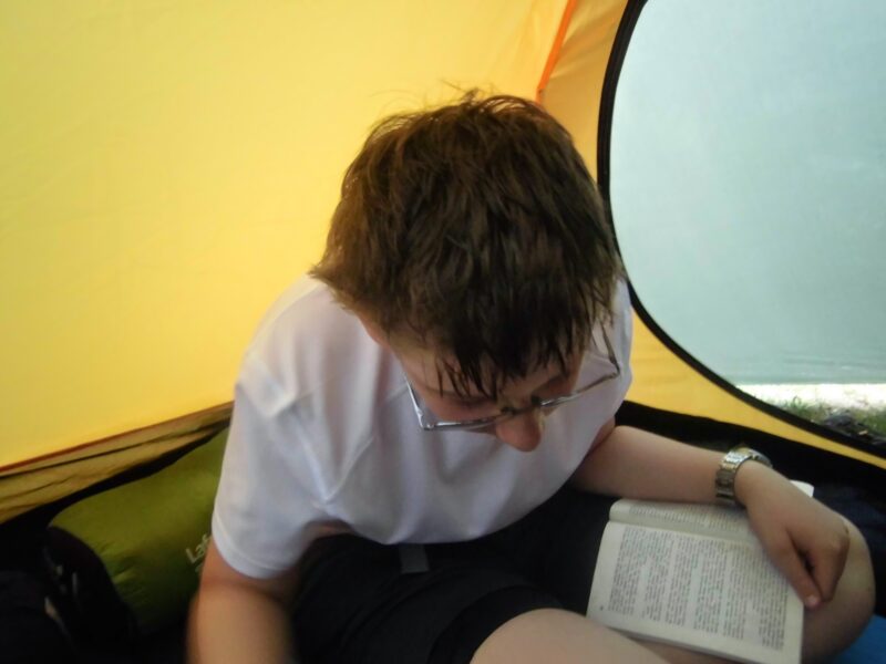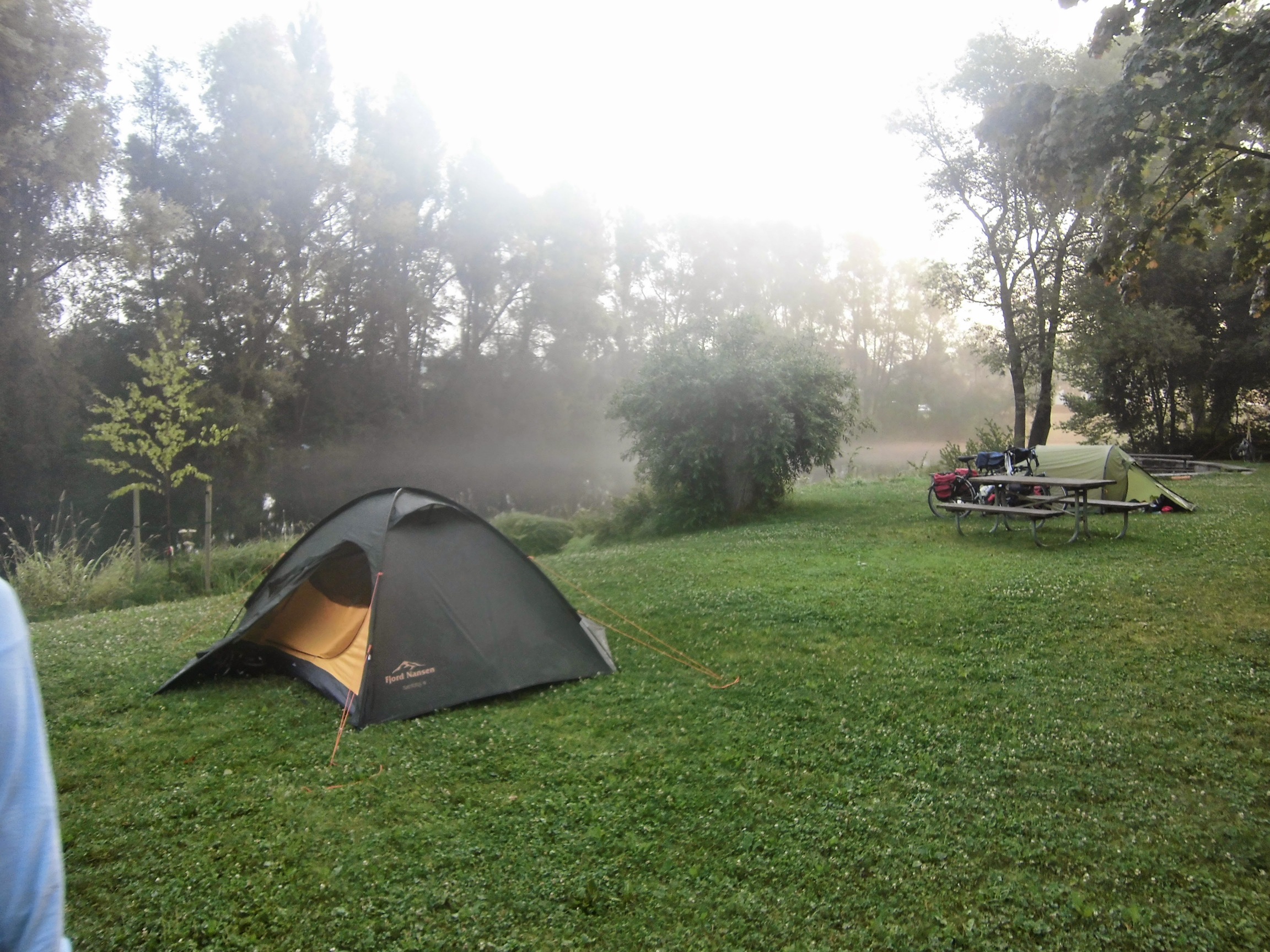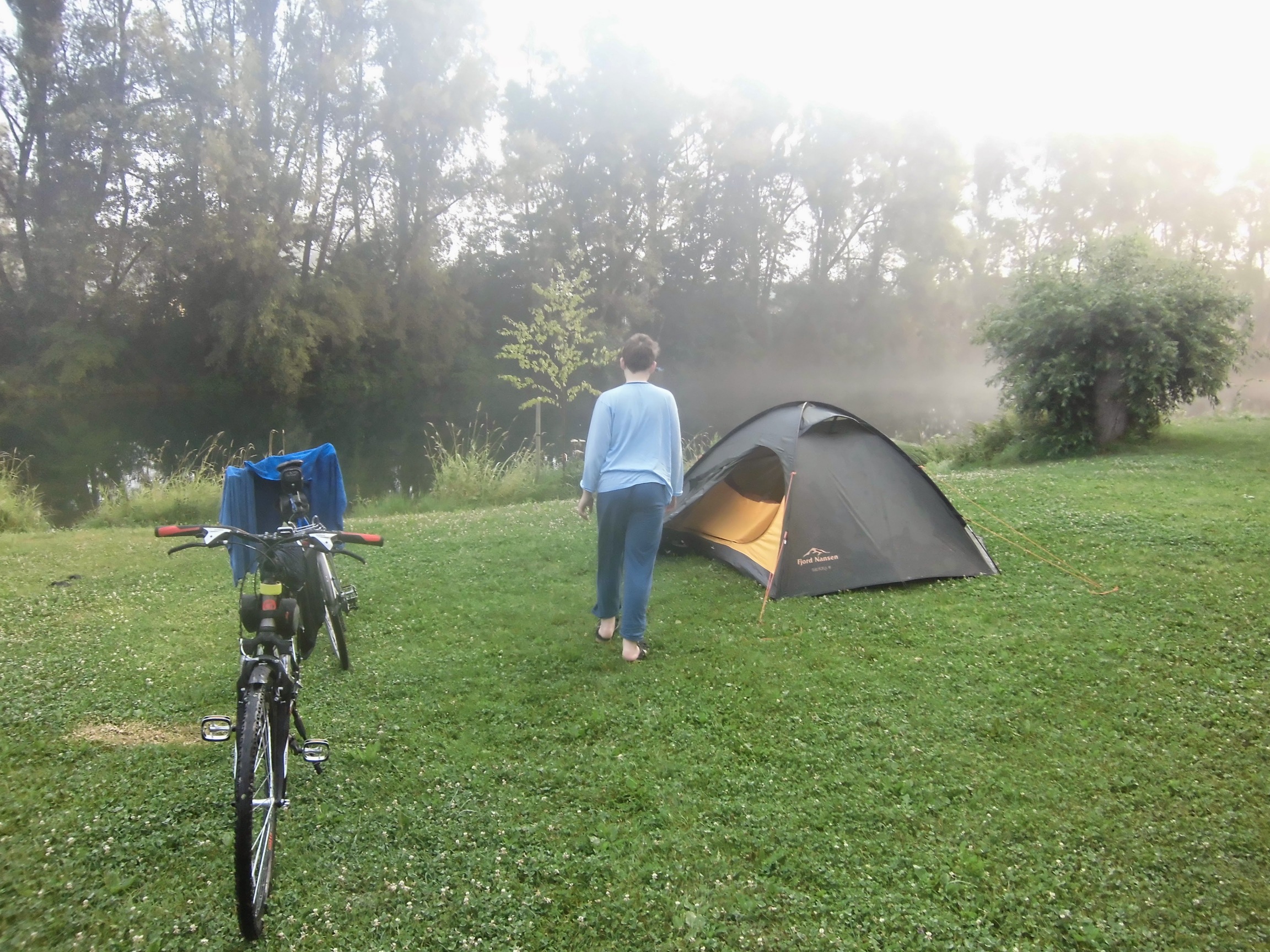 Powolna pobudka, namiot wysycha, Mateusz zadowolony, Wyjeżdżamy 9:30.