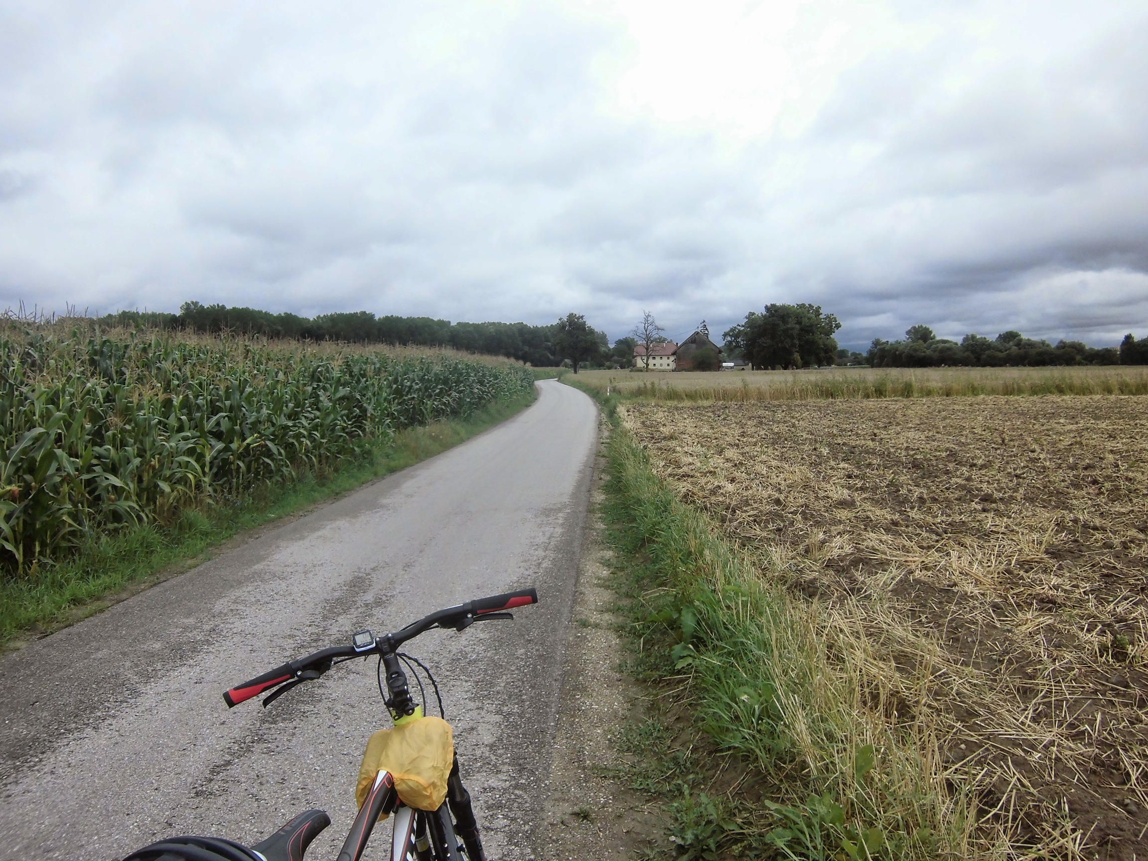 Gdy jedziemy przez pola łapie nas ulewa – krótka, ale intensywna. Przebieranie się w spodnie przeciwdeszczowe trwa tyle, że zdąży się zmoknąć w międzyczasie. Takich krótkich deszczy było jeszcze kilka – przebieranie się co chwila byłoby bez sensu – już lepiej po prostu jechać w krótkich spodniach, a gdy jest okazja – przeczekać (np. pod okapem garażu przy drodze).