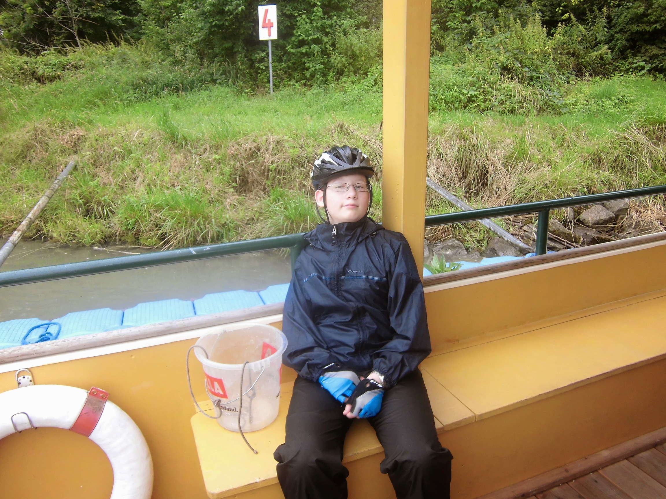 A potem ubieramy się w co mamy (szkoda że nie zabrałem do plecaka spodni ortalionowych dla Mateusza) i wracamy w deszczu na camping. Zastanawiamy się czy nie zostać, ale o dziwo Mateusz bardzo chce wyjechać już z Linzu. No to się zbieramy: sakwy już rano spakowane, więc wystarczy namiot złożyć. W deszczu, mokry. My też mokrzy – jedziemy w deszcz.