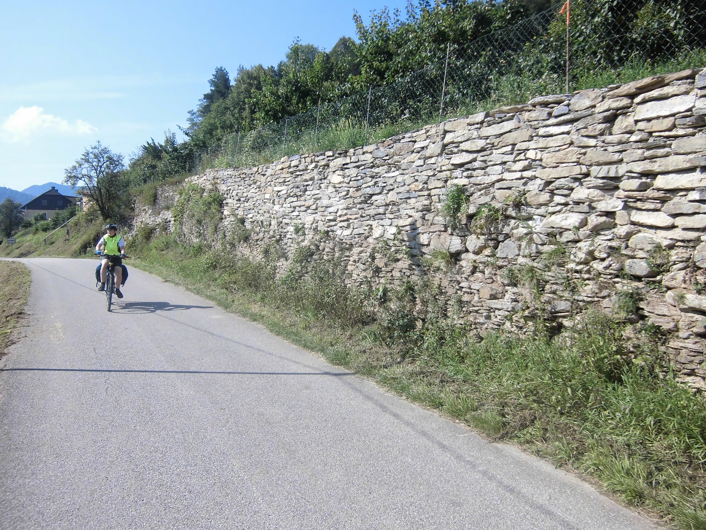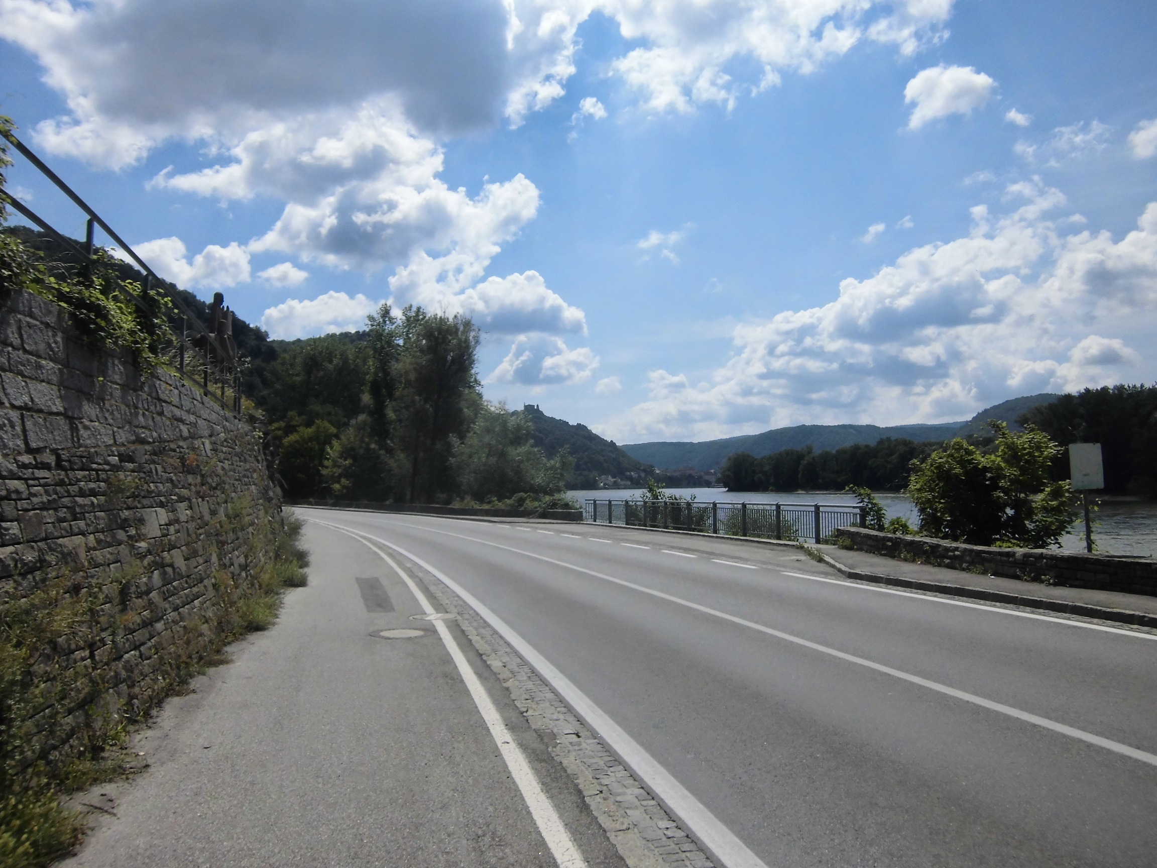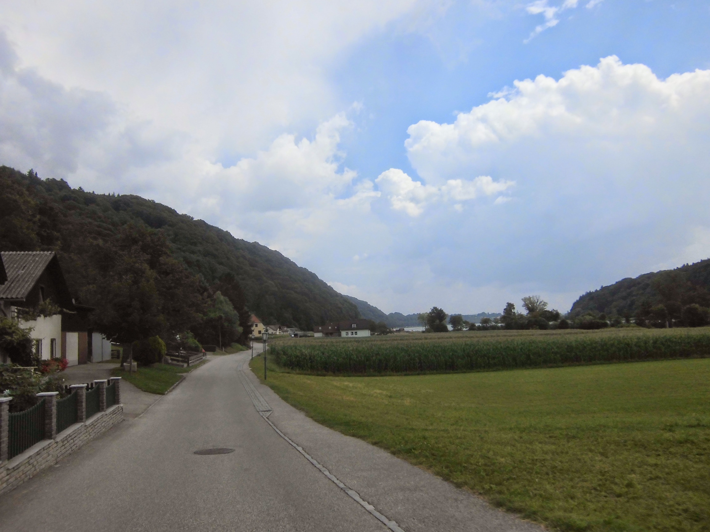Za Grein niespodzianka wynikająca z odbicia z głównego szlaku – będzie fragment bez ścieżki rowerowej. Początkowo można chodnikiem, ale potem trzeba po prostu drogą. W sumie można było się wrócić do mostu w Grein, ale ruchu nie ma wielkiego, a droga wydaje się ładna. Niemniej trochę stresu mam – w końcu chciałem dzięki Donauradweg uniknąć jazdy drogami. Szczęściem to tylko 7km.