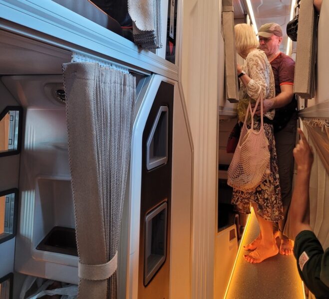 Leżanki są zadziwiająco wygodne (choć nieco za krótkie), doskwiera za to brak toalety i to, że kierowca nie chce się zatrzymywać (kiepskie drogi nie dają szans na nadgonienie). Ale w końcu daje się przekonać 😖