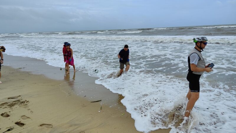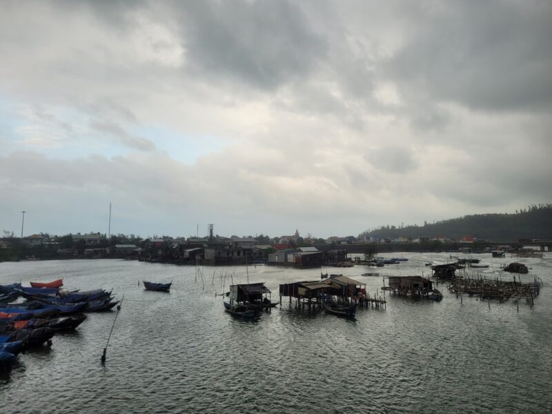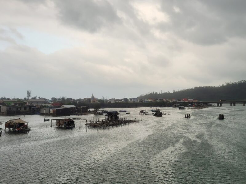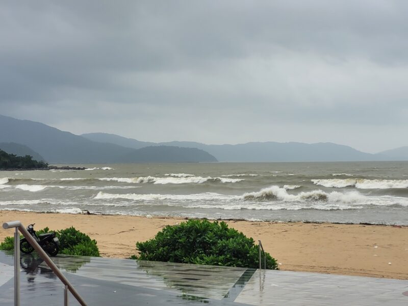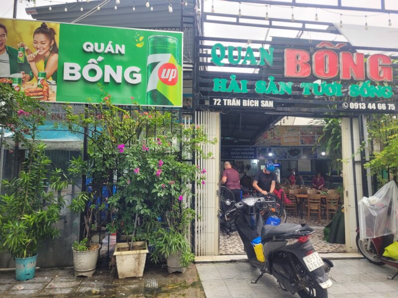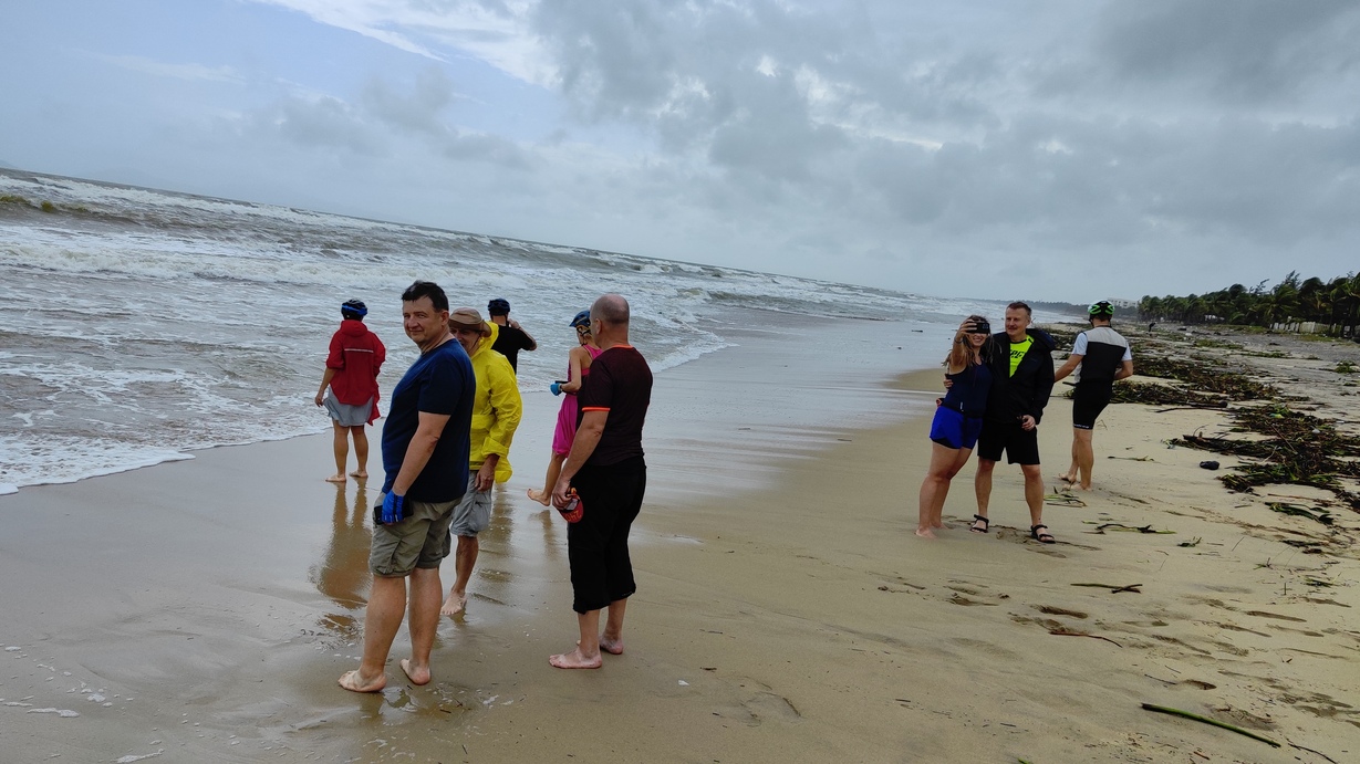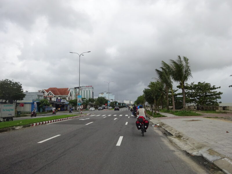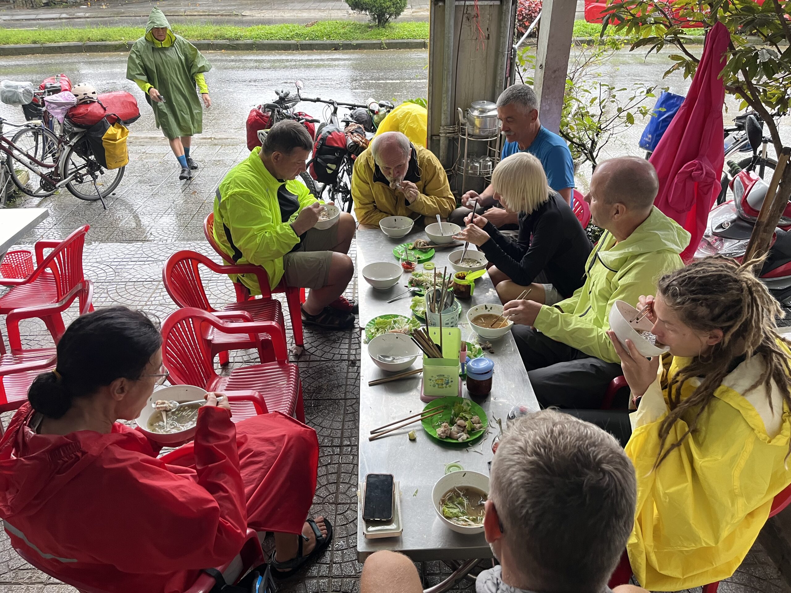 Jednak gdy wstępujemy na obiad, do knajpki z owocami morza na przedmieściach Da Nang, to zaczyna lać solidnie. Knajpka miła, fajnie się w niej siedzi patrząc na deszcz, tak że nie bardzo się chce z niej wychodzić, zwłaszcza, że usłużny Google podpowiada, że po drodze mogą być zalania przez powódź, a do tego na drodze są tunele, być może z zakazem jazdy rowerem.