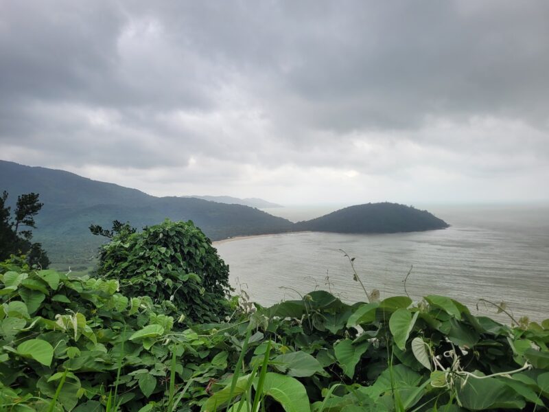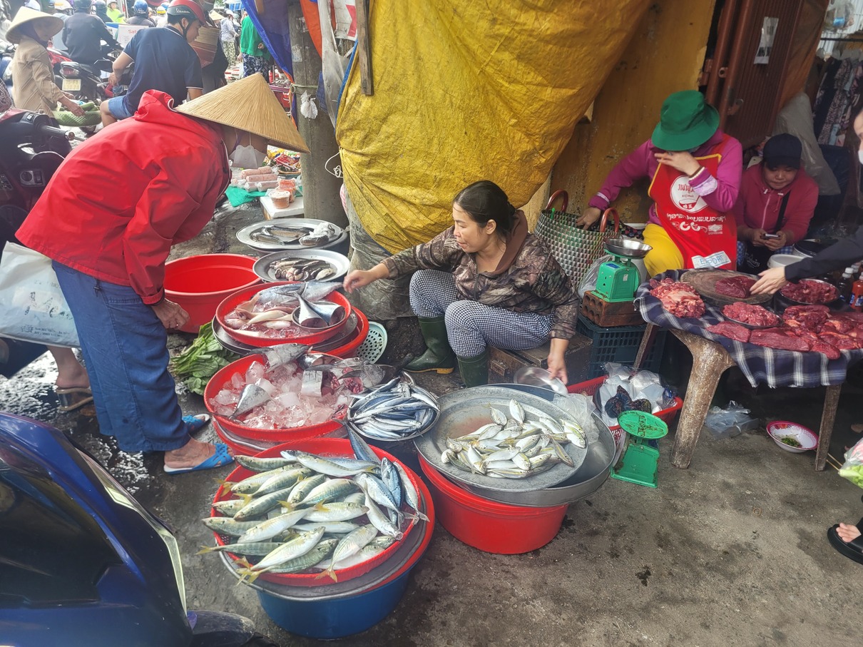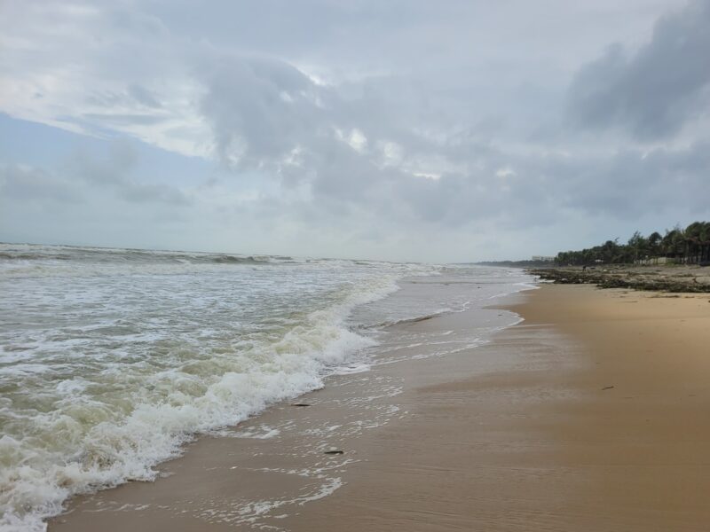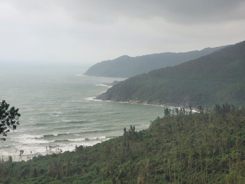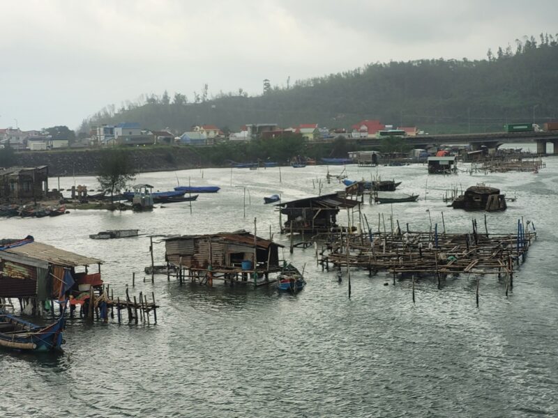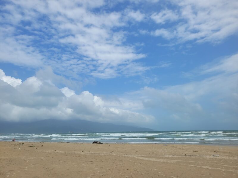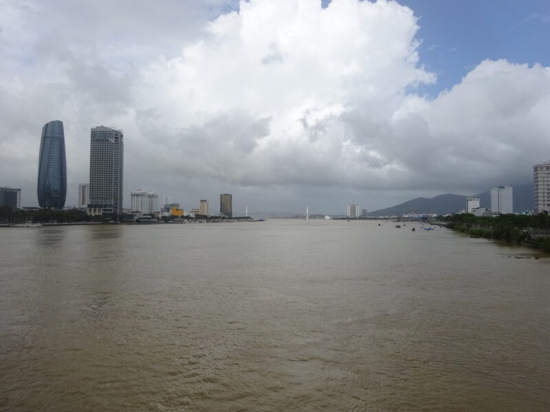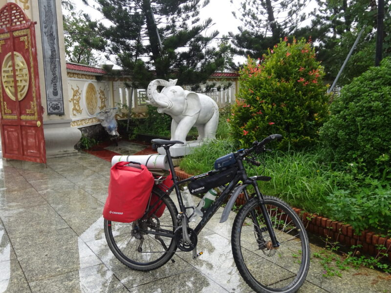 Jednak gdy wstępujemy na obiad, do knajpki z owocami morza na przedmieściach Da Nang, to zaczyna lać solidnie. Knajpka miła, fajnie się w niej siedzi patrząc na deszcz, tak że nie bardzo się chce z niej wychodzić, zwłaszcza, że usłużny Google podpowiada, że po drodze mogą być zalania przez powódź, a do tego na drodze są tunele, być może z zakazem jazdy rowerem.