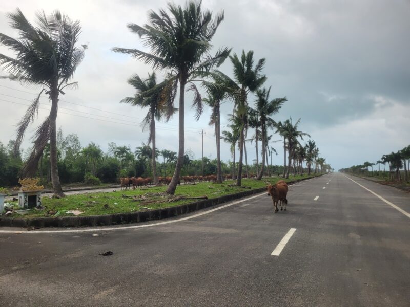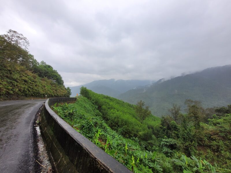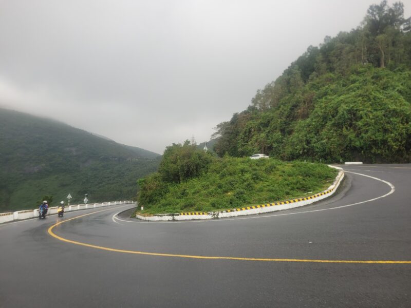 Boczne drogi za przełęczą intrygują szerokimi pasami idealnego asfaltu (po których przechadzają się krowy), a jak się w końcu okazało – zapełniają się tłumem skuterków po zakończeniu zmiany w fabryce.