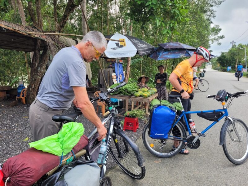 Gazu czemuś nigdzie nie ma (ale dowiadujemy się, że w Wietnamie można go kupić „na każdej stacji benzynowej”). Za to jest opona! Do wyboru była droga zwijana marki Bontrager (wyglądała jakby leżała tam od zawsze), oraz 3-krotnie tańsza (ok. 60zł) drutówka Schwalbe – tę kupiłem i wrzuciłem na bagażnik. I będę ją tak woził przez wszystkie kolejne dni – Marathon mimo wyciętej szkłem okazałej dziury – wytrzymał do końca wyjazdu.