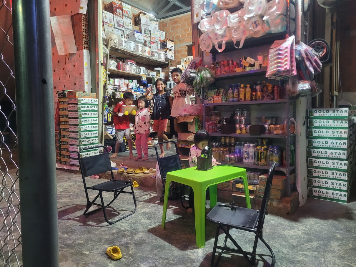 W oczekiwaniu na transport słuchamy lokalnej (chyba laotanskiej) muzyki z wielkiego telewizora, obserwujemy oprawianie mięsa na wieczorny posiłek, a Konrad z zapałem organizuje wymianę dwu pękniętych szprych w swoim rowerze. Bacik i dzynks do odkręcenia kasety daje Longin, klucz niezbędny do zakręcenia dzynksem pożycza w pobliskim warsztacie, supermocy niezbędnych do odkręcenia zapieczonego gwintu kasety udziela Tadek, szprychy ma ode mnie, zakłada je Piotr, a centrowanie robi Adam. Zbiorowym wysiłkiem udało się! 😘