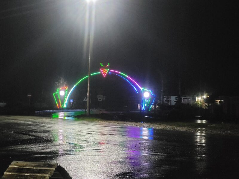 Miasteczko na górze wita nas tęczową bramą, głośną muzyką i sklepikiem z pysznymi drożdżówkami – mimo rzęsistego deszczu (właśnie rozpadało się na całego) robi się całkiem miło. No, może nie było miło Agnieszce – gdy my cieszymy się końcem podjazdu, to ona właśnie zalicza kryzys – koniec drogi jest w samą porę.