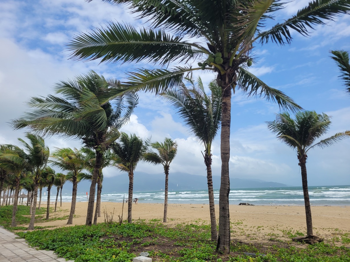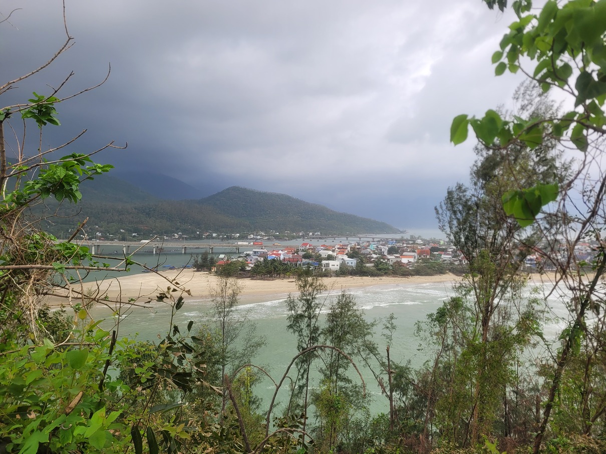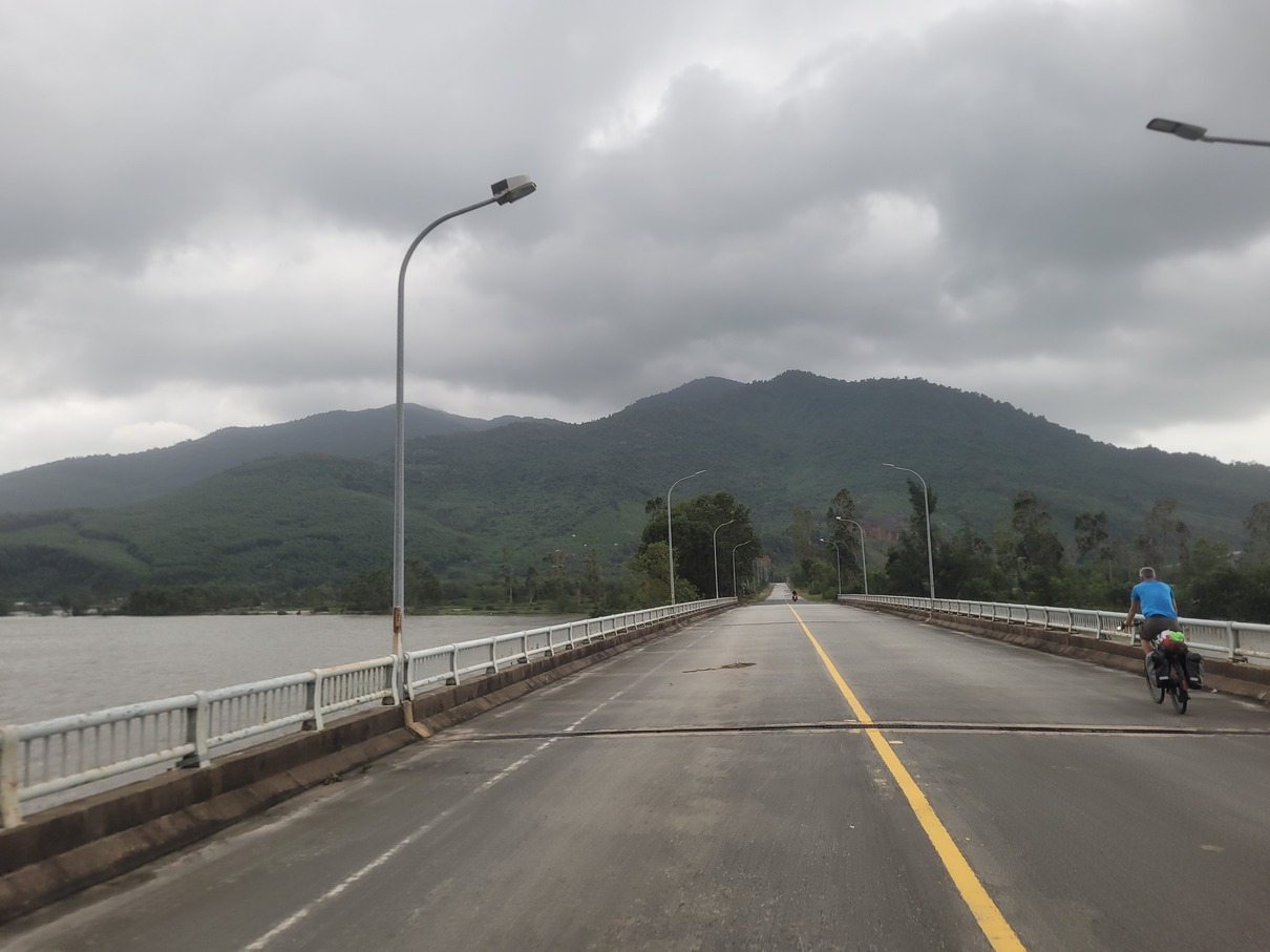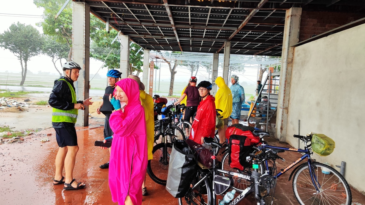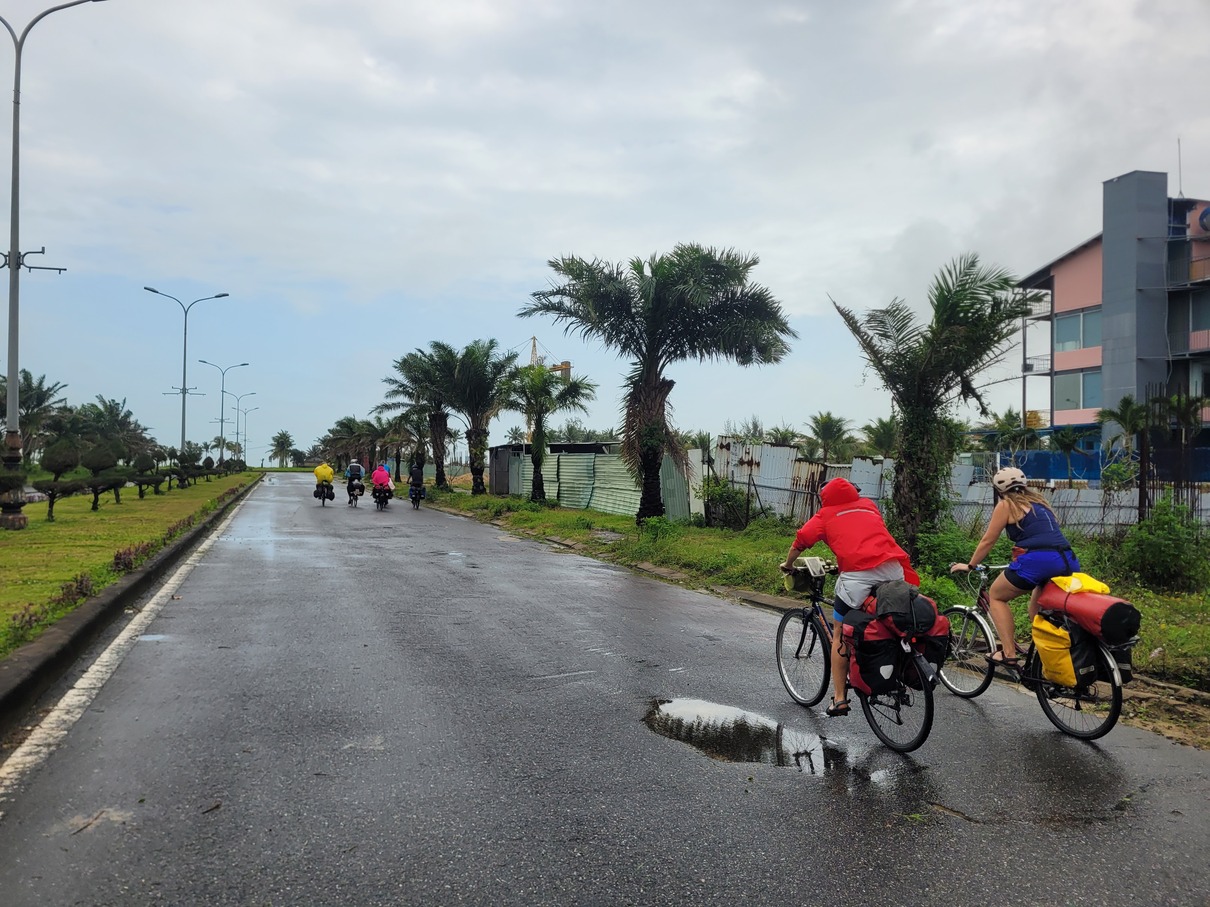 Jednak gdy wstępujemy na obiad, do knajpki z owocami morza na przedmieściach Da Nang, to zaczyna lać solidnie. Knajpka miła, fajnie się w niej siedzi patrząc na deszcz, tak że nie bardzo się chce z niej wychodzić, zwłaszcza, że usłużny Google podpowiada, że po drodze mogą być zalania przez powódź, a do tego na drodze są tunele, być może z zakazem jazdy rowerem.