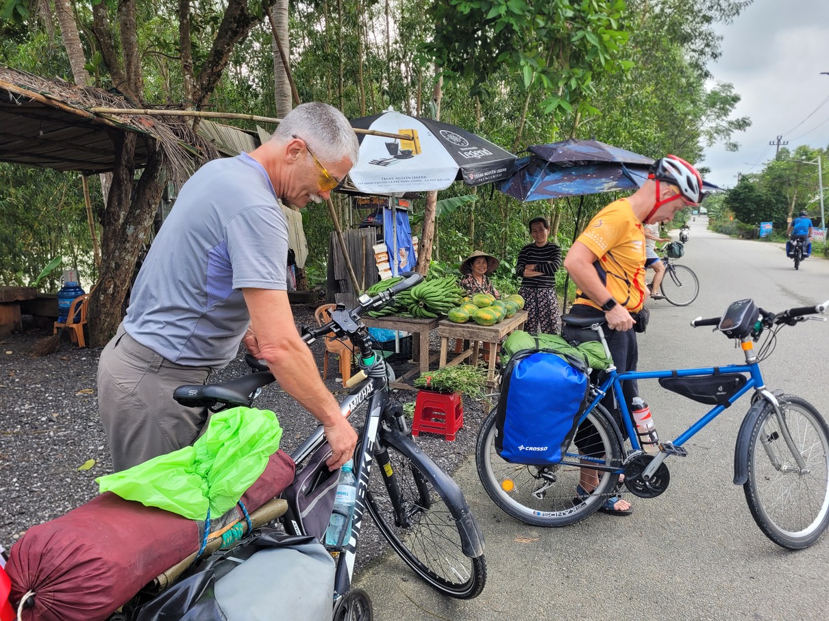 W oczekiwaniu na transport słuchamy lokalnej (chyba laotanskiej) muzyki z wielkiego telewizora, obserwujemy oprawianie mięsa na wieczorny posiłek, a Konrad z zapałem organizuje wymianę dwu pękniętych szprych w swoim rowerze. Bacik i dzynks do odkręcenia kasety daje Longin, klucz niezbędny do zakręcenia dzynksem pożycza w pobliskim warsztacie, supermocy niezbędnych do odkręcenia zapieczonego gwintu kasety udziela Tadek, szprychy ma ode mnie, zakłada je Piotr, a centrowanie robi Adam. Zbiorowym wysiłkiem udało się! 😘