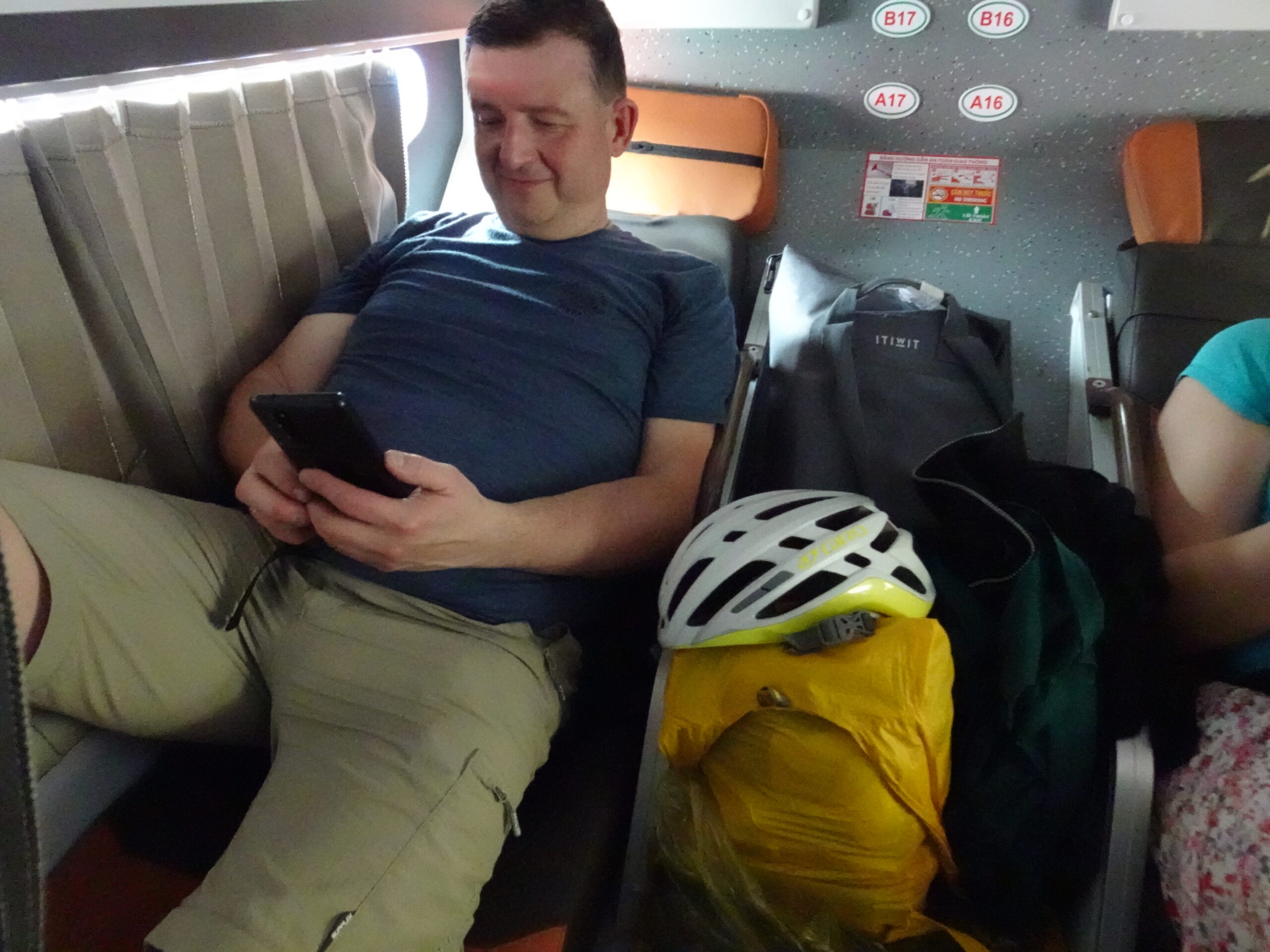 Z jednej strony to miłe poczucie bezpieczeństwa (jakbym od razu zmienił, to bym się martwił czy ta tania opona wytrzyma, a tak to mam „backup”), z drugiej – niewygoda. Opona zawadza, a do tego utrudnia zrealizowanie planu, by na bagażniku wozić część namiotu (część, bo karimata piankowa już wystarczająco zapełniła górę bagażnika, tak że planowałem namiot rozdzielić na część wożoną w worku wodoszczelnym w sakwie i część na bagażniku – taka komplikacja, będąca ubocznym skutkiem oszczędności ok. 400g na wadze, czyli wyboru karimaty zamiast samopompy). Efekt jest taki, że zamiast z Piotrkiem dzielić się uciążliwością wożenia 2kg namiotu dla nas, to cwaniakuję: cały wyjazd to on go woził. Mówi, że mu nie przeszkadza…