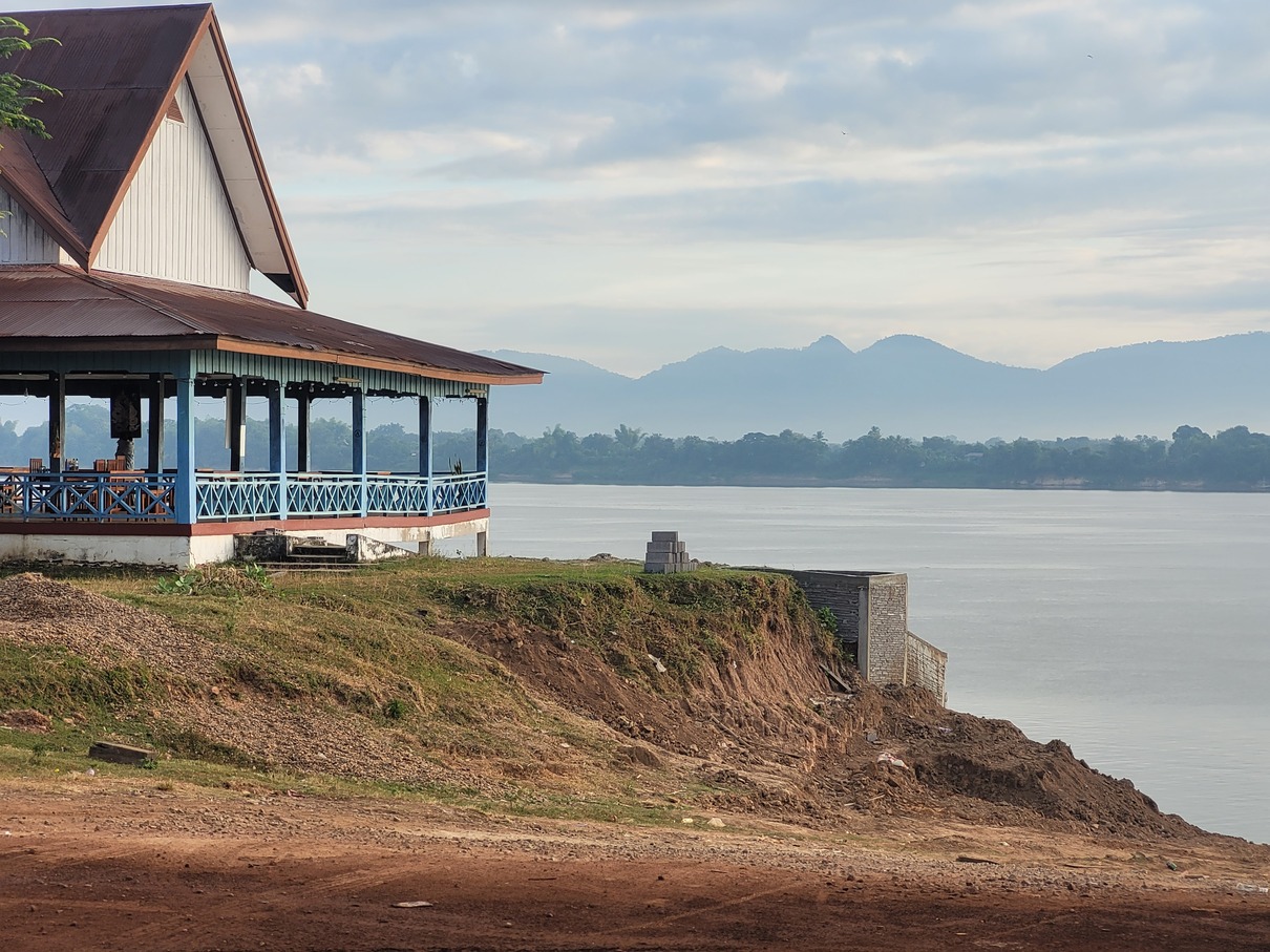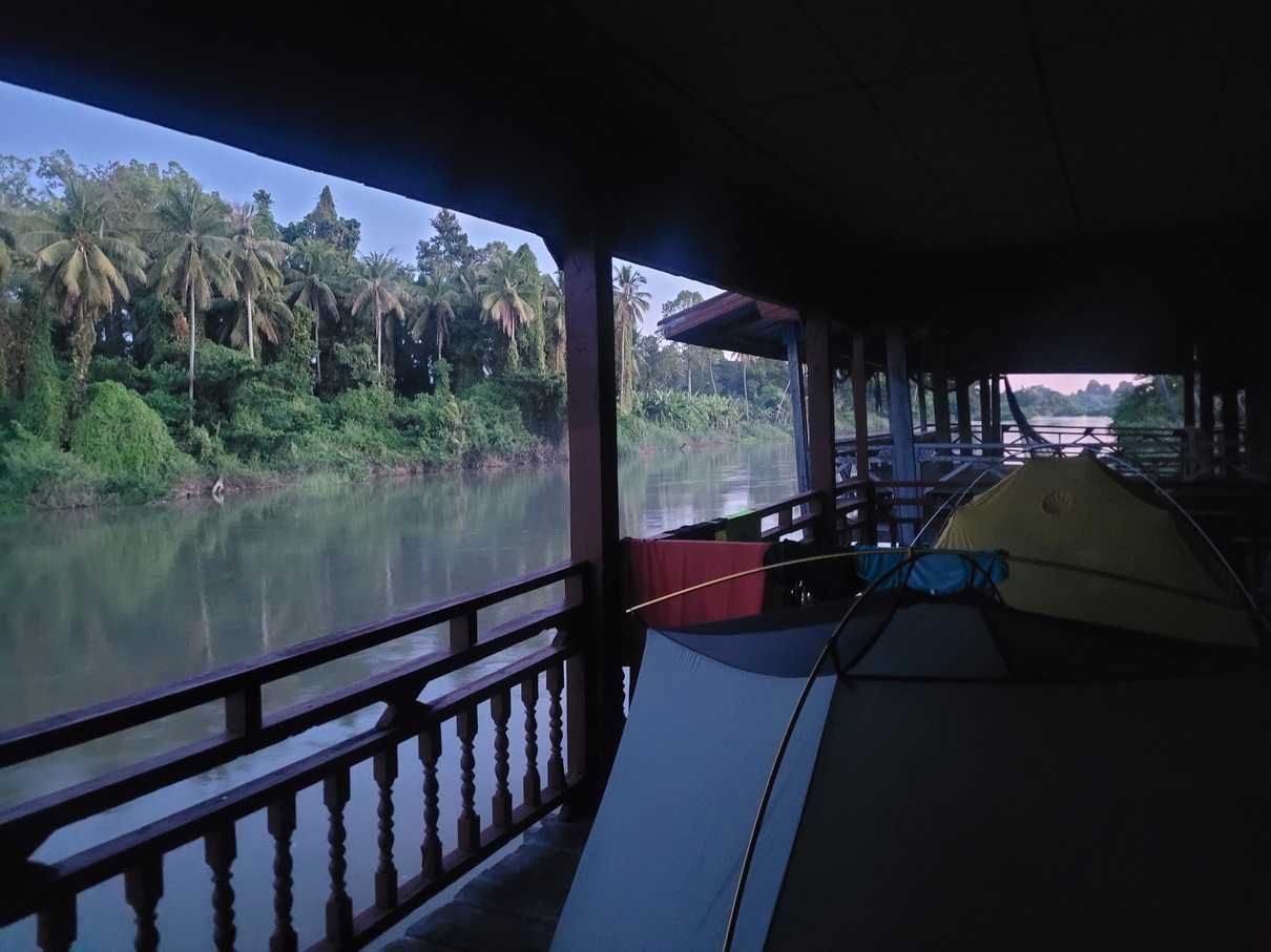 W zasadzie to nie mieli miejsca dla nas wszystkich, bo wolne mieli tylko 3 pokoje 2osobowe (z łazienkami!), ale zaraz obok pokoi jest piękny taras nad Mekongiem, gdzie aż się prosi rozłożyć sypialnię (moskitiera) namiotu. Wieczorne piwko nad rzeką smakuje znakomicie.