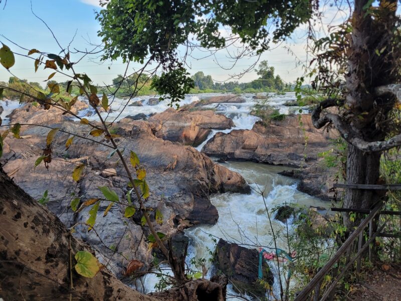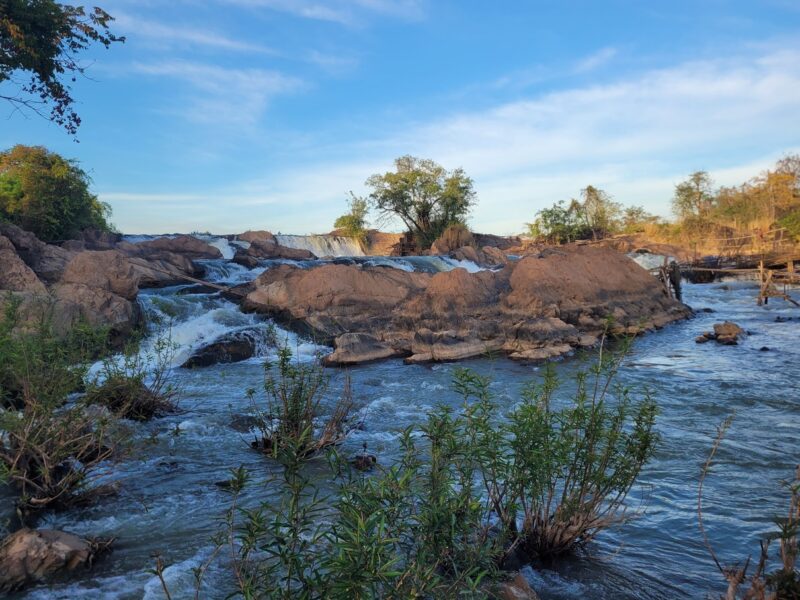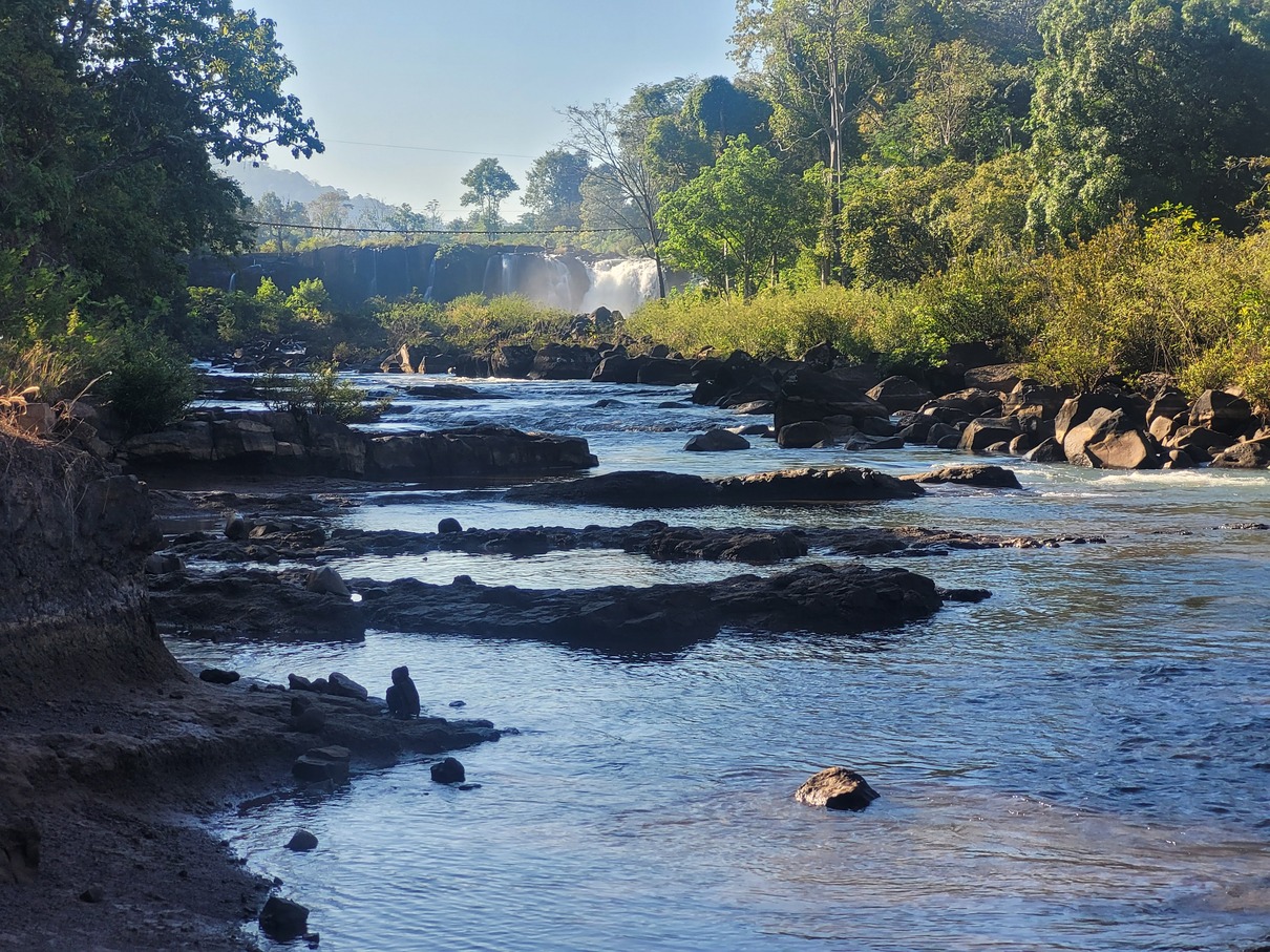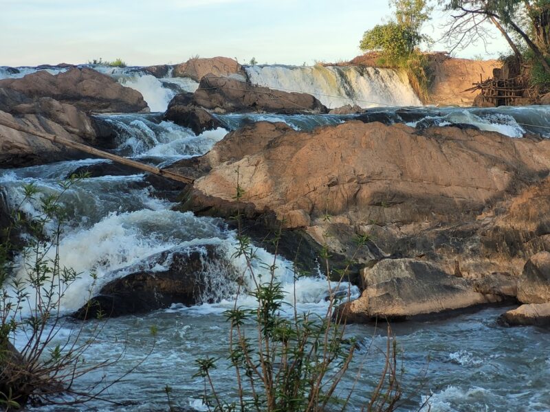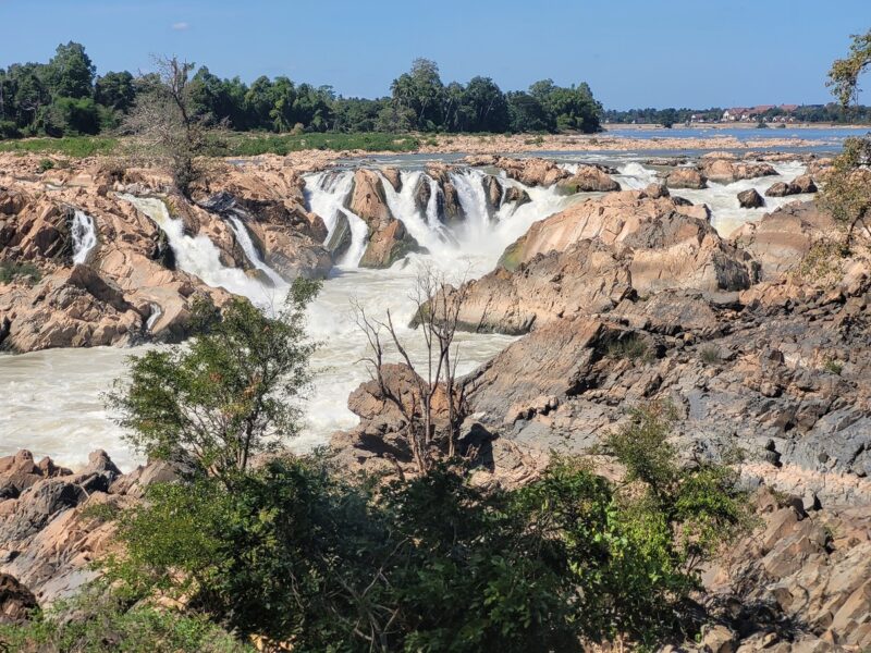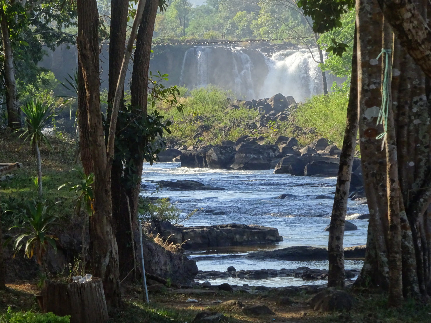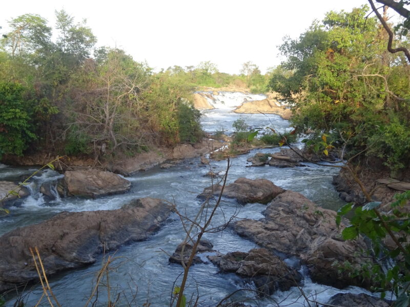 Wiem, że trzeba się spieszyć, żeby grupa nie musiała na mnie czekać przed granicą, ale i tak udaje zobaczyć ciekawe miejsce: kolejny wodospad na Mekongu (a raczej jednej z jego odnóg), koło niego spokojna teraz świątynia (choć widać, że bywają tu tłumy), a w pobliżu całkiem miła „plaża” nad rzeką, pozwalająca zrealizować zachciankę – kąpiel w czystym tu Mekongu.