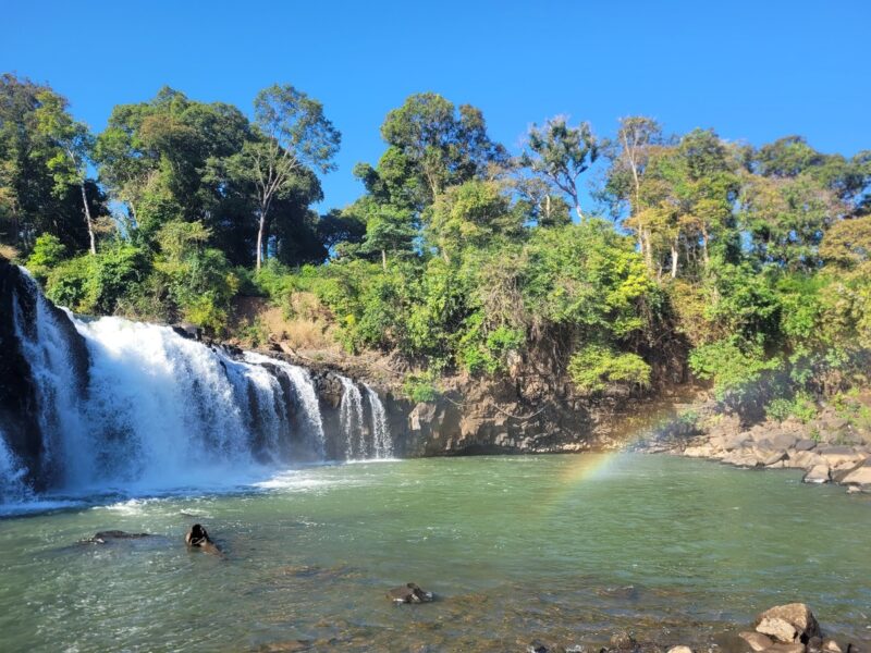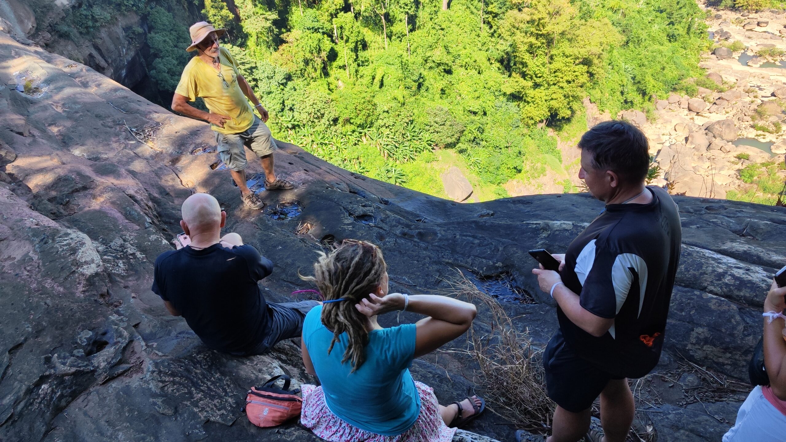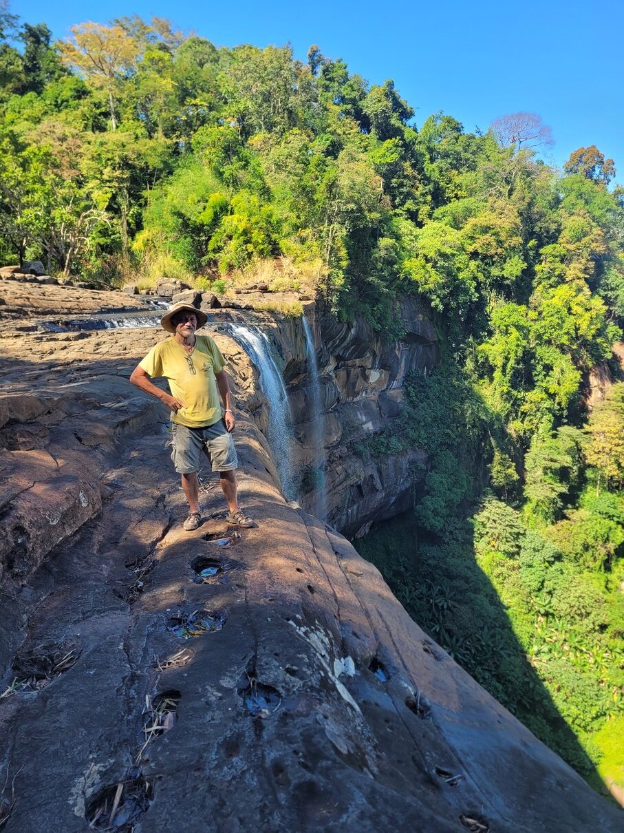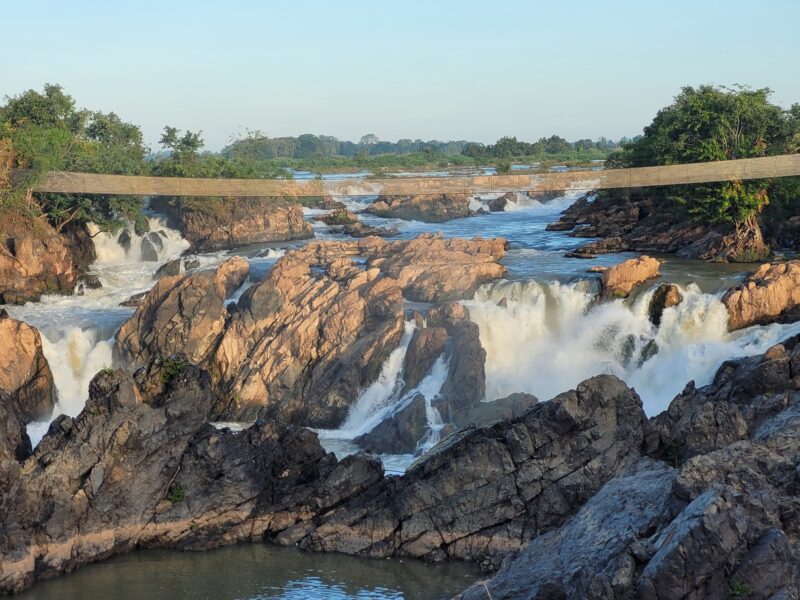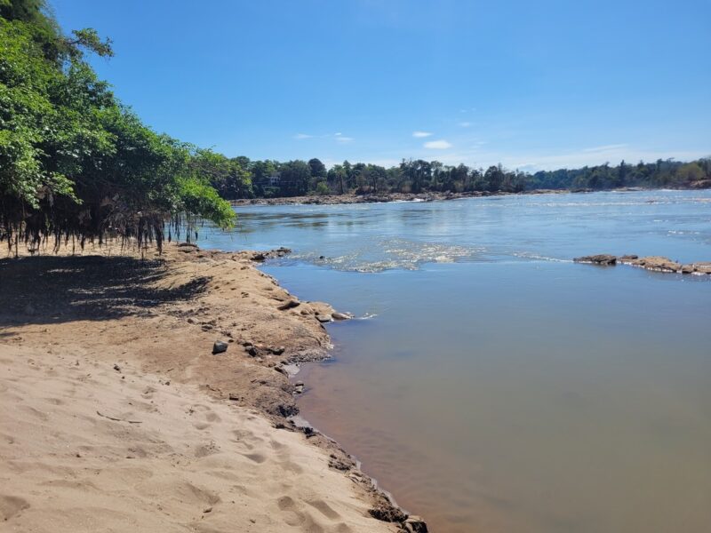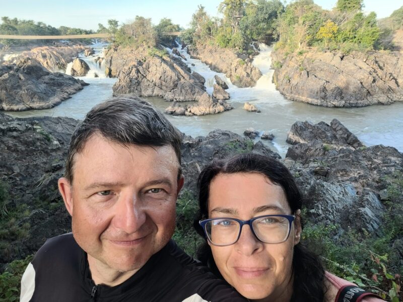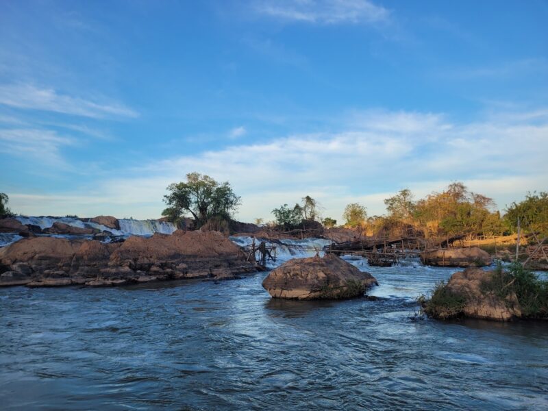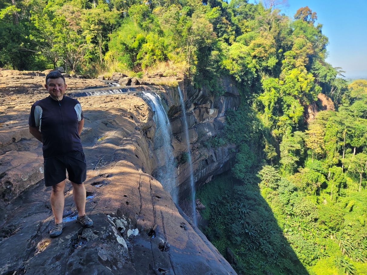 Wiem, że trzeba się spieszyć, żeby grupa nie musiała na mnie czekać przed granicą, ale i tak udaje zobaczyć ciekawe miejsce: kolejny wodospad na Mekongu (a raczej jednej z jego odnóg), koło niego spokojna teraz świątynia (choć widać, że bywają tu tłumy), a w pobliżu całkiem miła „plaża” nad rzeką, pozwalająca zrealizować zachciankę – kąpiel w czystym tu Mekongu.