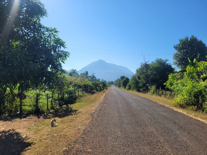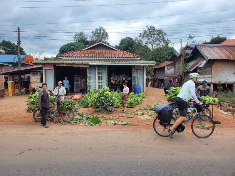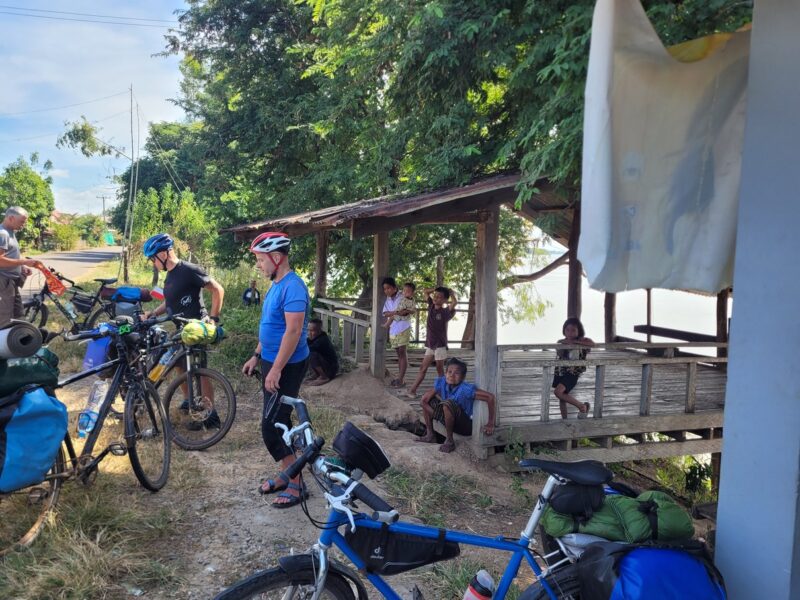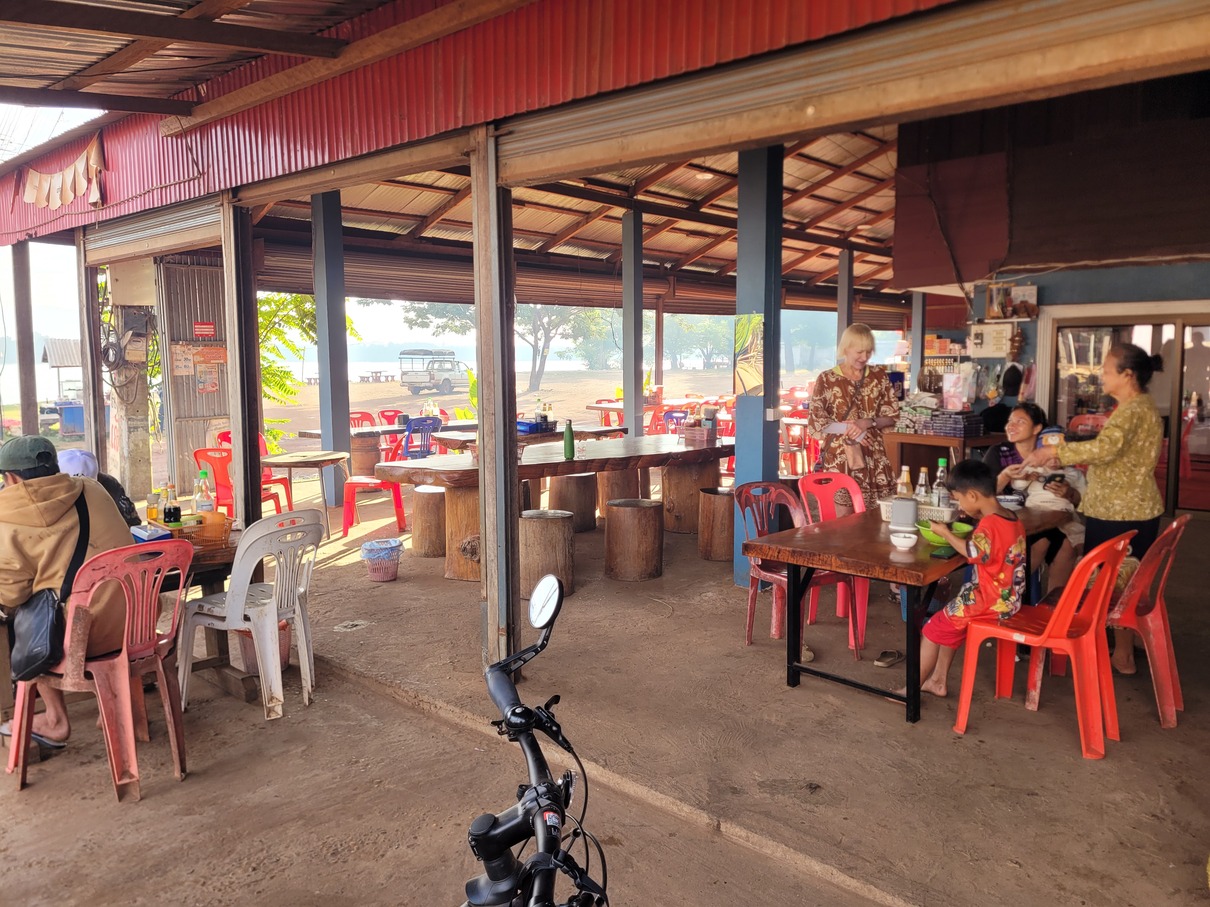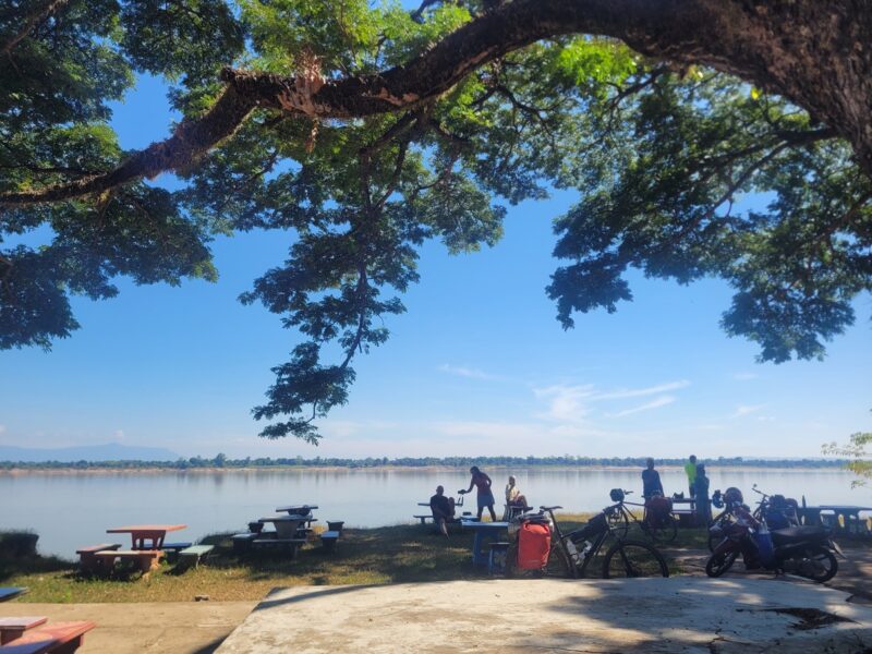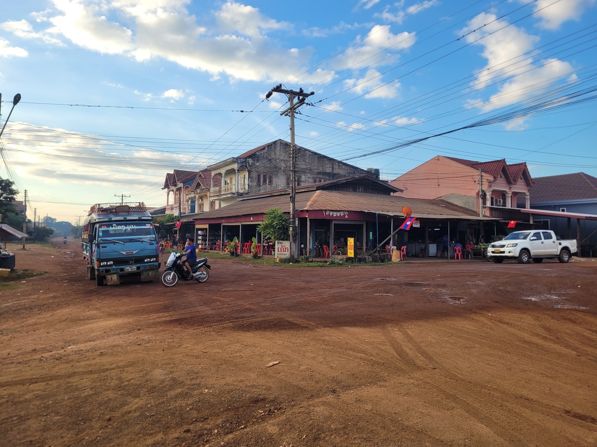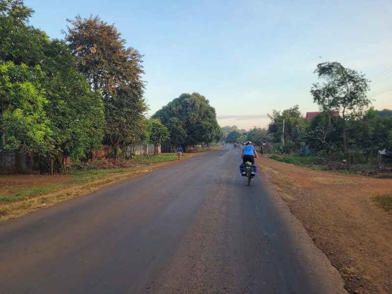 Po Vat Phou zostało jeszcze 70km – ciągniemy na południe, w stronę Kambodży, główną drogą. Trochę to marudne (marny asfalt), więc 30km dalej, w miasteczku gdzie jemy obiad, zastanawiamy się czy nie porzucić głównej dla drogi bocznej, prowadzącej nad samym Mekongiem. Nie jest to szczególnie rozsądne, bo koniec dnia blisko, czyli spora część z tych 40km drogą o nieznanej jakości będzie po ciemku. Więc choć korciło wielu, to ostatecznie ten nierozsądny wariant wybieram tylko ja oraz Adam z Patrycją.