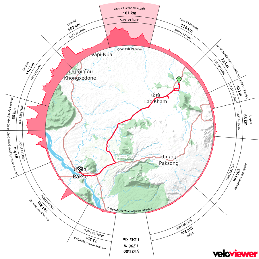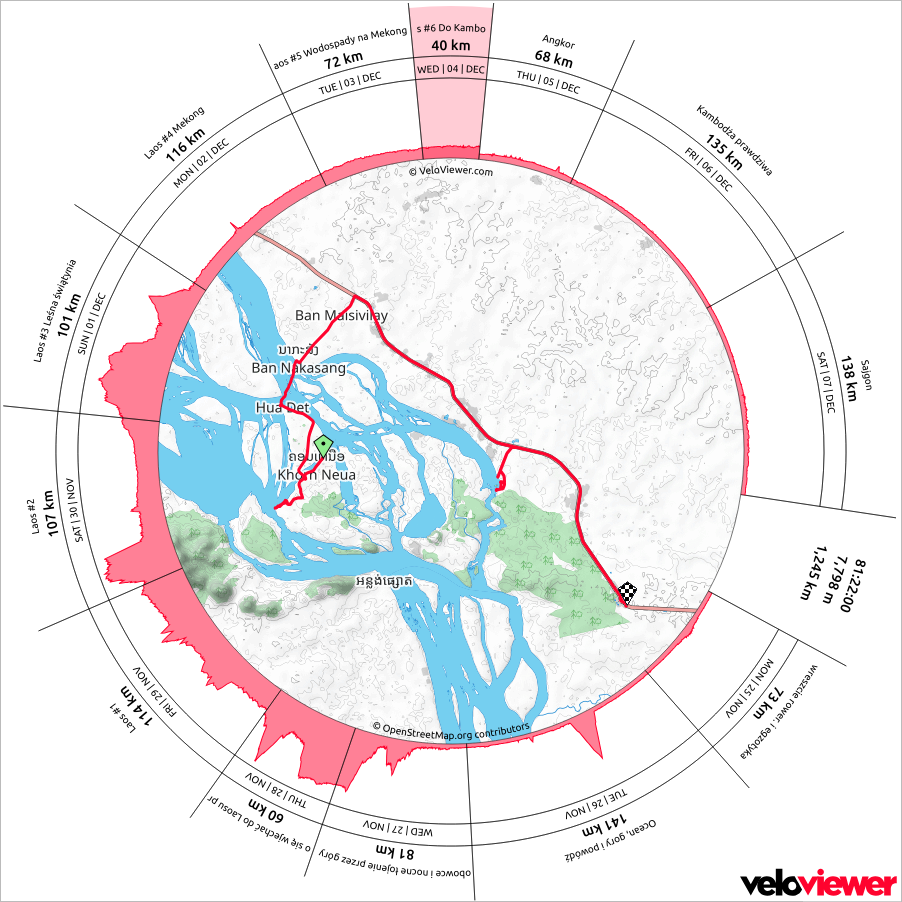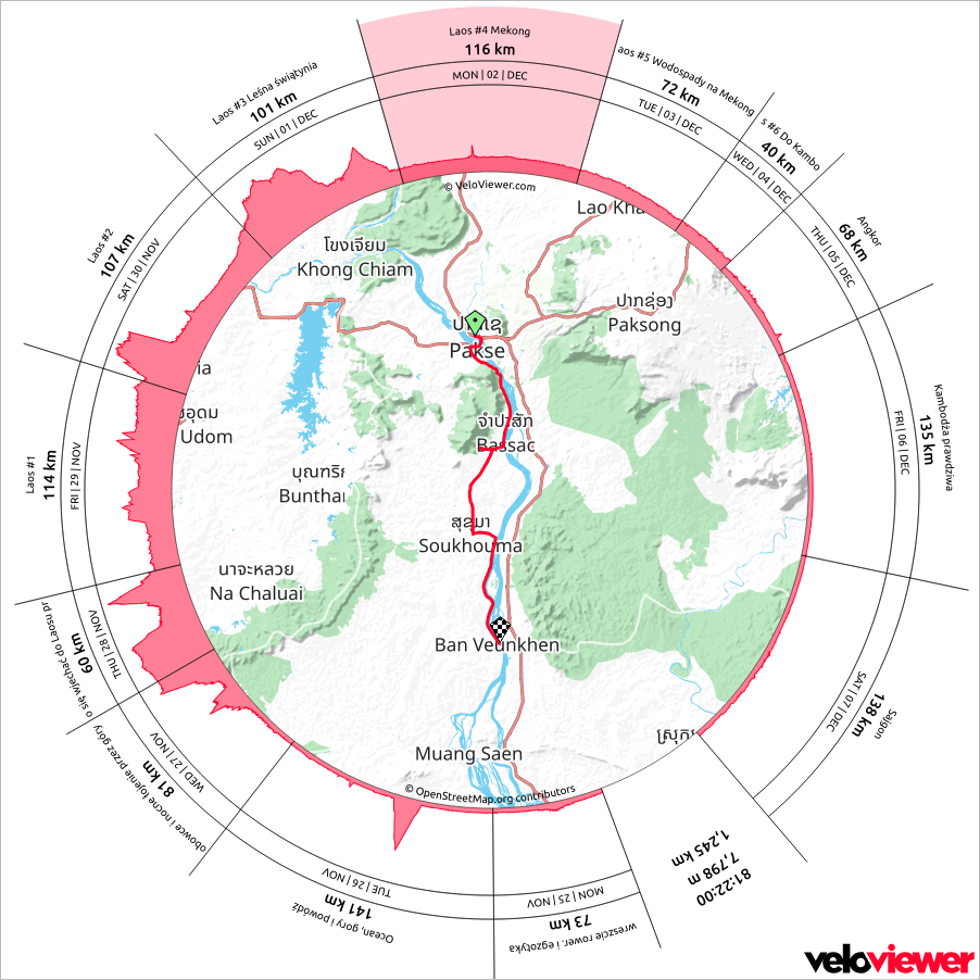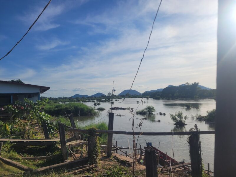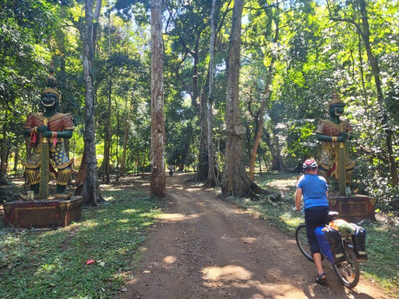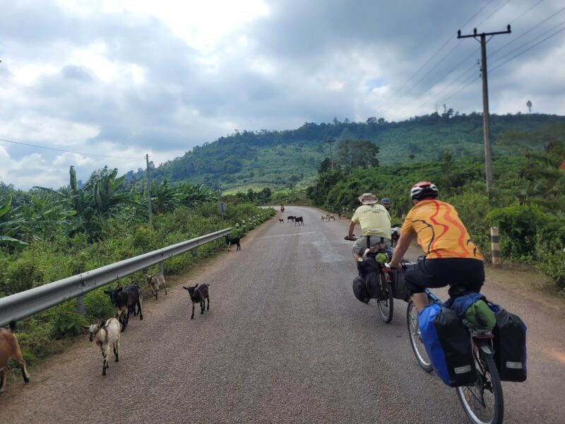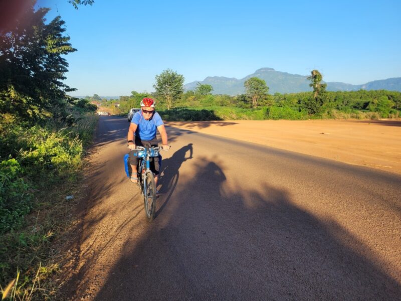 Po Vat Phou zostało jeszcze 70km – ciągniemy na południe, w stronę Kambodży, główną drogą. Trochę to marudne (marny asfalt), więc 30km dalej, w miasteczku gdzie jemy obiad, zastanawiamy się czy nie porzucić głównej dla drogi bocznej, prowadzącej nad samym Mekongiem. Nie jest to szczególnie rozsądne, bo koniec dnia blisko, czyli spora część z tych 40km drogą o nieznanej jakości będzie po ciemku. Więc choć korciło wielu, to ostatecznie ten nierozsądny wariant wybieram tylko ja oraz Adam z Patrycją.