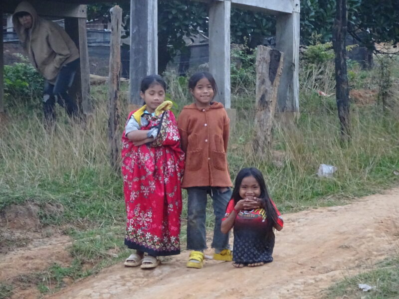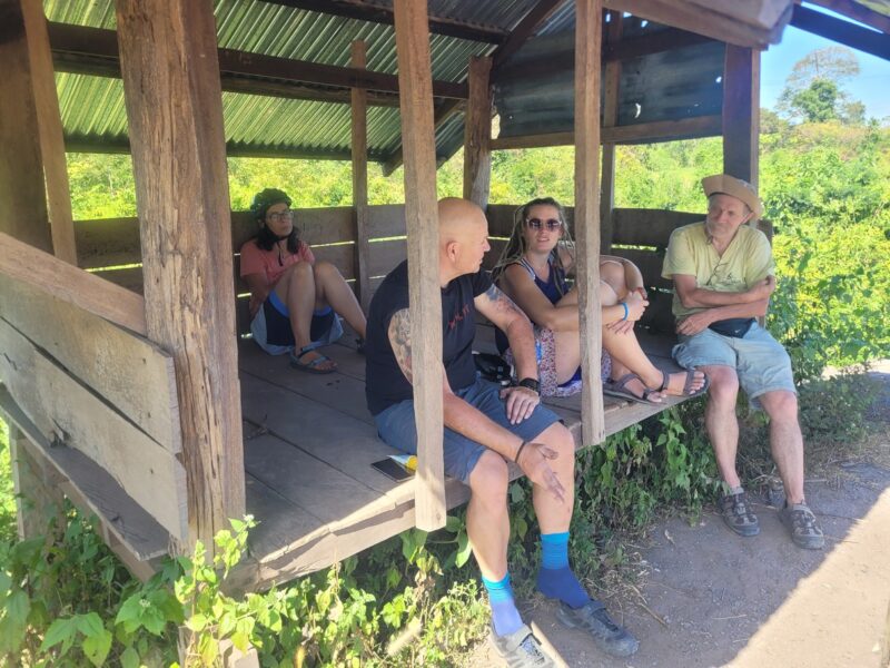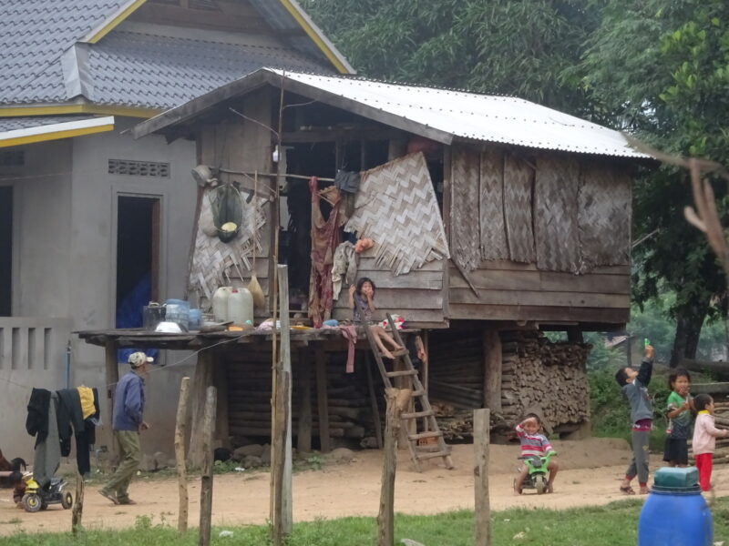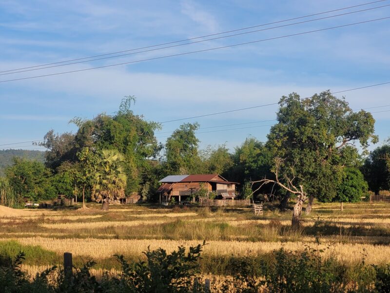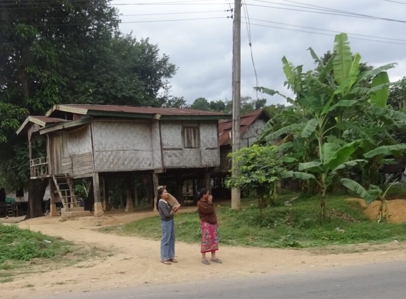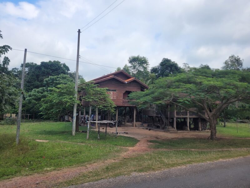Tutaj wszystkie domy są na palach. Nawet jakieś proste schronienia/szałasy przy polach też są wyniesione. Nawet coś, co wygląda jak przystanek. Longin mówi że to dla ochrony przed wężami – czyli gdyby przyszło rozstawiać namiot, to trzeba by szukać właśnie takiego miejsca.