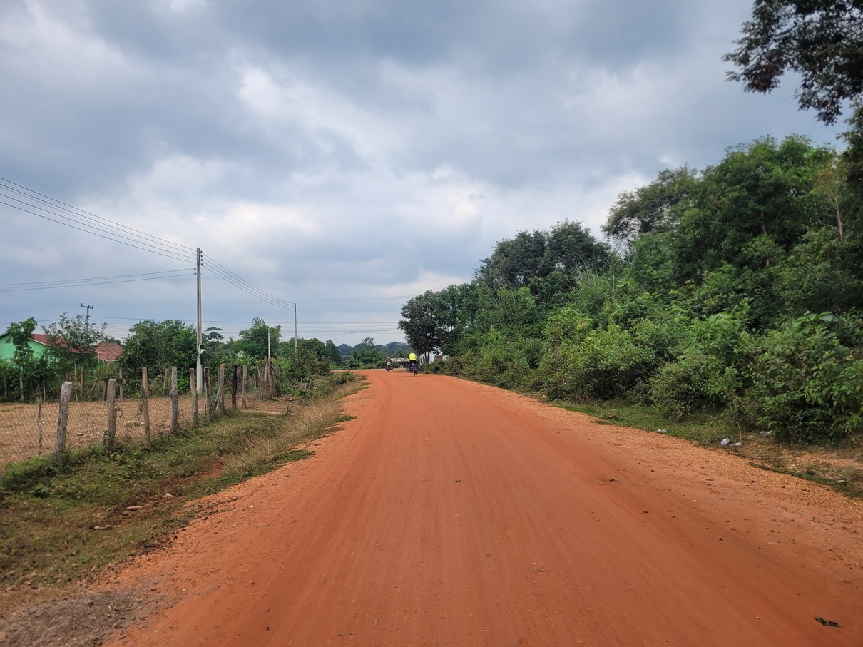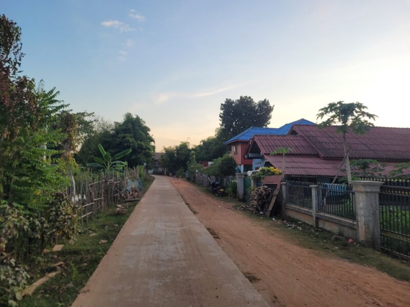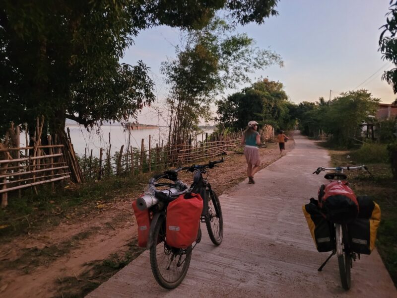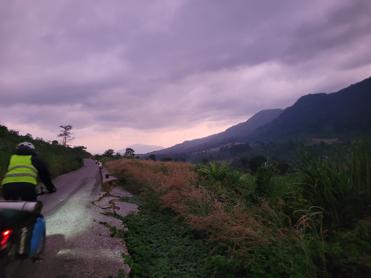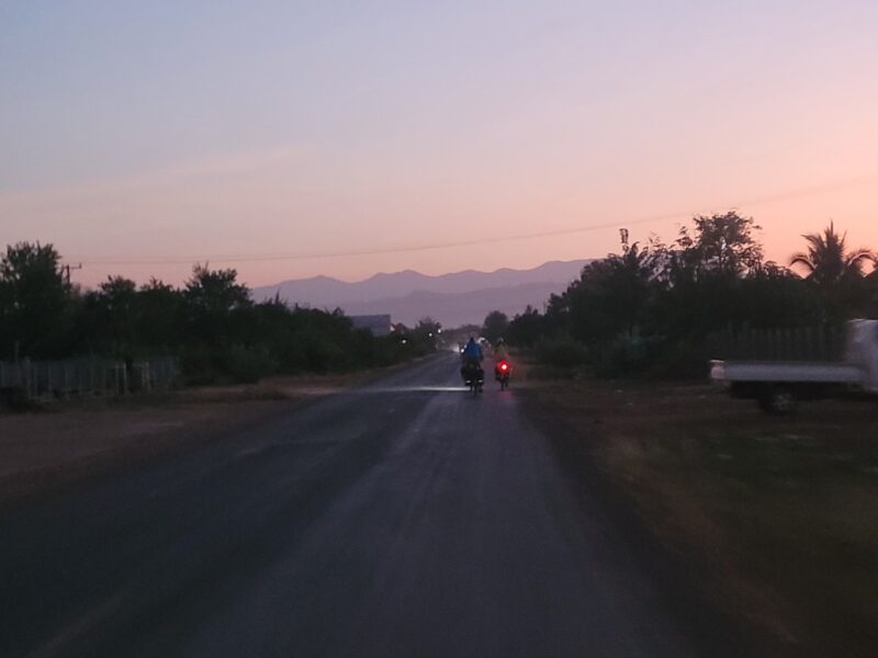 Adam wyjechał chwilę wcześniej – jak mówi: sprawdzić jakość drogi oraz czy jest prom na dopływie Mekongu 15km dalej. Wysyłał potem niejednoznaczne komunikaty whatsappem („Jest drogowskaz na prom. Droga stała się gruntowa/ z płyt”) , a my po prostu jechaliśmy za nim w ciemno. Dokładnie w ciemno – dzień pomału się kończy.