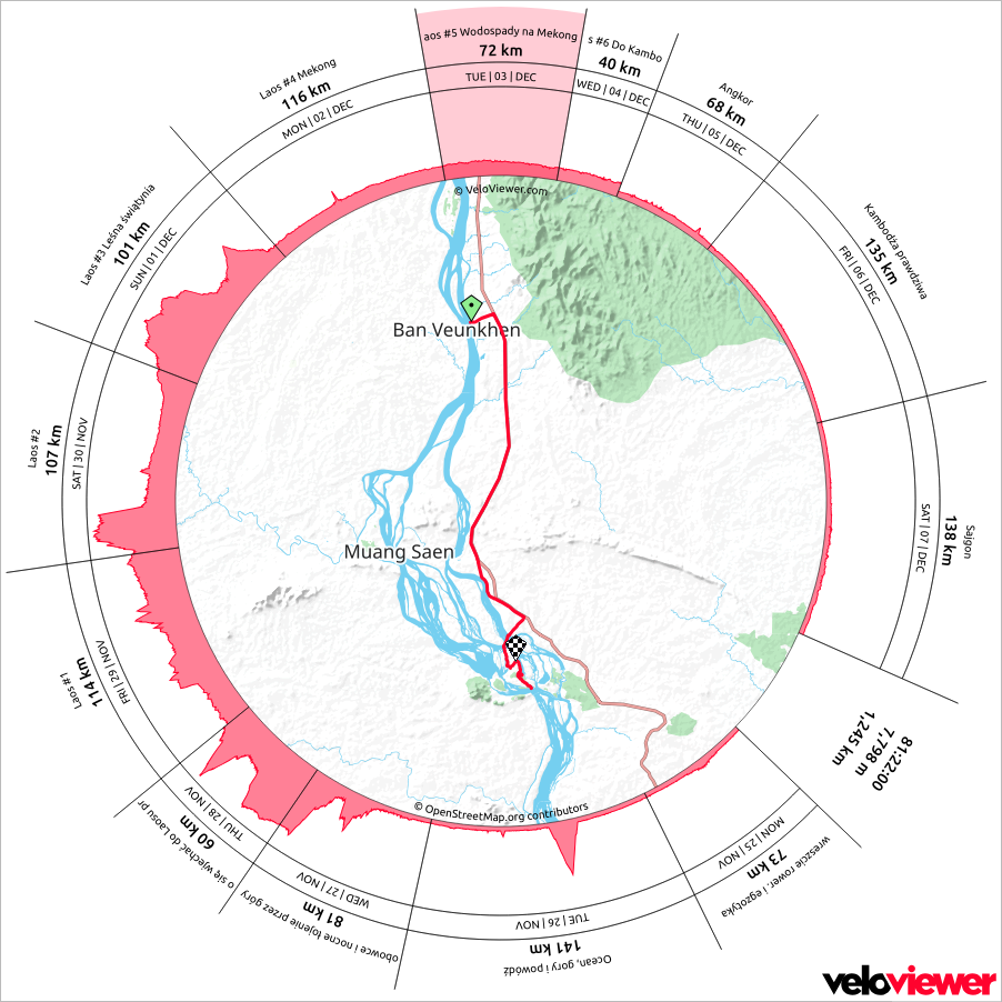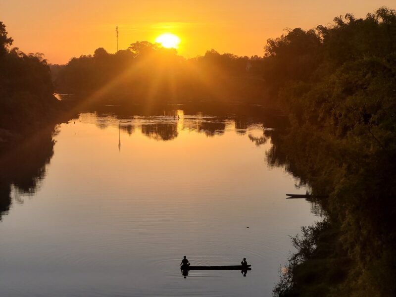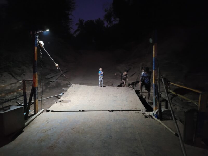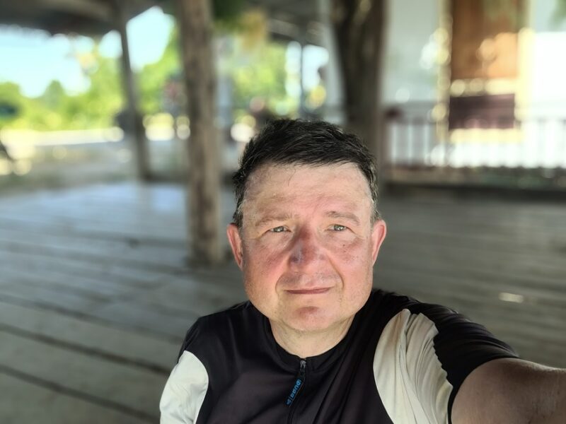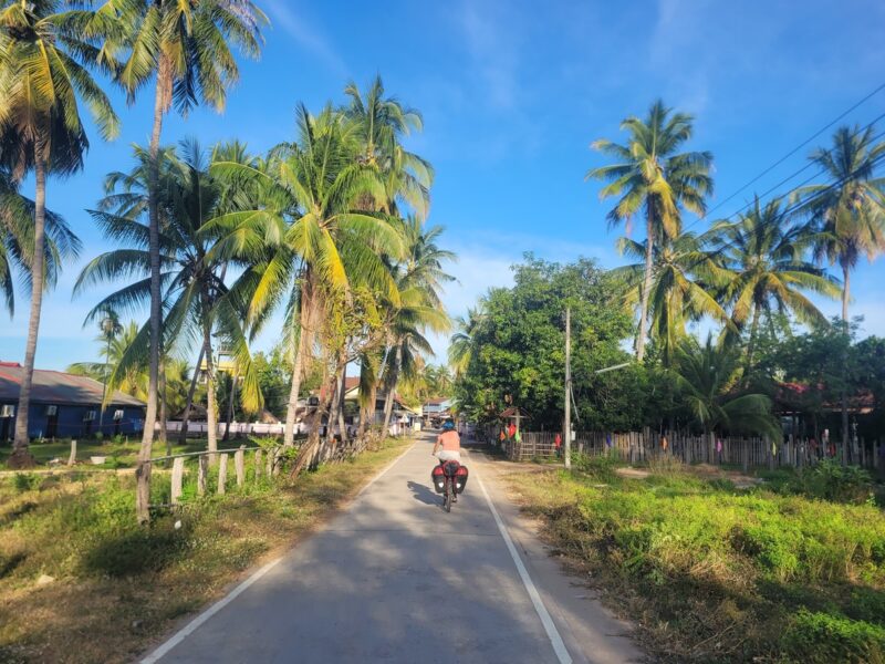 Adam wyjechał chwilę wcześniej – jak mówi: sprawdzić jakość drogi oraz czy jest prom na dopływie Mekongu 15km dalej. Wysyłał potem niejednoznaczne komunikaty whatsappem („Jest drogowskaz na prom. Droga stała się gruntowa/ z płyt”) , a my po prostu jechaliśmy za nim w ciemno. Dokładnie w ciemno – dzień pomału się kończy.
