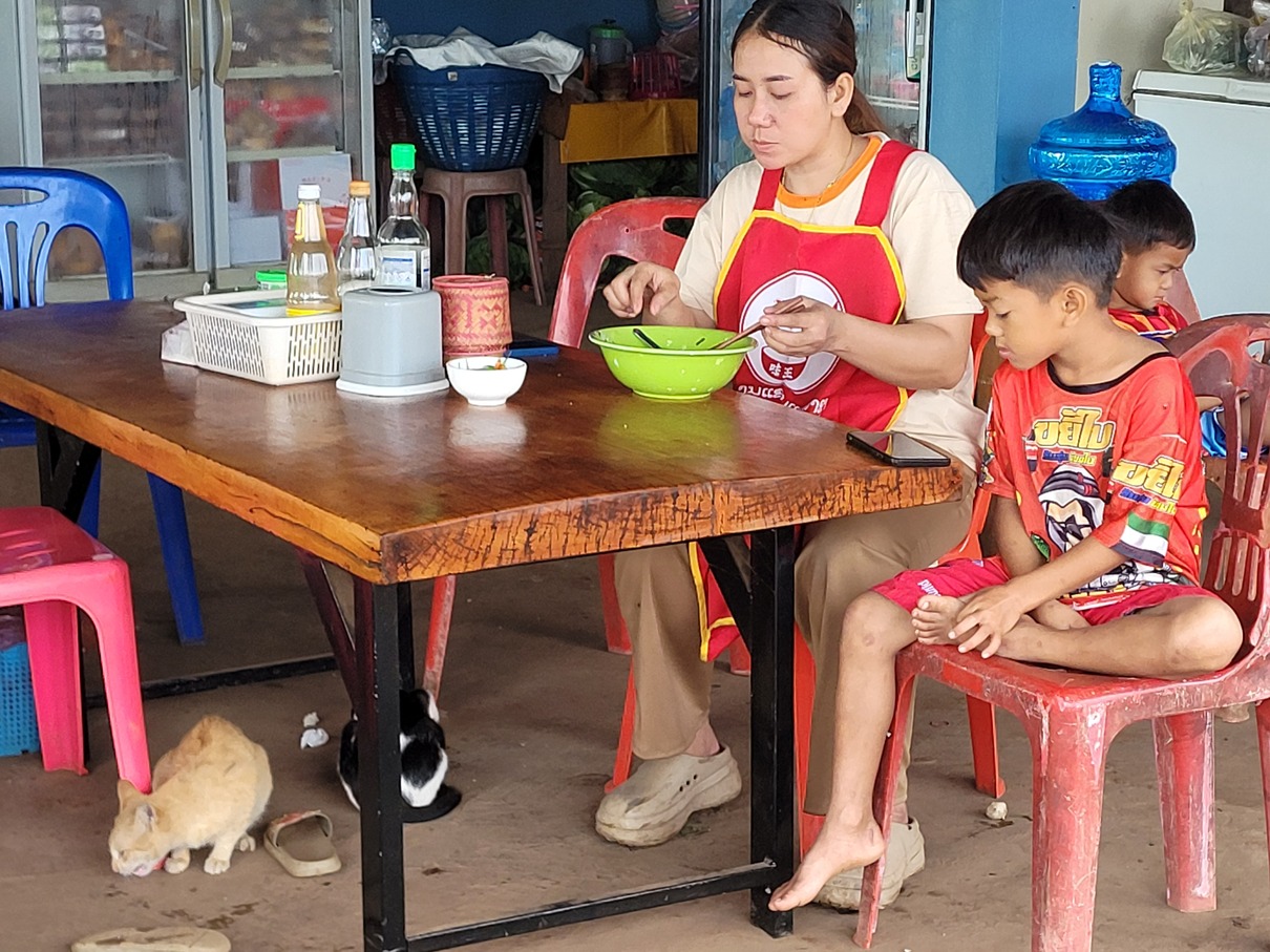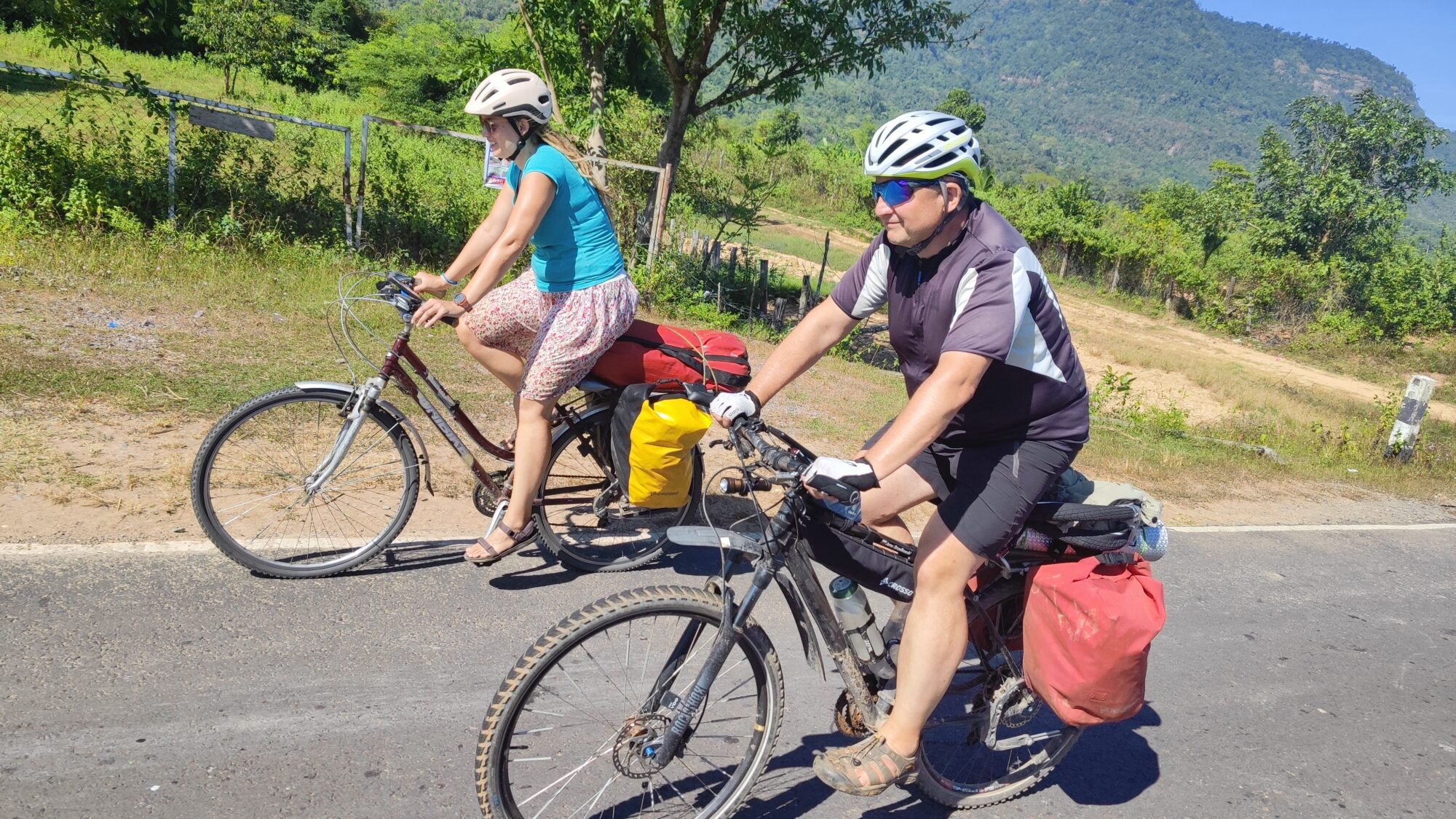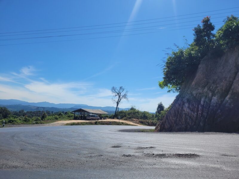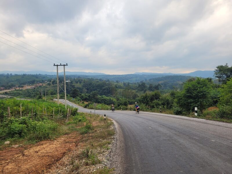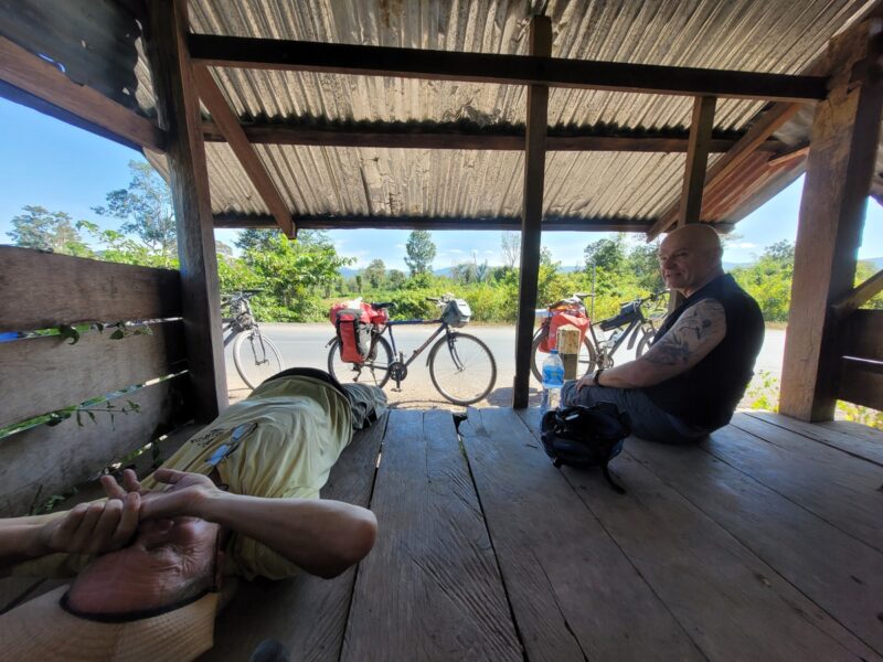 Nie ma sensu by się męczyła w upale na prostej drodze – próbujemy złapać dla niej jakiś transport. Wydaje się że klasycznego autostopu tu nie znają, ale gdy w końcu stawiamy jej rower do góry kołami, a kierowcy pokazujemy nie wzniesiony kciuk, ale „namaste” 🙏, to się zatrzymuje. Tłumaczymy jak potrafimy, że Ewe męczy żołądek, a jednocześnie rower wrzucamy na pakę. Trudno powiedzieć co zrozumieli, ale wpuszczają Ewe do kabiny, gdzie jest cała rodzina – włącznie z małym dzieckiem śpiącym z tyłu. Jakieś pieniądze (nieduże) za podwózkę wzięli, ale przede wszystkim to byli dobrzy, życzliwi ludzie. Podwieźli ją ze 30km, tak że spotkamy się z nią dopiero w Ban Nakasang, gdzie podsypiała w jakiejś kawiarni.