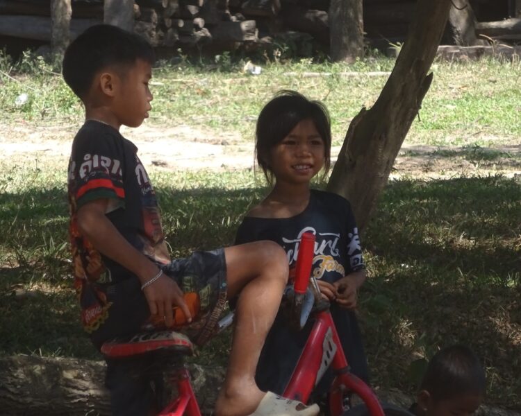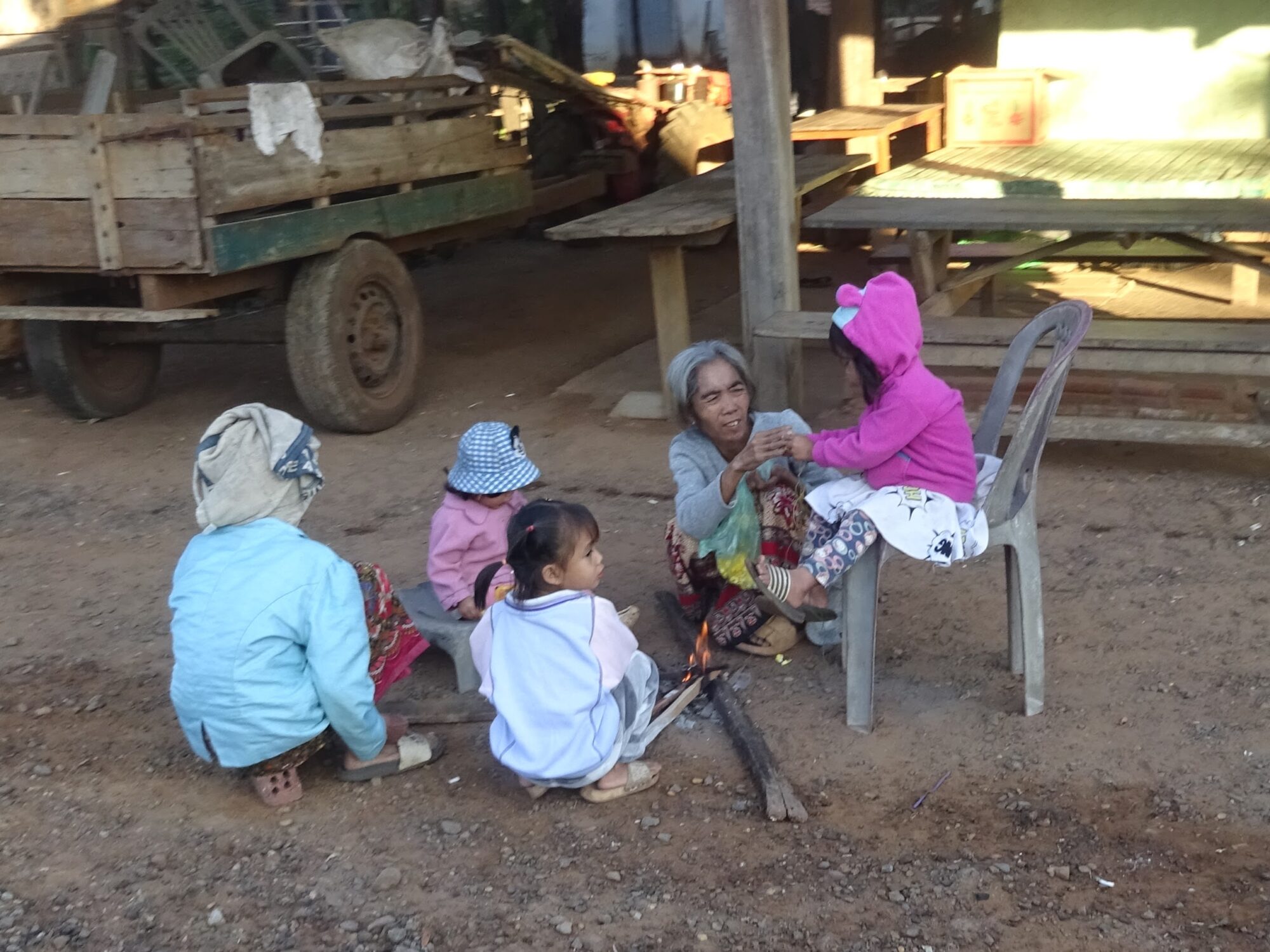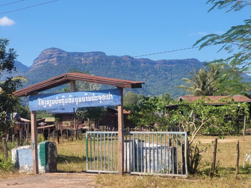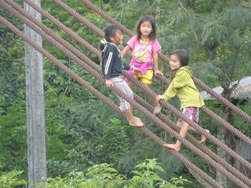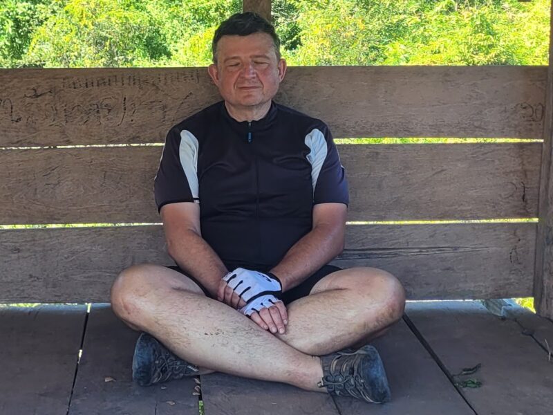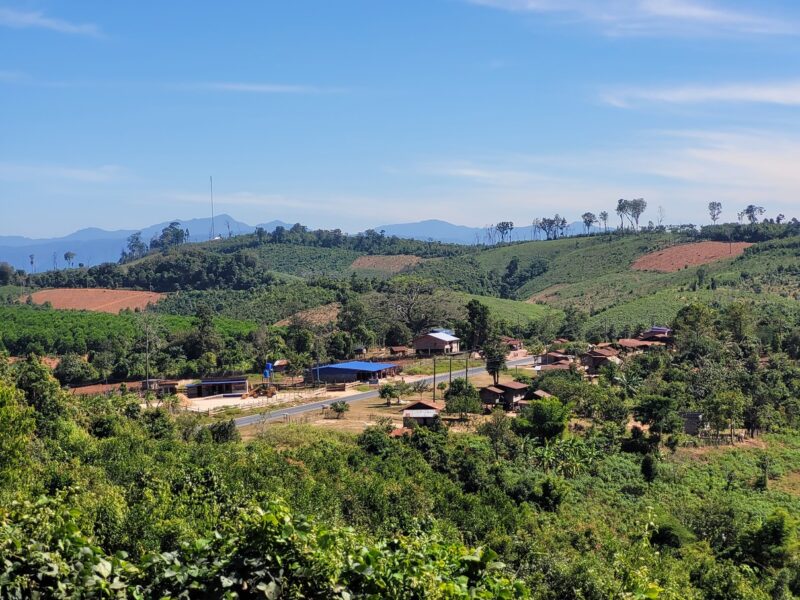 Nie ma sensu by się męczyła w upale na prostej drodze – próbujemy złapać dla niej jakiś transport. Wydaje się że klasycznego autostopu tu nie znają, ale gdy w końcu stawiamy jej rower do góry kołami, a kierowcy pokazujemy nie wzniesiony kciuk, ale „namaste” 🙏, to się zatrzymuje. Tłumaczymy jak potrafimy, że Ewe męczy żołądek, a jednocześnie rower wrzucamy na pakę. Trudno powiedzieć co zrozumieli, ale wpuszczają Ewe do kabiny, gdzie jest cała rodzina – włącznie z małym dzieckiem śpiącym z tyłu. Jakieś pieniądze (nieduże) za podwózkę wzięli, ale przede wszystkim to byli dobrzy, życzliwi ludzie. Podwieźli ją ze 30km, tak że spotkamy się z nią dopiero w Ban Nakasang, gdzie podsypiała w jakiejś kawiarni.