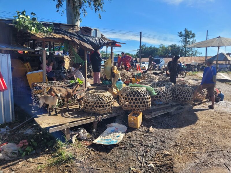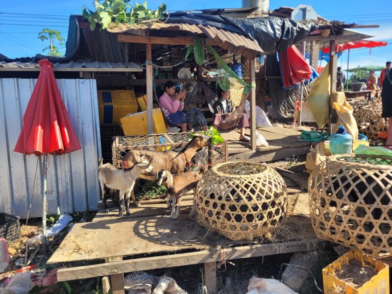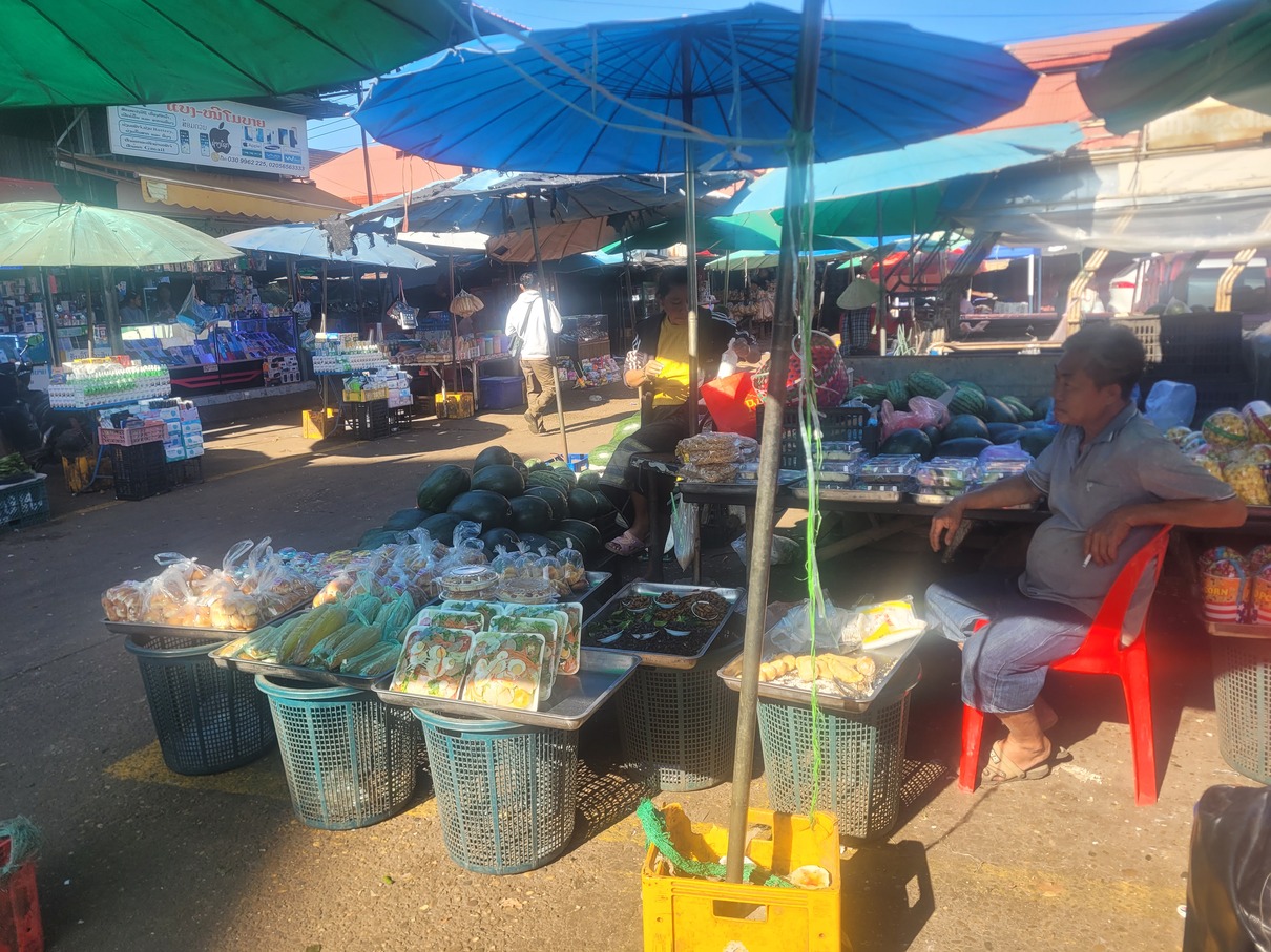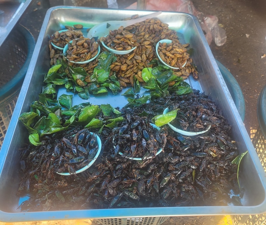 Jeszcze tylko odwiedzamy targowisko – kupić owoce, ale przy okazji robimy fotkę panu sprzedającemu różne jedzenie (ciastka, itp) – w szczególności ma tacę z robakami.