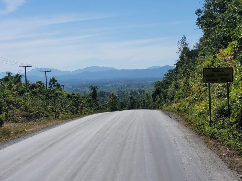 W miasteczku Mouang Noung, w środku drogi (jest knajpa na obiad), mamy możliwość zobaczenia jak tu kiedyś droga wyglądała. Pierwsze wrażenie jest bardzo dobre, ale na tak pylistej drodze każda ciężarówka na pewno robi wstrząsające wrażenie. Czyli cywilizacja ma swoje zalety…
