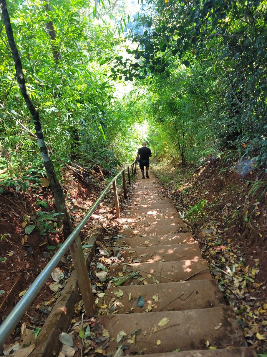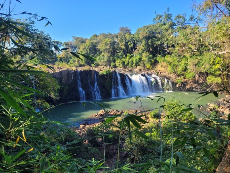 Rano wstajemy o wschodzie słońca żeby zobaczyć kolejne wodospady. W odróżnieniu od tych co widzieliśmy wczoraj, to regularna atrakcja turystyczna – mimo wczesnej pory trzeba zapłacić bilet, ale wejście na mosty linowe nad wodospadami jest starannie zagrodzone – tam bilety sprzedają później (i dużo drożej). Jest okazale!
