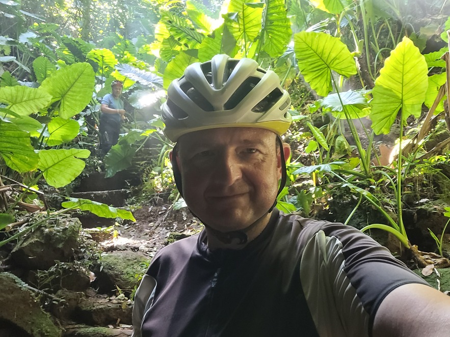 Najpierw próbujemy prowadzić tam rowery, potem zwalone drzewo blokuje drogę. Ścieżka kończy się, a w gąszcz prowadzą kamienne schody.