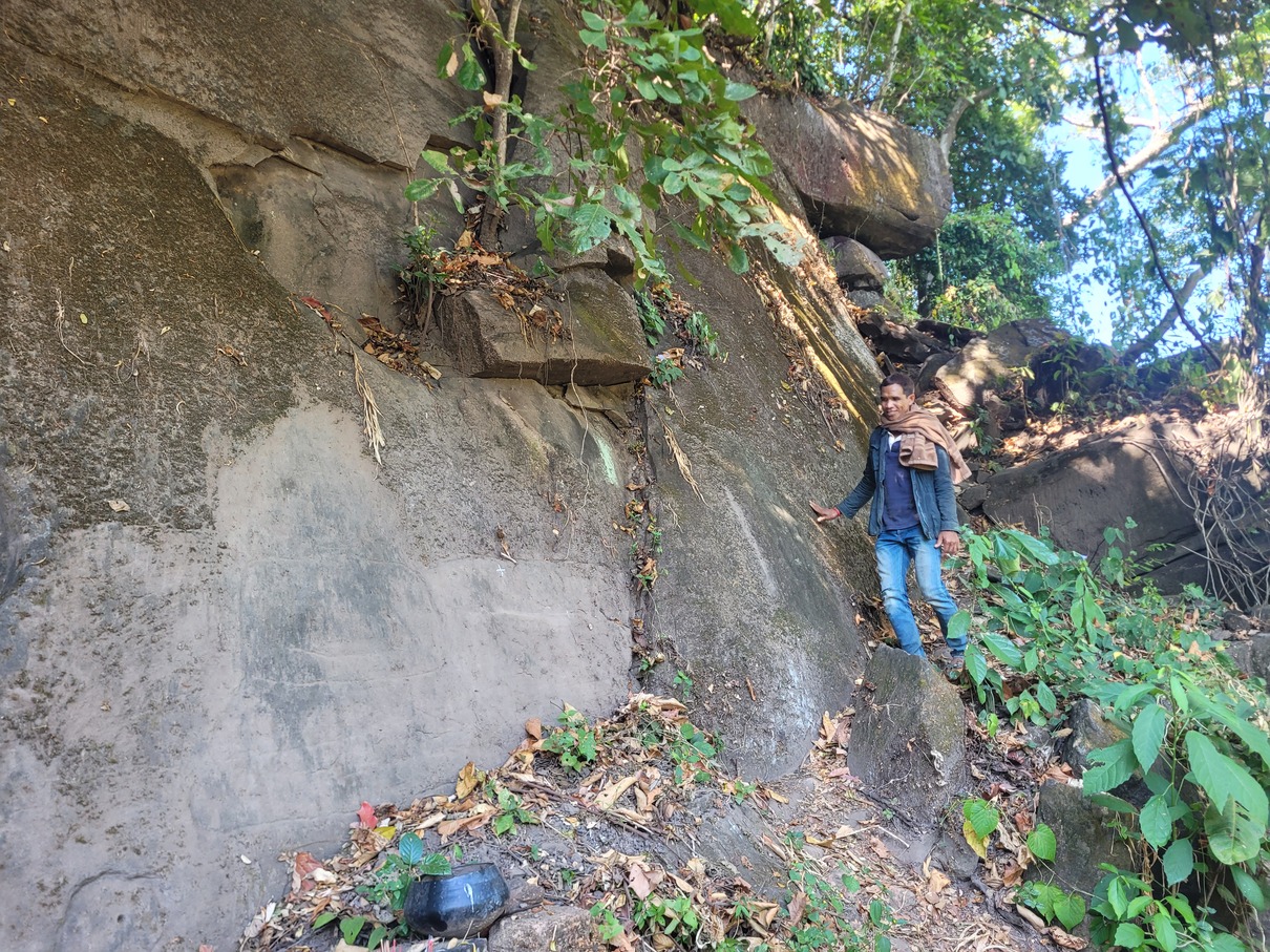 Jeszcze tylko fotki pod liśćmi, jeszcze oglądamy rzeźby w lesie koło zejścia do jaskini i wracamy do drogi.
