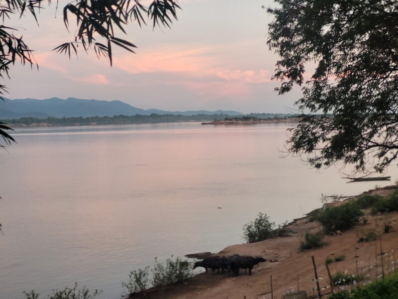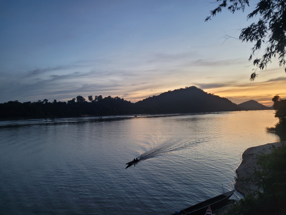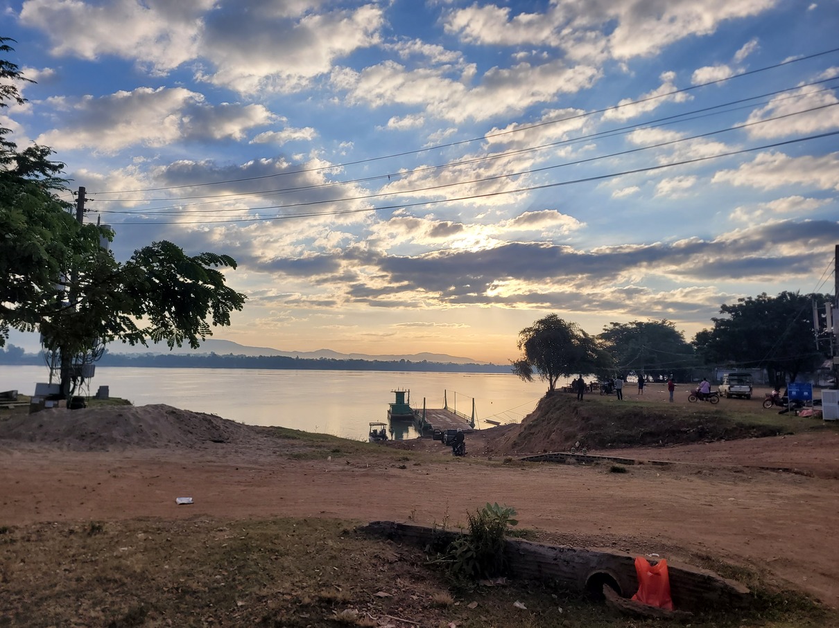 Trochę szkoda, bo tu nad Mekongiem jest naprawdę fajnie i chciałoby się widzieć którędy jedziemy, z drugiej strony miękkie światło wieczoru otula wszystko przepięknie.