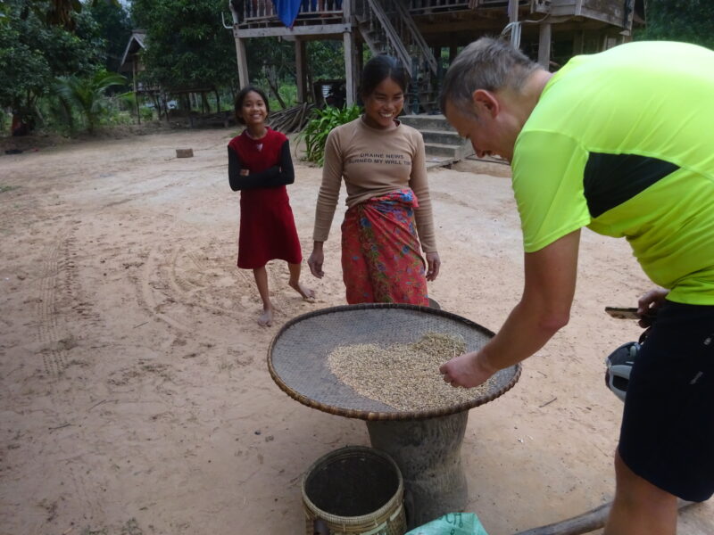 Trochę zmęczyła droga, ale cieszymy się, że ją wybraliśmy zamiast nudnej głównej. Dlatego też po spotkaniu z grupą w Ban Veunknen (miasteczku przy promie na Mekongu) zupełnie nie rozumiemy, dlaczego i oni mówią o jeździe drogą gruntową?