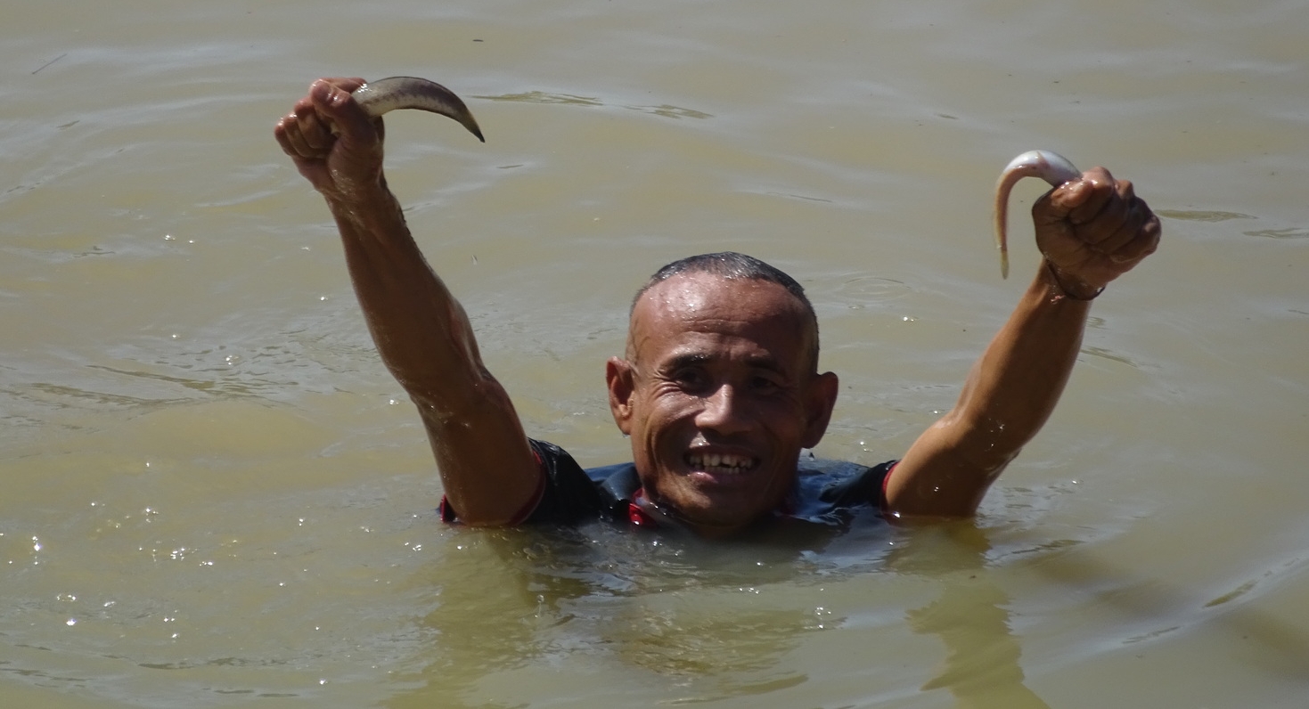widok radosnych ludzi, z sukcesem nurkujących w błotnistej wodzie, dla połowu ryb gołymi rękami: