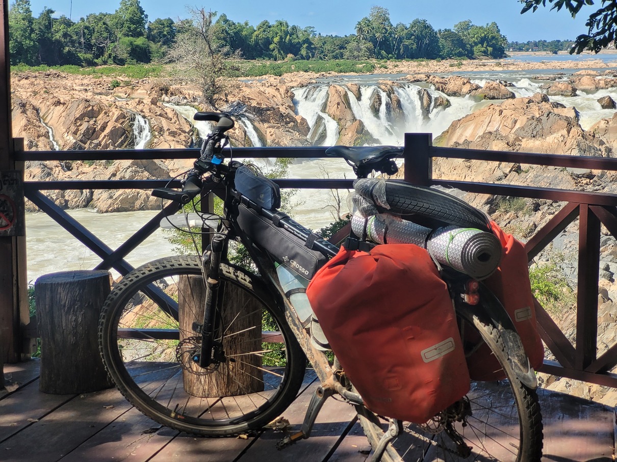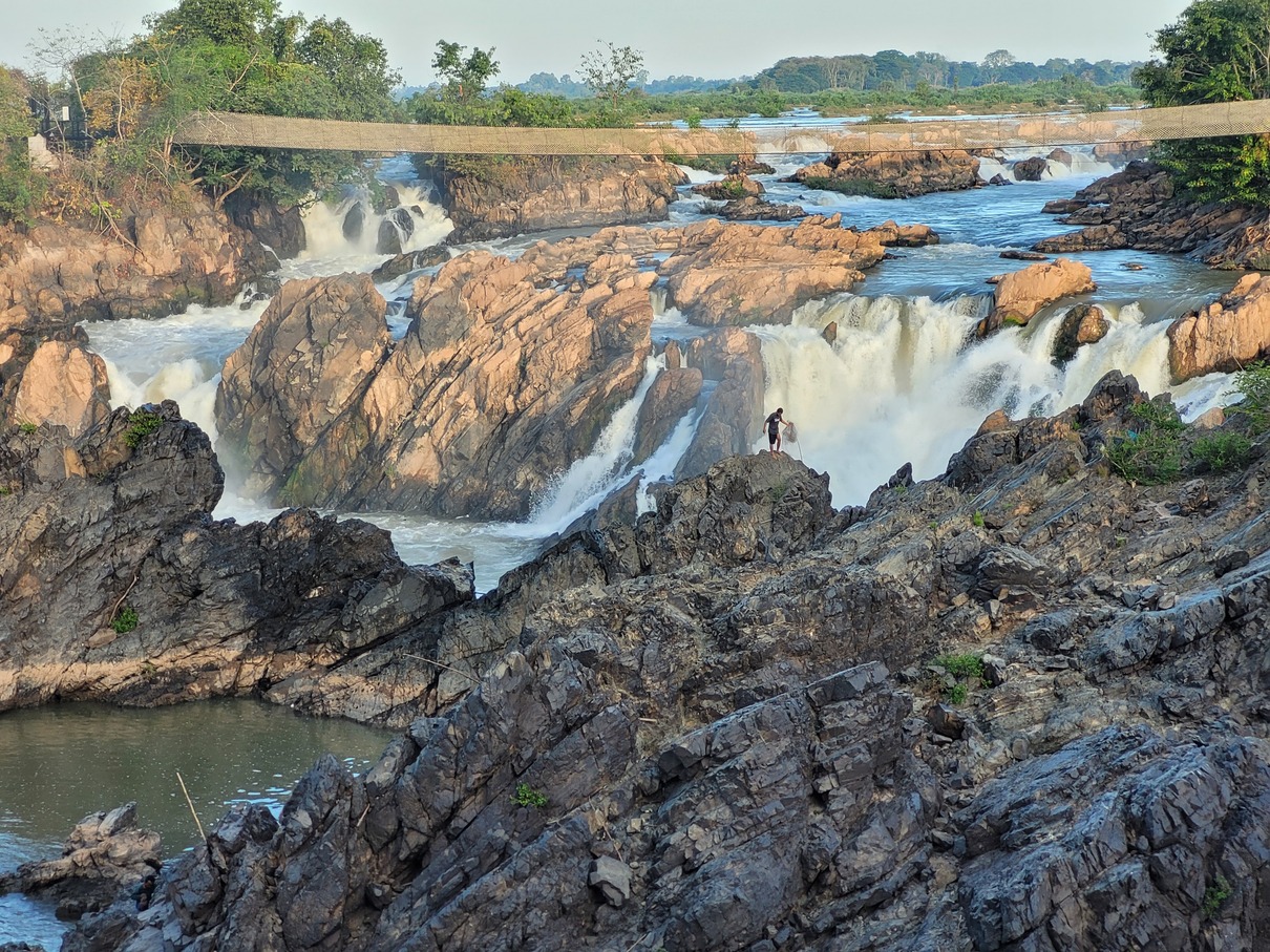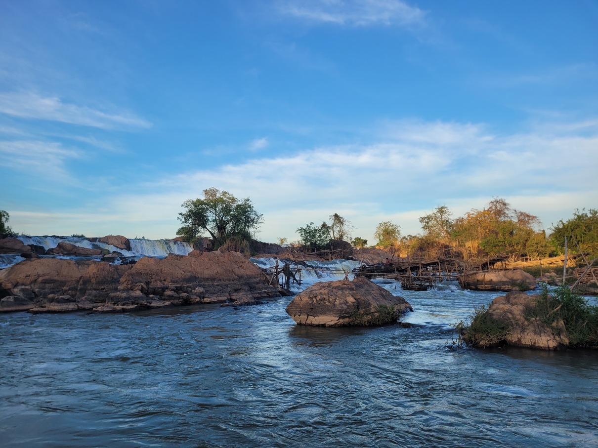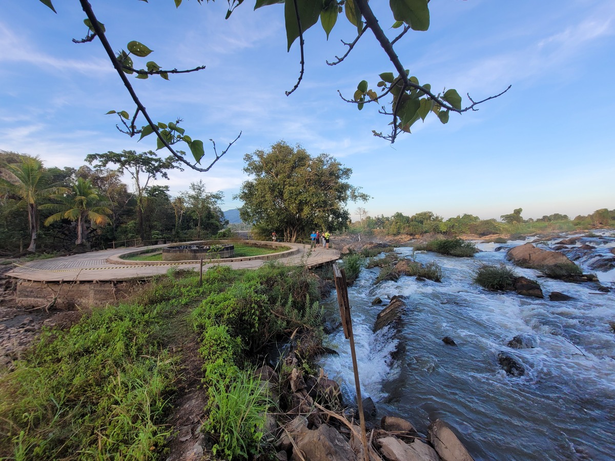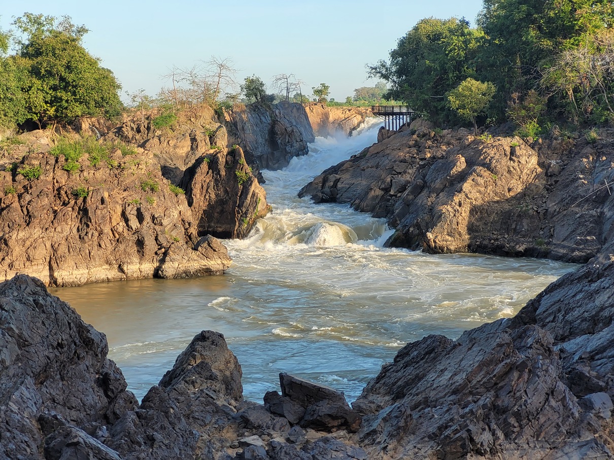 Wiem, że trzeba się spieszyć, żeby grupa nie musiała na mnie czekać przed granicą, ale i tak udaje zobaczyć ciekawe miejsce: kolejny wodospad na Mekongu (a raczej jednej z jego odnóg), koło niego spokojna teraz świątynia (choć widać, że bywają tu tłumy), a w pobliżu całkiem miła „plaża” nad rzeką, pozwalająca zrealizować zachciankę – kąpiel w czystym tu Mekongu.