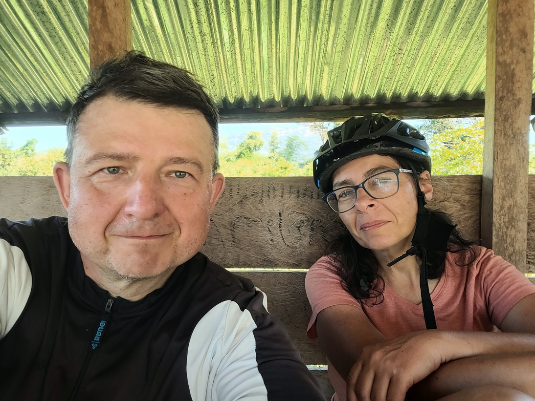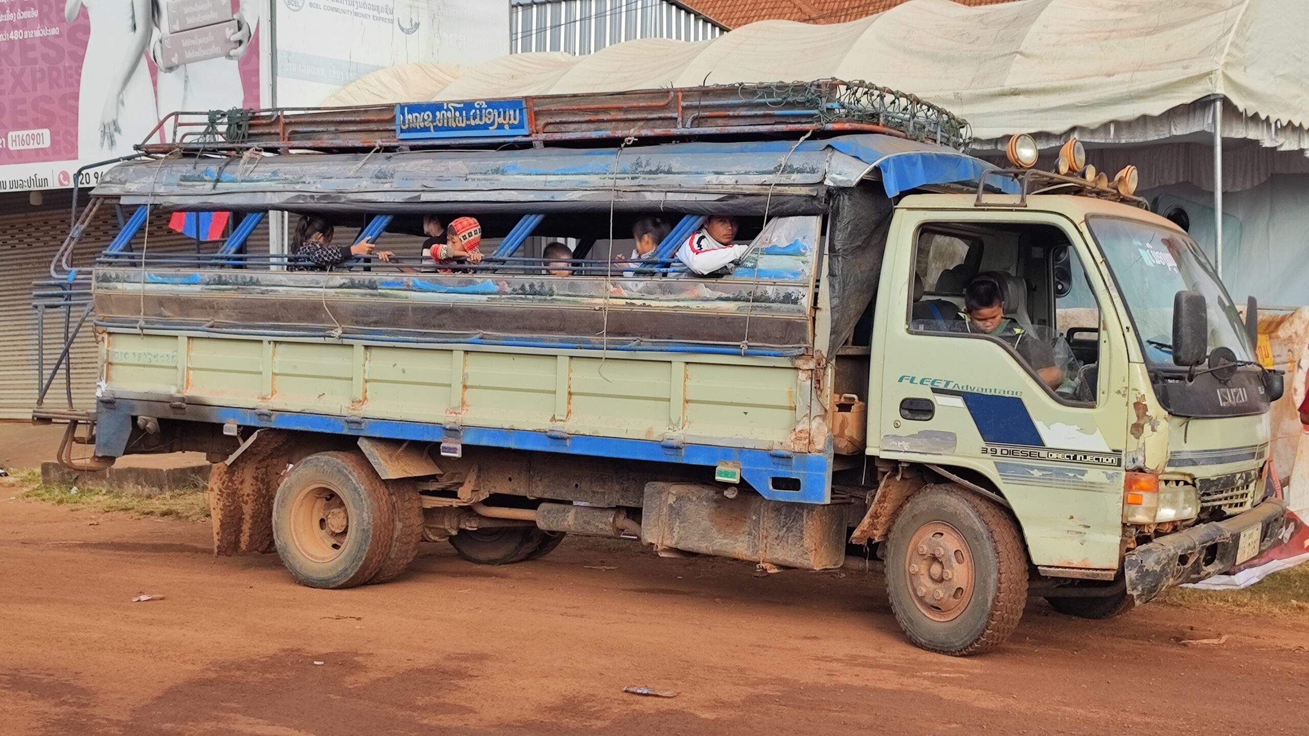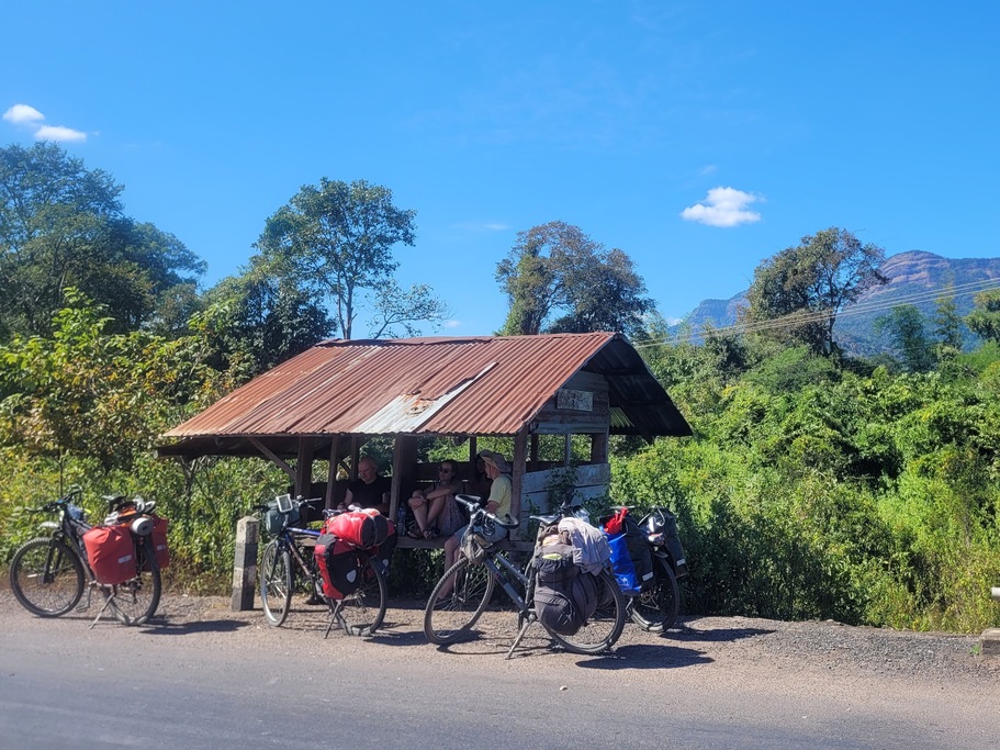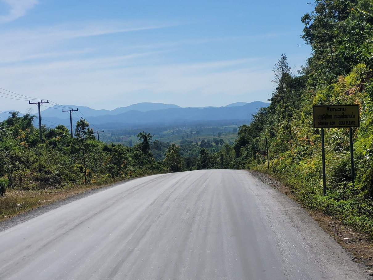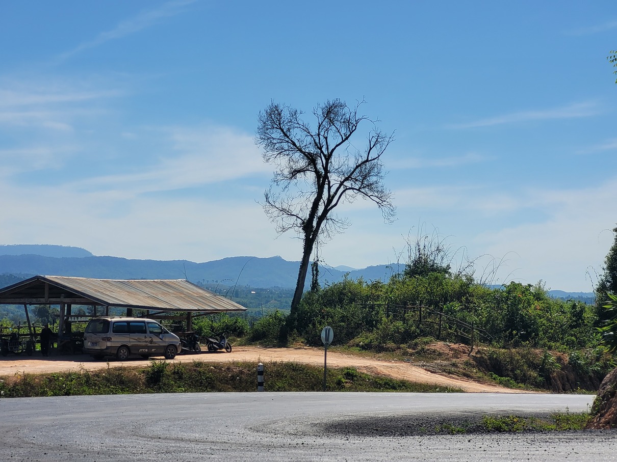 Nie ma sensu by się męczyła w upale na prostej drodze – próbujemy złapać dla niej jakiś transport. Wydaje się że klasycznego autostopu tu nie znają, ale gdy w końcu stawiamy jej rower do góry kołami, a kierowcy pokazujemy nie wzniesiony kciuk, ale „namaste” 🙏, to się zatrzymuje. Tłumaczymy jak potrafimy, że Ewe męczy żołądek, a jednocześnie rower wrzucamy na pakę. Trudno powiedzieć co zrozumieli, ale wpuszczają Ewe do kabiny, gdzie jest cała rodzina – włącznie z małym dzieckiem śpiącym z tyłu. Jakieś pieniądze (nieduże) za podwózkę wzięli, ale przede wszystkim to byli dobrzy, życzliwi ludzie. Podwieźli ją ze 30km, tak że spotkamy się z nią dopiero w Ban Nakasang, gdzie podsypiała w jakiejś kawiarni.
