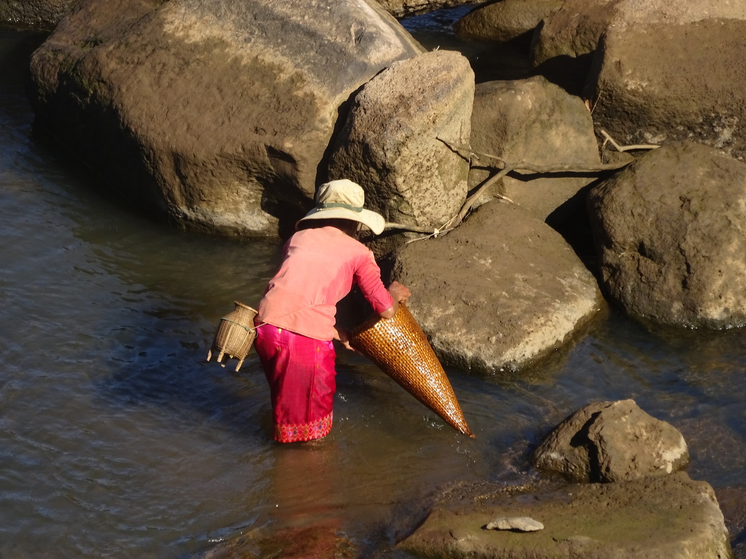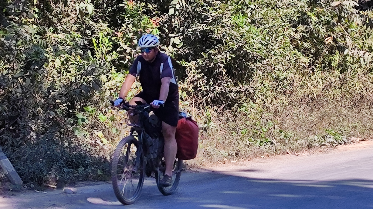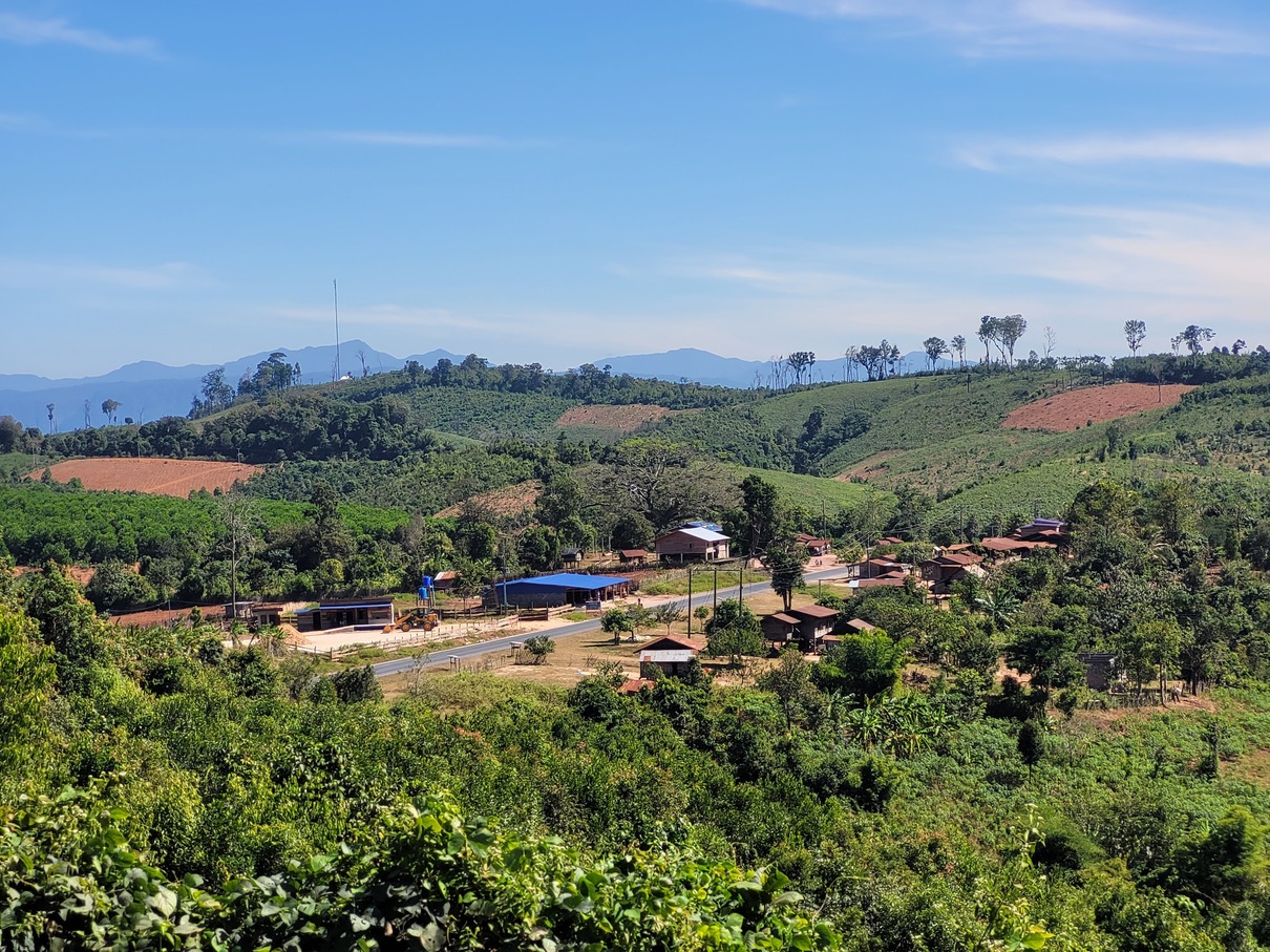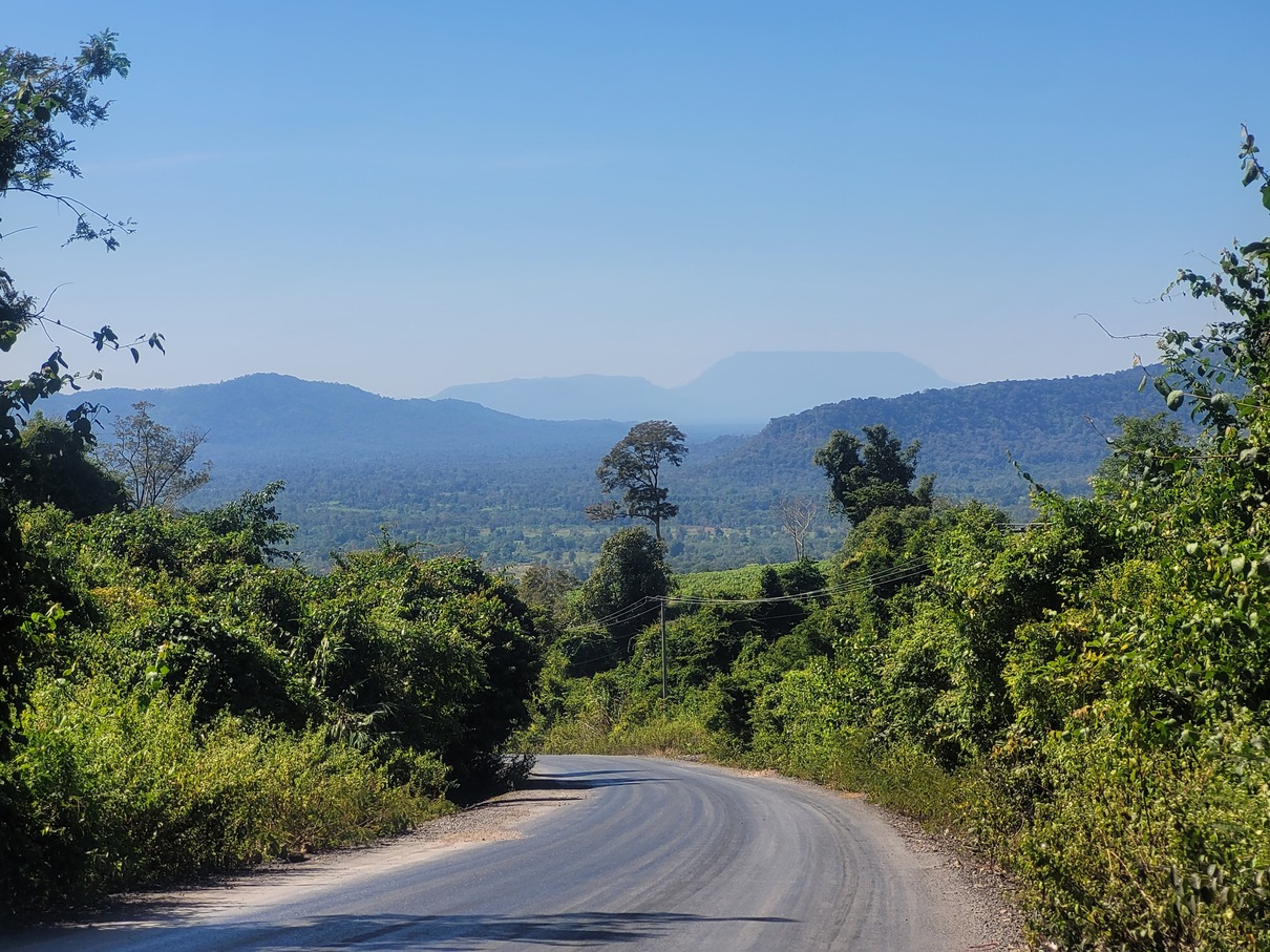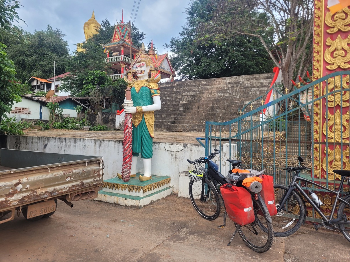 Nie ma sensu by się męczyła w upale na prostej drodze – próbujemy złapać dla niej jakiś transport. Wydaje się że klasycznego autostopu tu nie znają, ale gdy w końcu stawiamy jej rower do góry kołami, a kierowcy pokazujemy nie wzniesiony kciuk, ale „namaste” 🙏, to się zatrzymuje. Tłumaczymy jak potrafimy, że Ewe męczy żołądek, a jednocześnie rower wrzucamy na pakę. Trudno powiedzieć co zrozumieli, ale wpuszczają Ewe do kabiny, gdzie jest cała rodzina – włącznie z małym dzieckiem śpiącym z tyłu. Jakieś pieniądze (nieduże) za podwózkę wzięli, ale przede wszystkim to byli dobrzy, życzliwi ludzie. Podwieźli ją ze 30km, tak że spotkamy się z nią dopiero w Ban Nakasang, gdzie podsypiała w jakiejś kawiarni.