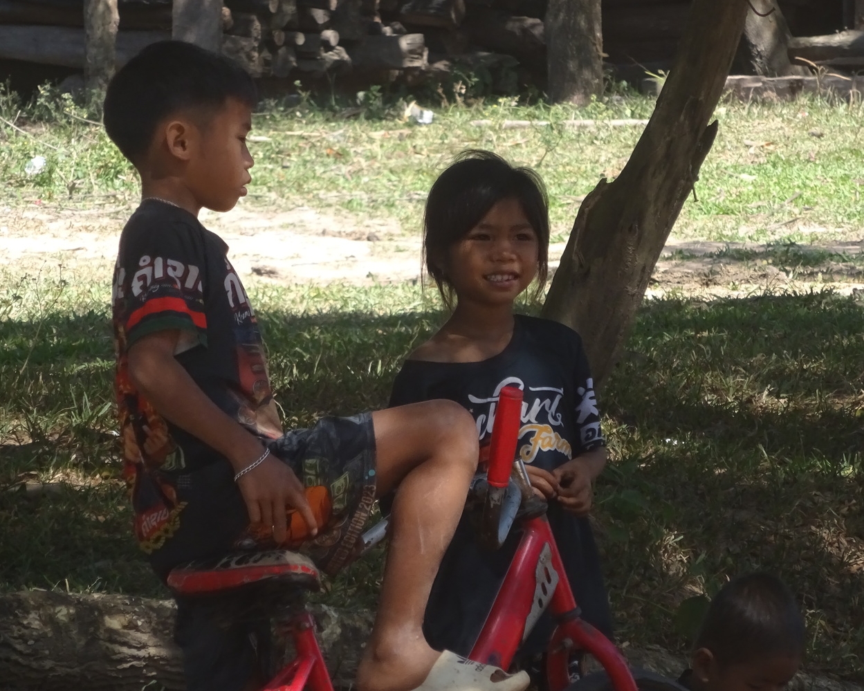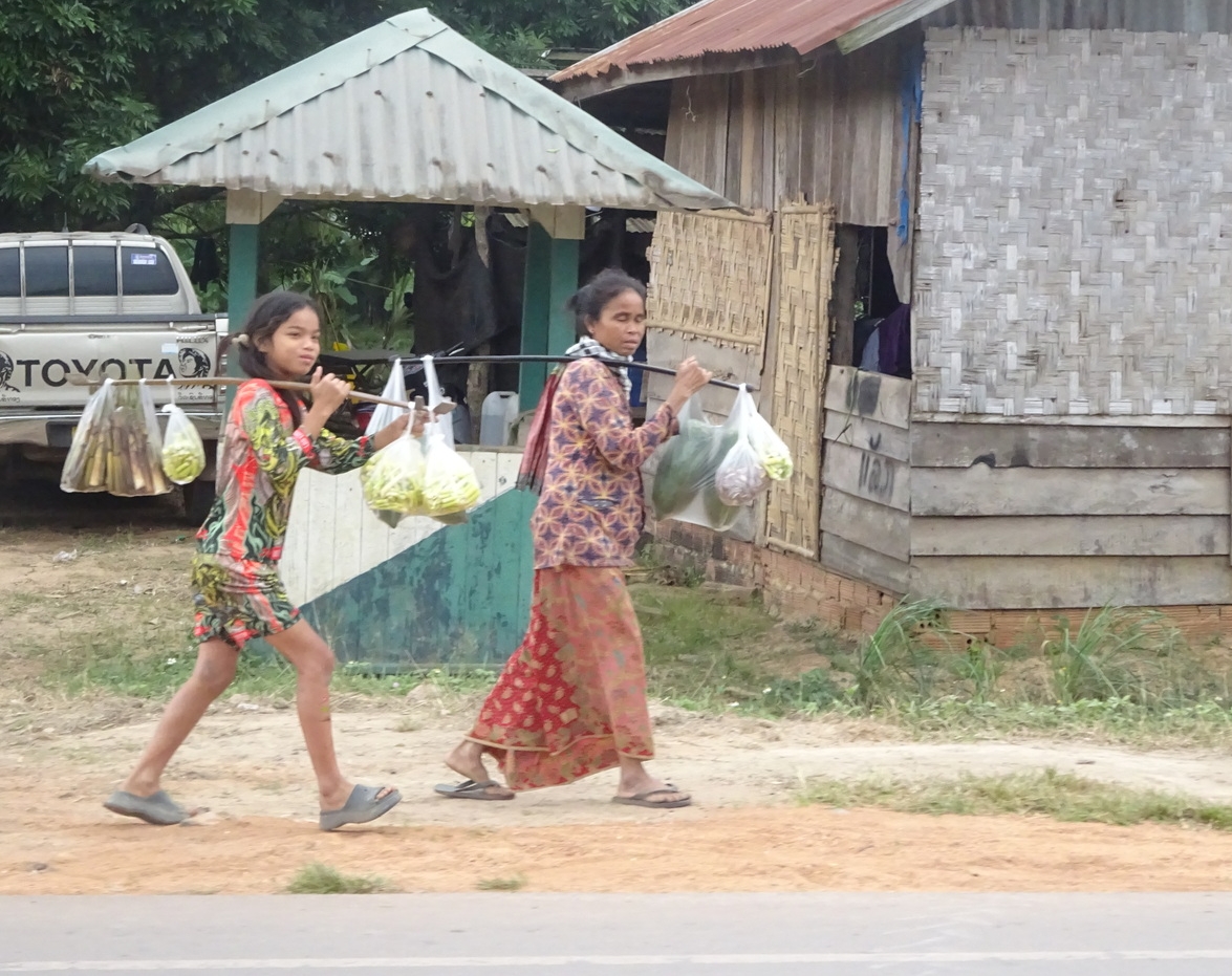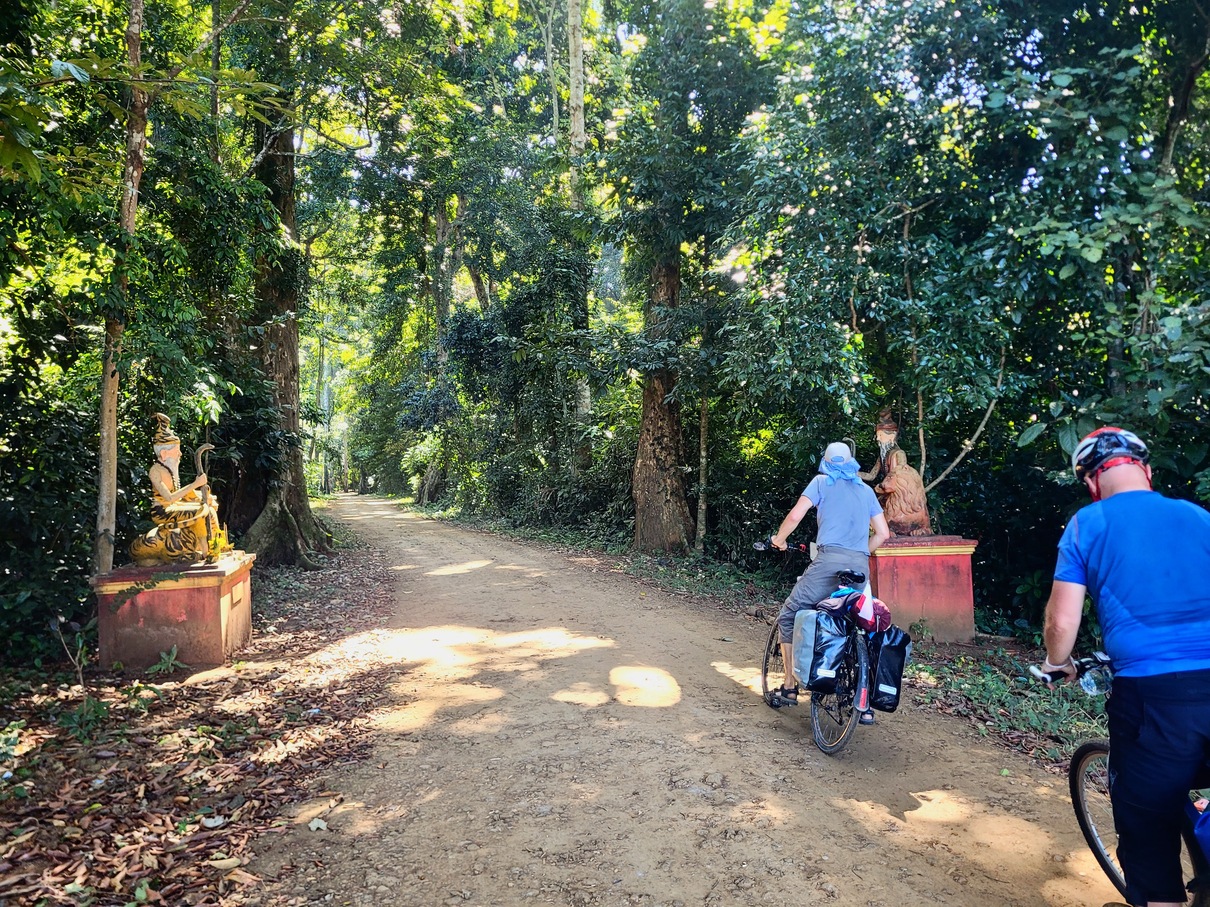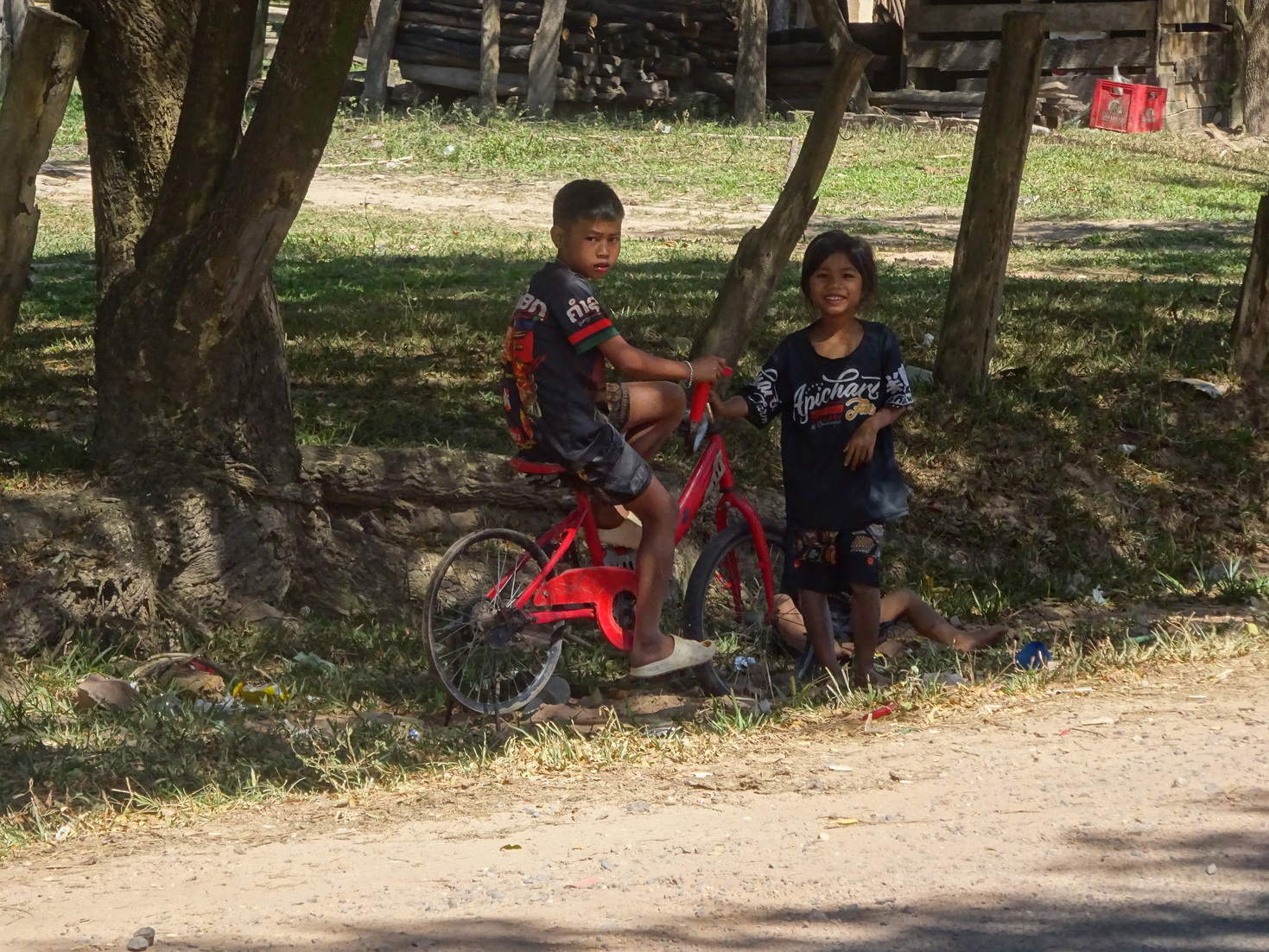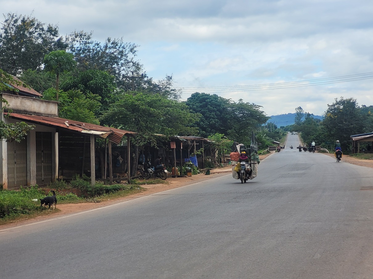 Po Vat Phou zostało jeszcze 70km – ciągniemy na południe, w stronę Kambodży, główną drogą. Trochę to marudne (marny asfalt), więc 30km dalej, w miasteczku gdzie jemy obiad, zastanawiamy się czy nie porzucić głównej dla drogi bocznej, prowadzącej nad samym Mekongiem. Nie jest to szczególnie rozsądne, bo koniec dnia blisko, czyli spora część z tych 40km drogą o nieznanej jakości będzie po ciemku. Więc choć korciło wielu, to ostatecznie ten nierozsądny wariant wybieram tylko ja oraz Adam z Patrycją.