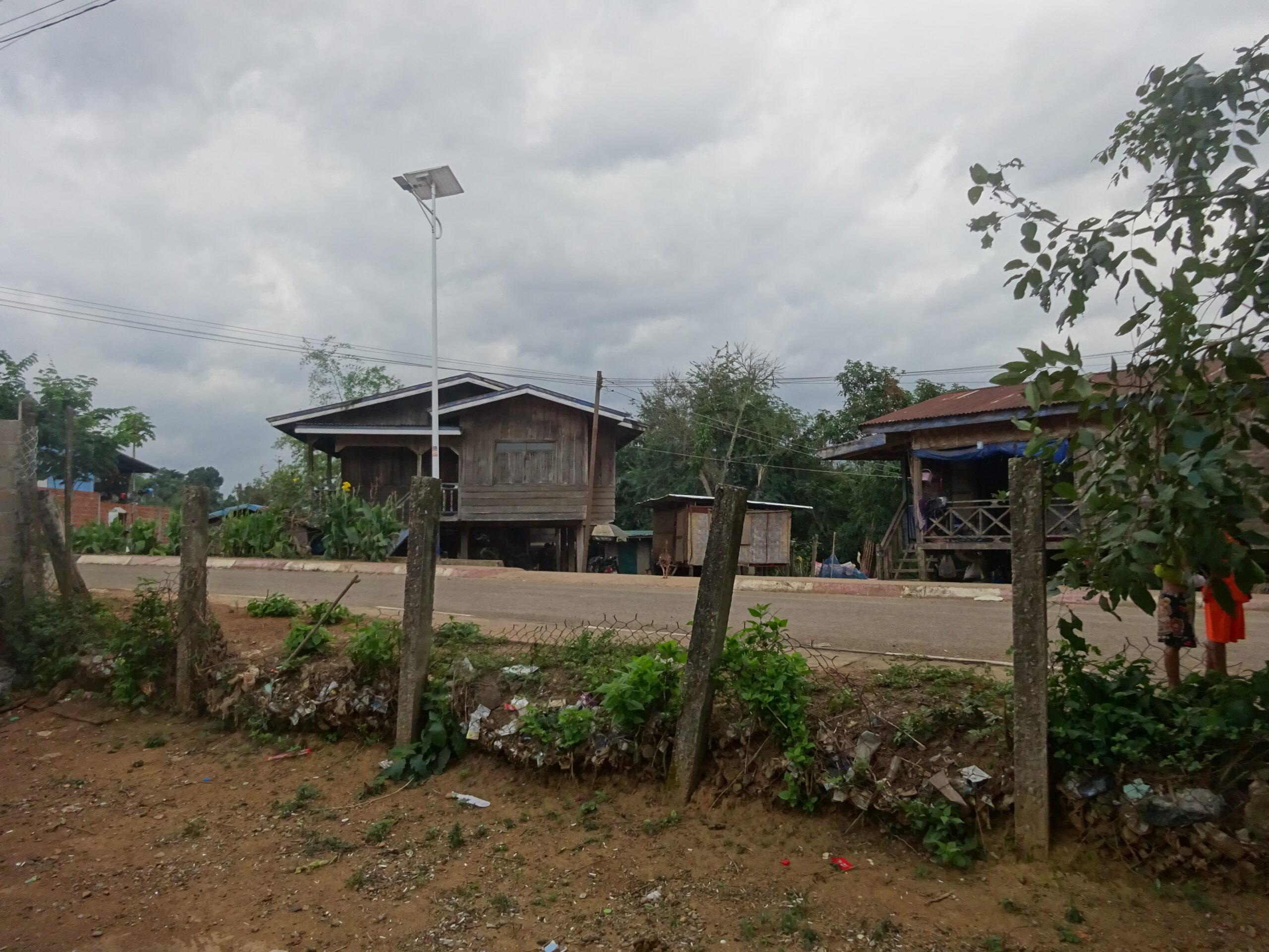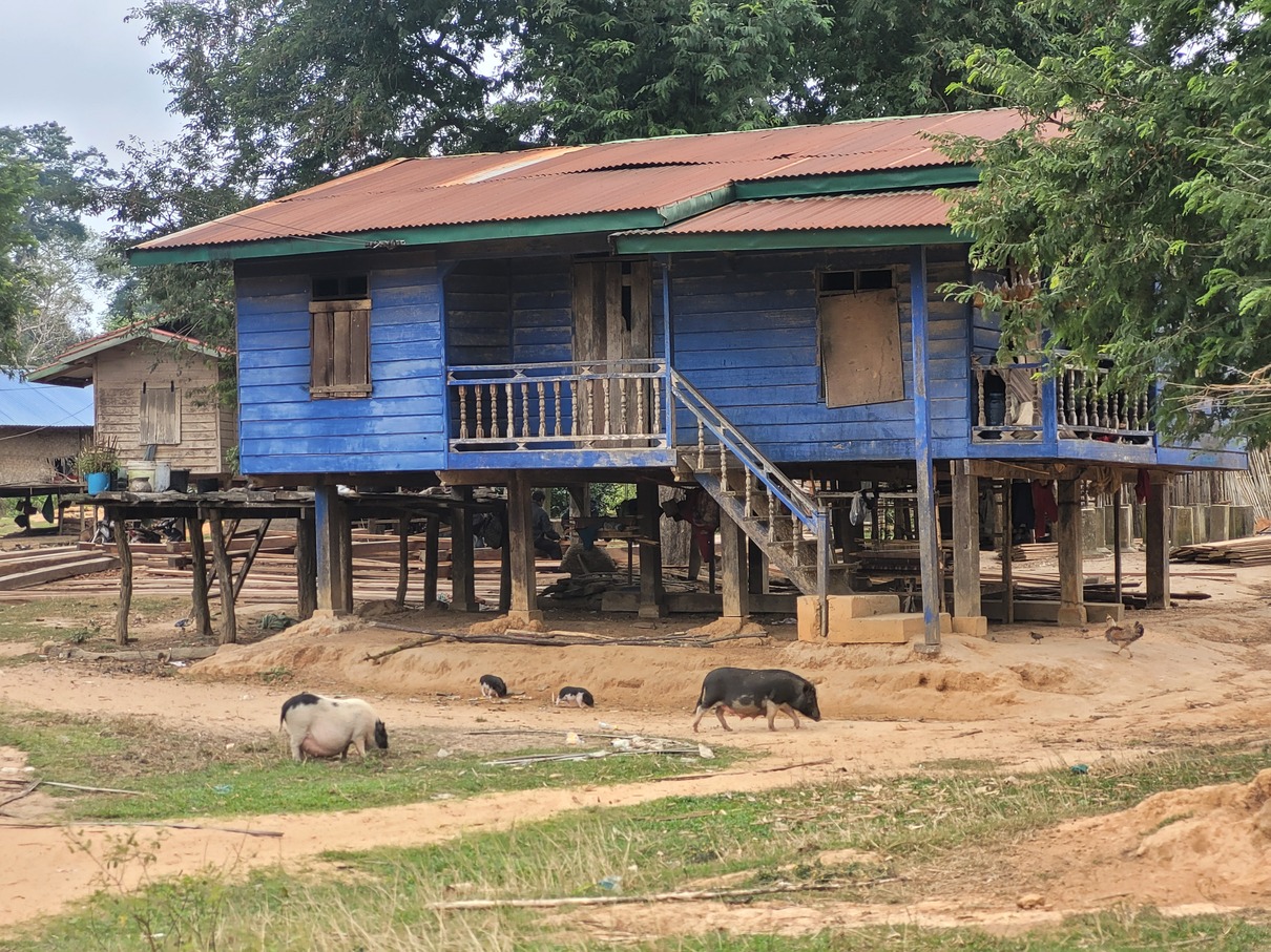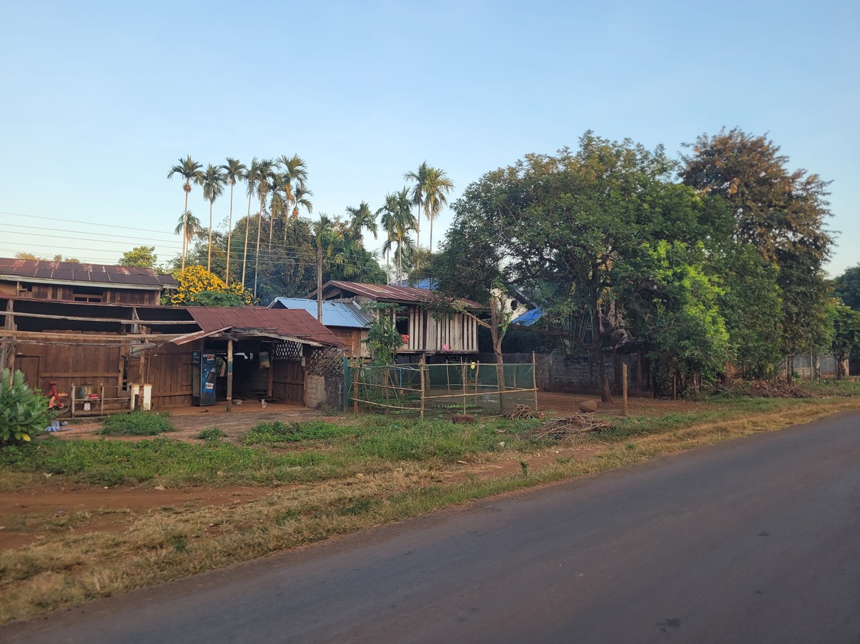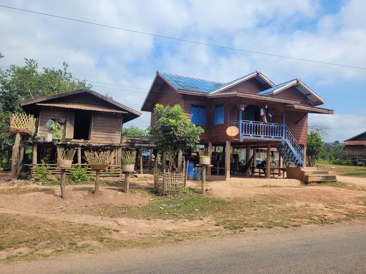 Tutaj wszystkie domy są na palach. Nawet jakieś proste schronienia/szałasy przy polach też są wyniesione. Nawet coś, co wygląda jak przystanek. Longin mówi że to dla ochrony przed wężami – czyli gdyby przyszło rozstawiać namiot, to trzeba by szukać właśnie takiego miejsca.